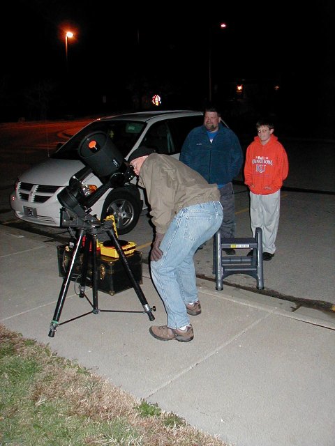 On Sunday evening of February 1, 2009 the Astronomy Associates of Lawrence held a public observing session at Prairie Park Nature Center. Rick Heschmeyer and David Kolb brought telescopes ranging in aperture from 5 inches to 8 inches. I had my vintage 8 inch Criterion Dynamax with a Watec 120N integrating video camera pointed at M42. The image of M42 on the TV screen was bright and showed a lot of faint detail, just like a picture out of a book . Rick had his 5 inch Celestron pointed at Venus and his 8 inch Celestron was pointed at the Moon. A couple of families and several Lawrence High students showed up despite the Super Bowl game that was playing that evening.