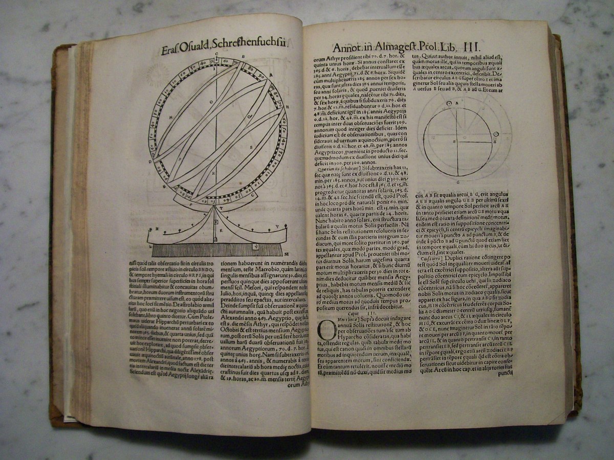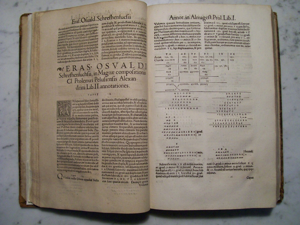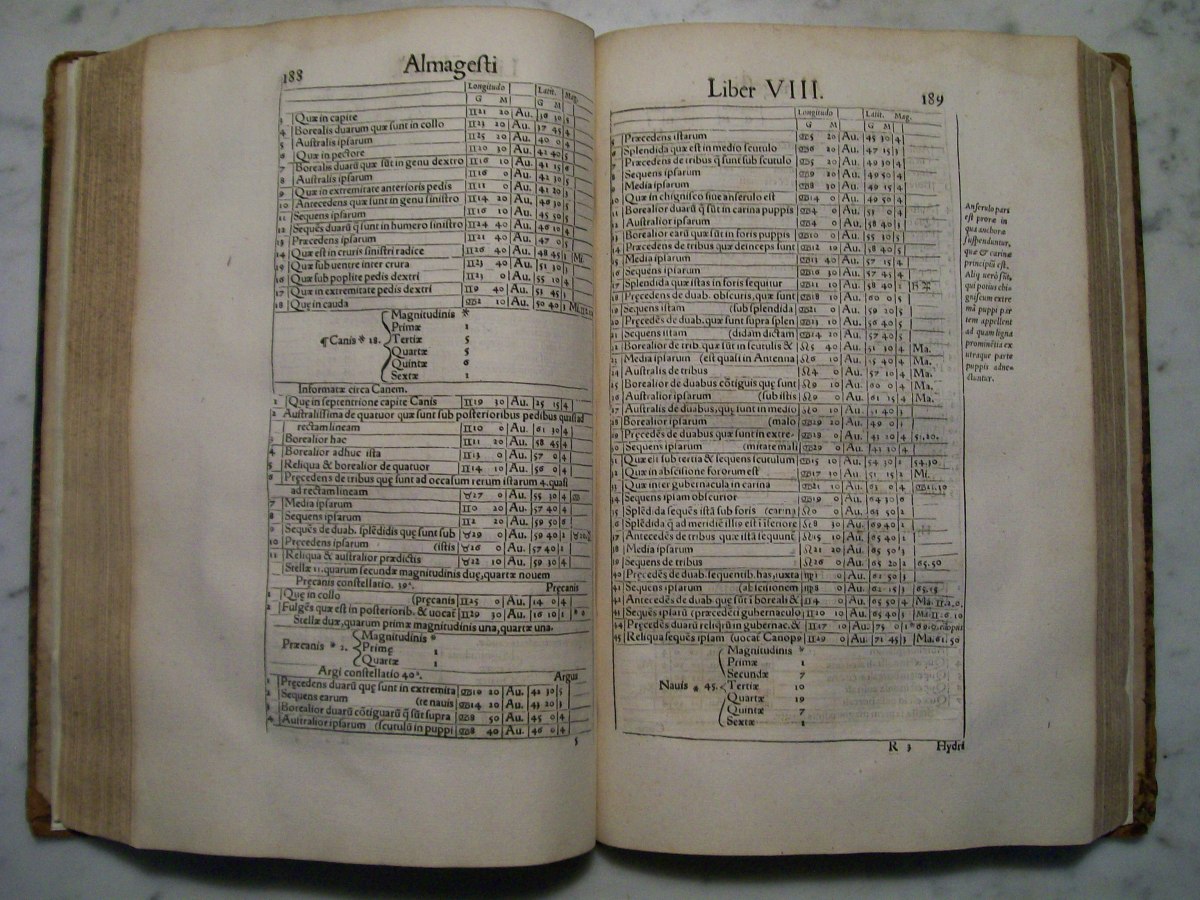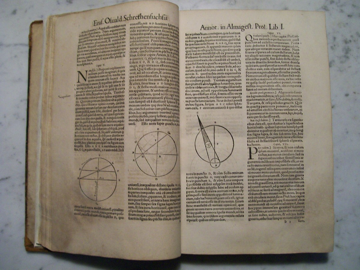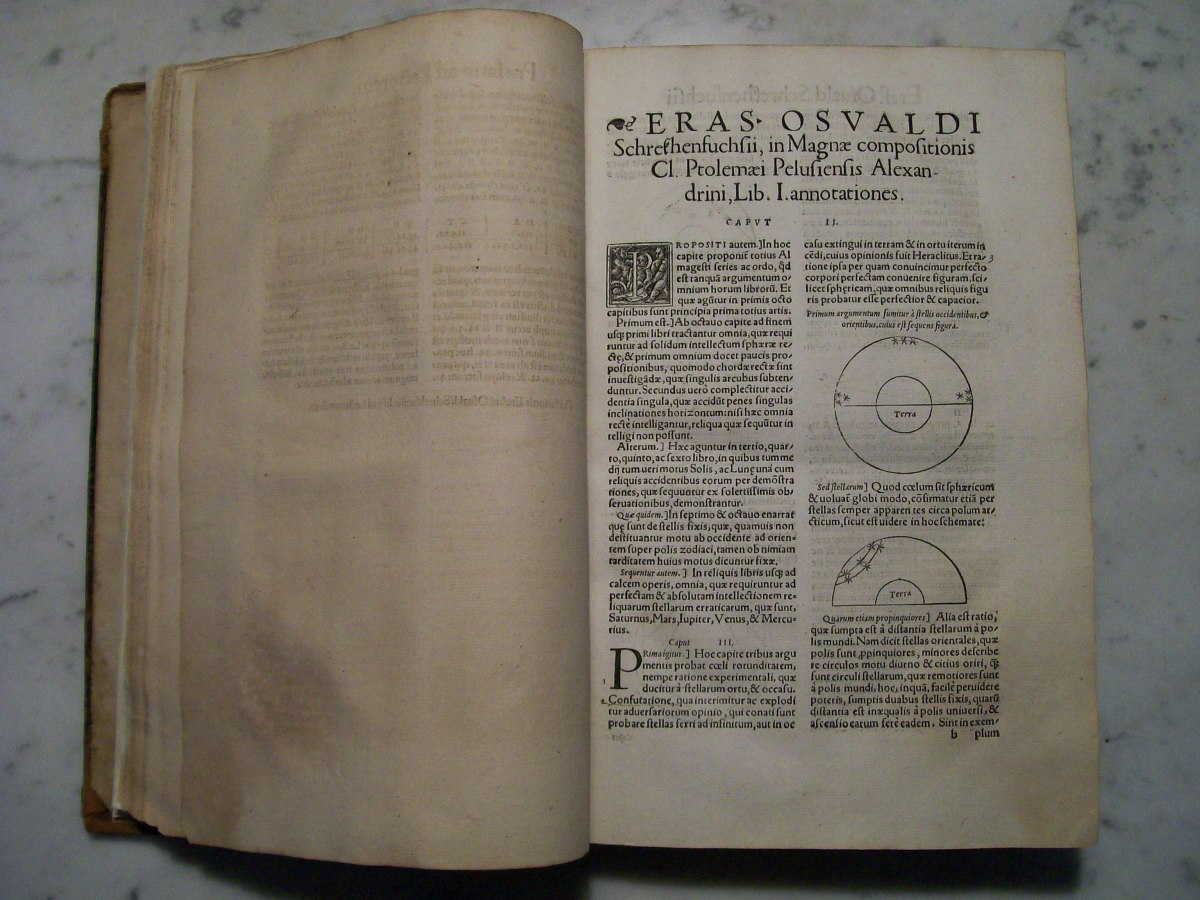 Claudius Ptolemy's the "Almagest", which was edited by Erasmus Oswald Schreckenfuchs. The first part of the book consists of commentary by Schreckenfuchs. In the first several pages of the "Almagest" there are hand written margin notes by a previous owner. The "Almagest" was written by Claudius Ptolemy in Alexandria, Egypt during the 2nd century AD. The "Almagest" summarizes Greek astronomy, which held that the Earth was the center of the Universe, and remained influential well into the Renaissance. It also contains a catalog 1022 stars presented in Book VII. The star catalog was based on observations made by the Greek astronomer Hipparchus.