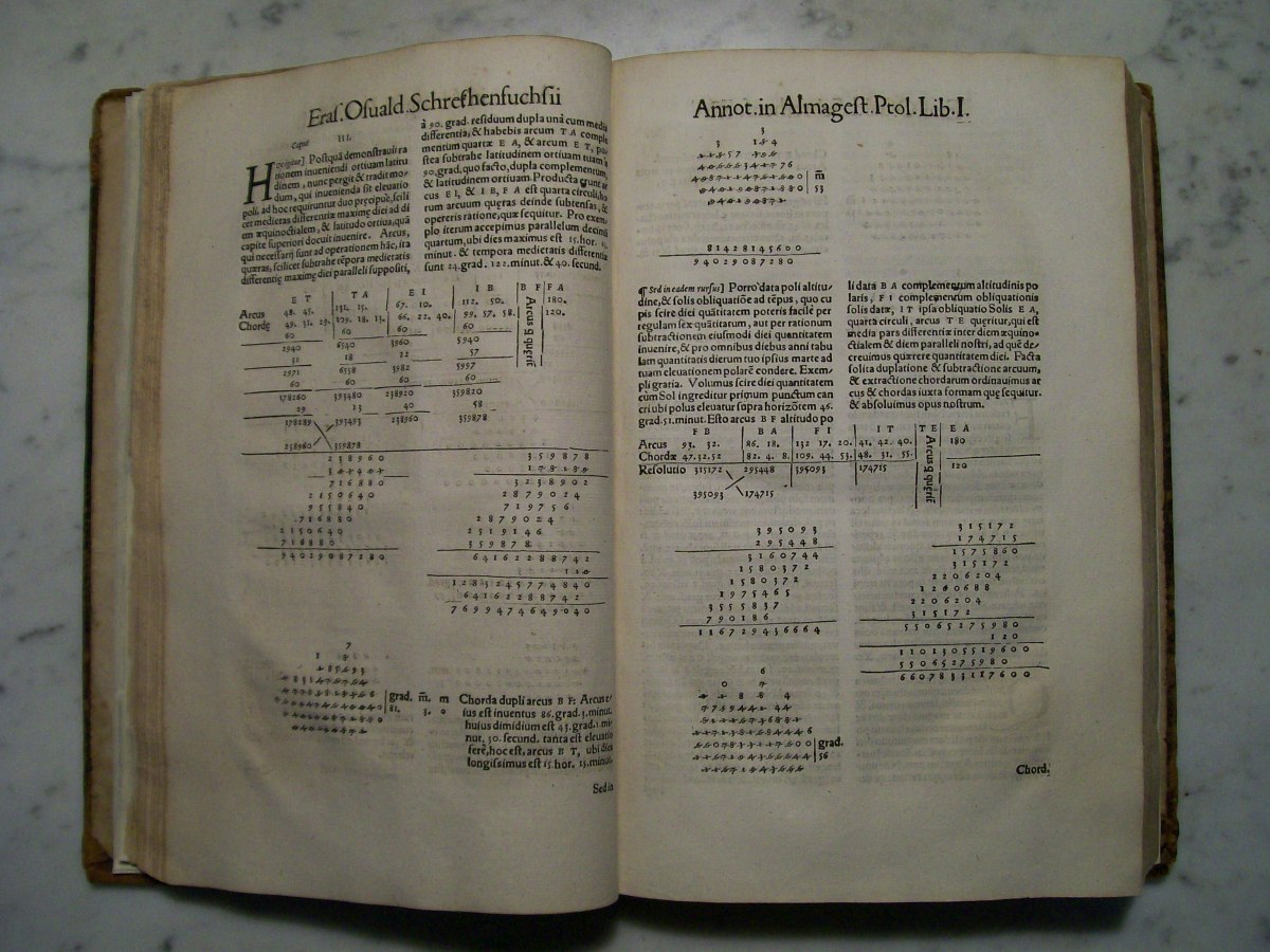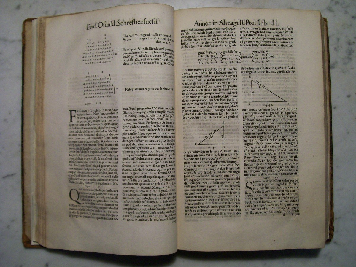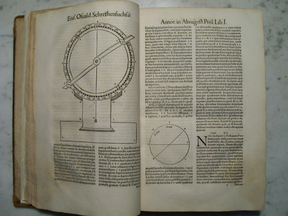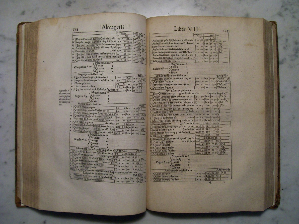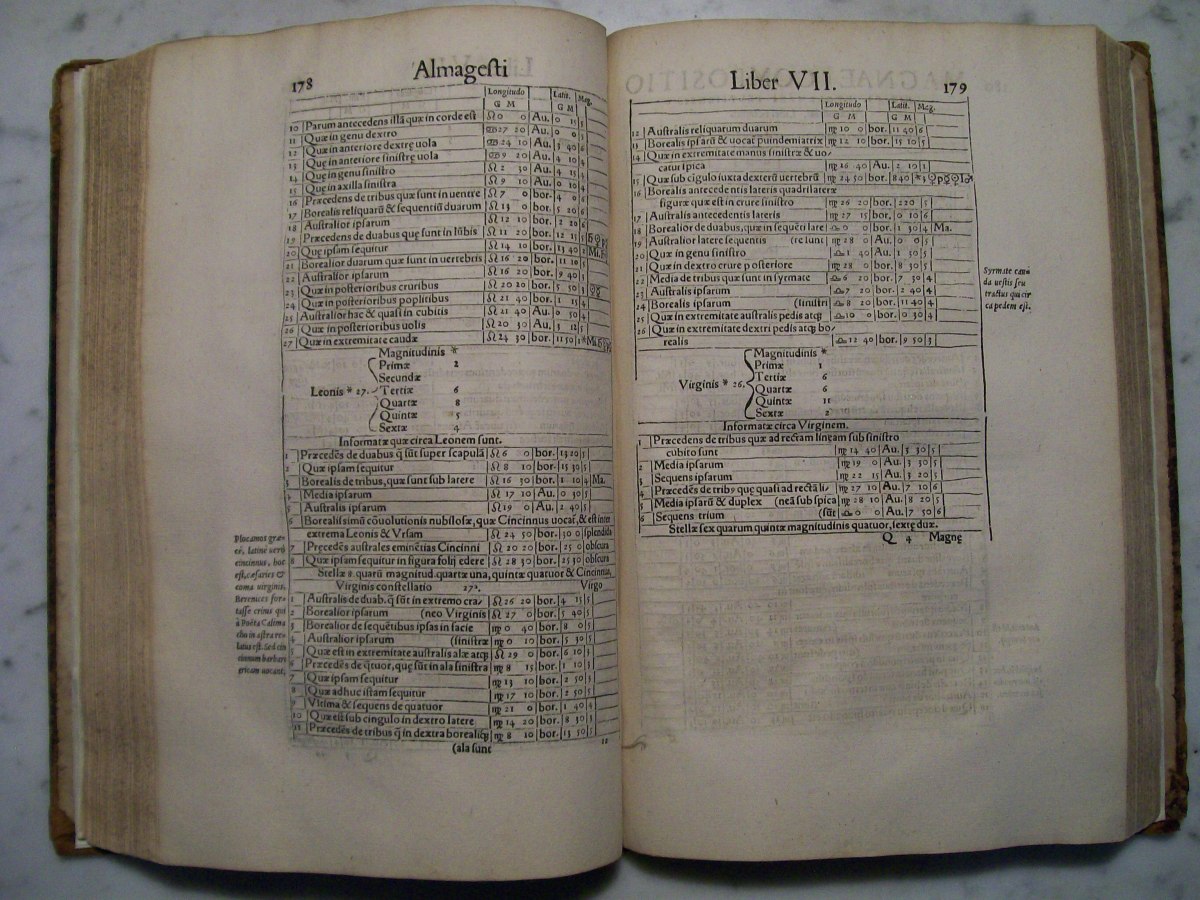 Claudius Ptolemy's the "Almagest", which was edited by Erasmus Oswald Schreckenfuchs. The first part of the book consists of commentary by Schreckenfuchs. In the first several pages of the "Almagest" there are hand written margin notes by a previous owner. The "Almagest" was written by Claudius Ptolemy in Alexandria, Egypt during the 2nd century AD. The "Almagest" summarizes Greek astronomy, which held that the Earth was the center of the Universe, and remained influential well into the Renaissance. It also contains a catalog 1022 stars presented in Book VII. The star catalog was based on observations made by the Greek astronomer Hipparchus.