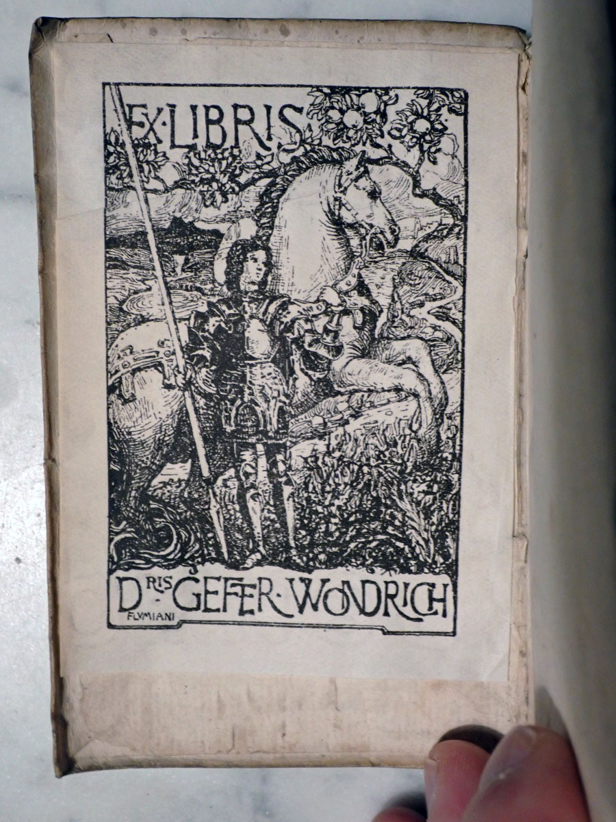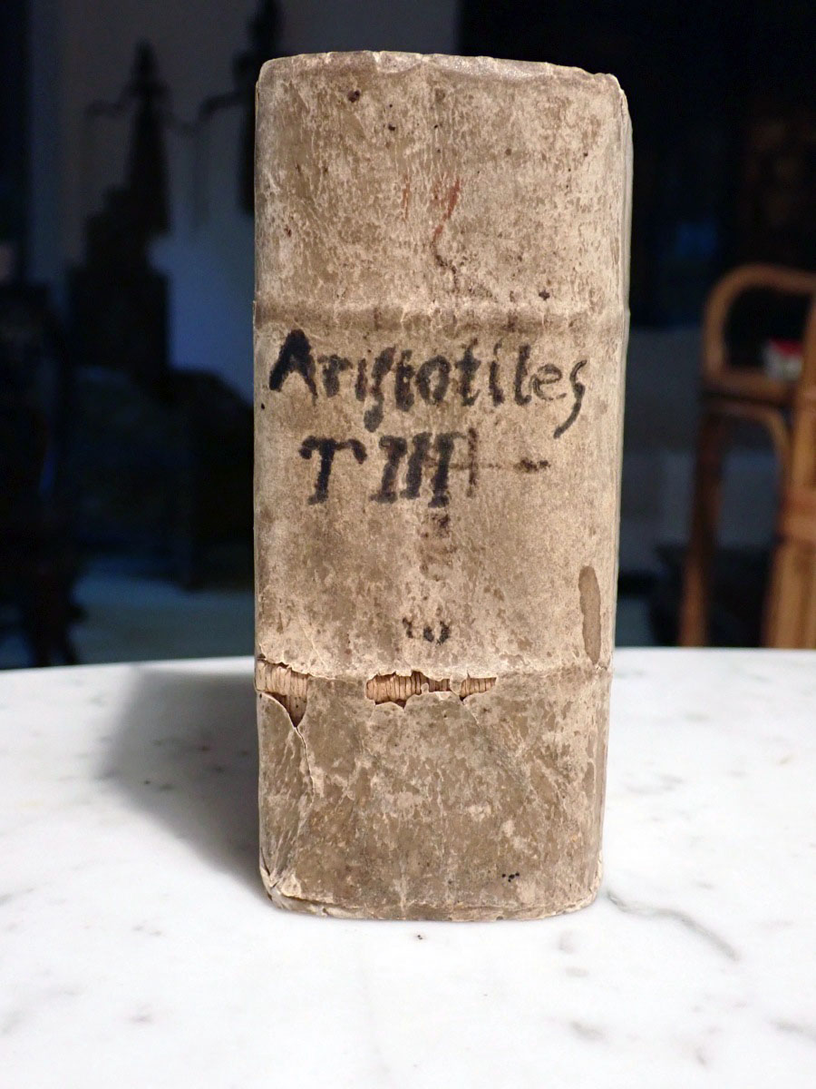 The bookplate on the front endpaper belonged to Gefter Wondrich (1875-1935) and was designed by the Italian artist Ugo Flumiani (1876-1938). Aristotle lived between 384 and 322 BC. The subjects of his writing include the topics of physics, biology, zoology, metaphysics, logic, ethics, aesthetics, poetry, theatre, music, rhetoric, psychology, linguistics, economics, politics, meteorology, geology, and government. His views on physics and astronomy were firmly held for over 1800 years until Galileo, Kepler, and Newton showed Aristotle's beliefs about physics and astronomy were be wrong.