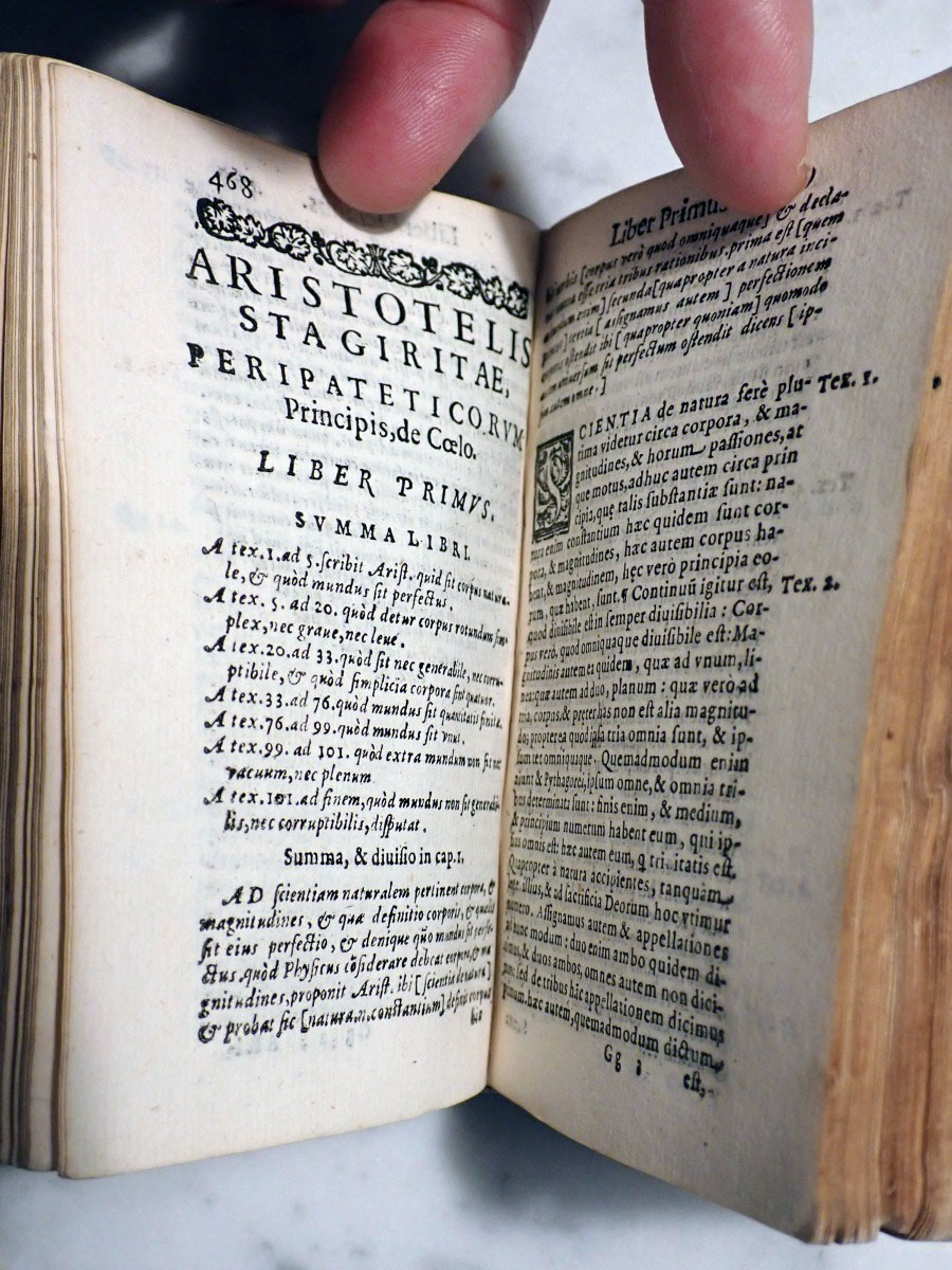 Here is a late 16th century volume that contains a number of Aristotle's works, published by Nicolaus Moretus in Venice in 1585, which includes his works on physics (Physicorum), astronomy (De Coelo) and meteorology (Meteorologicorum). Adding Aristotle's works on physics and astronomy to my library has been a goal of mine for some time now. The list of works in this volume is as follows.