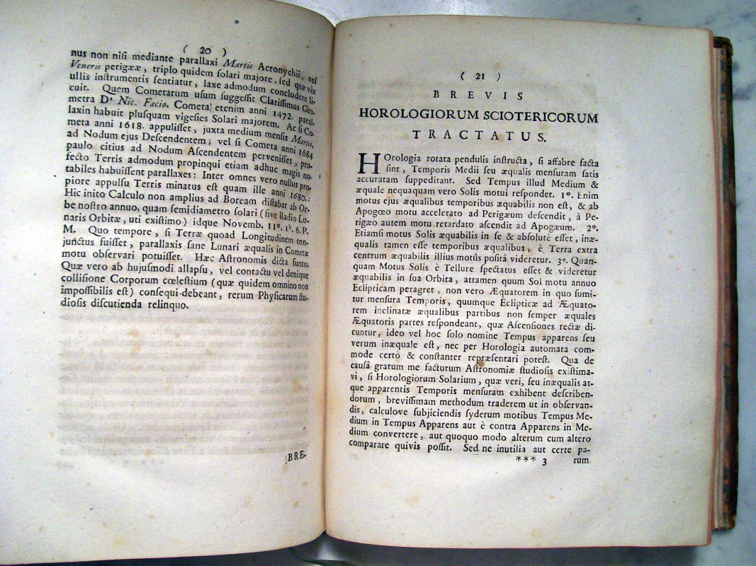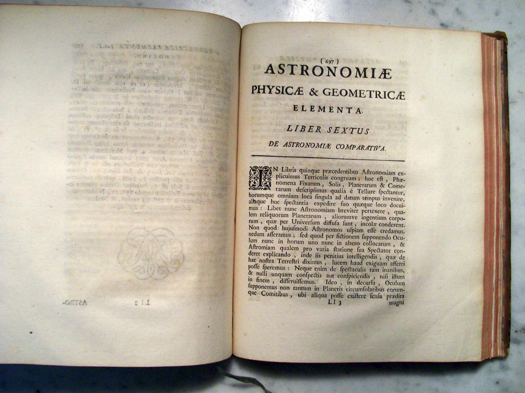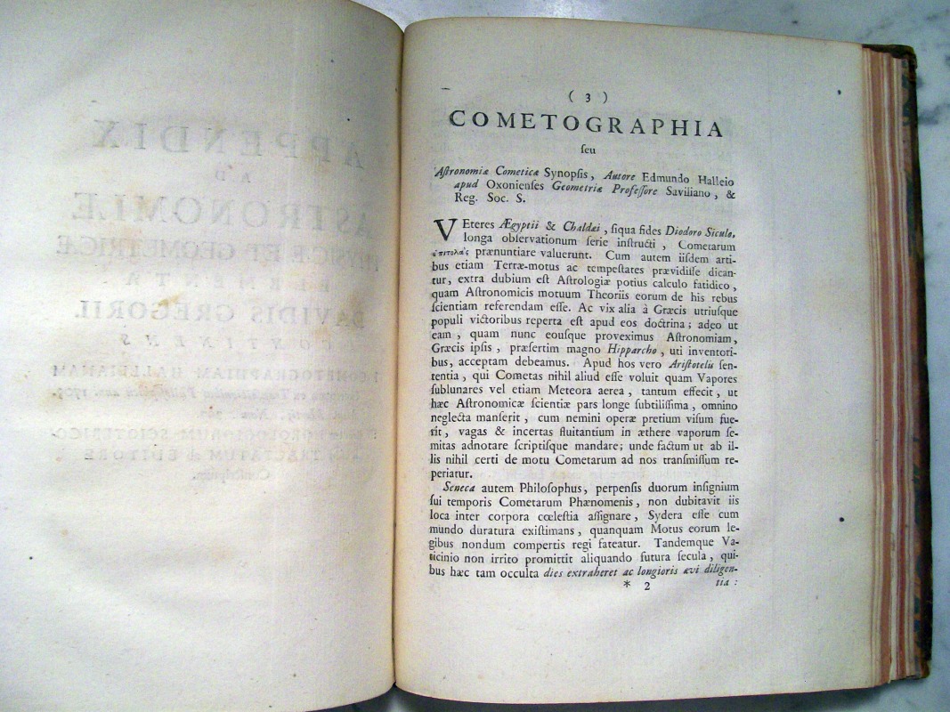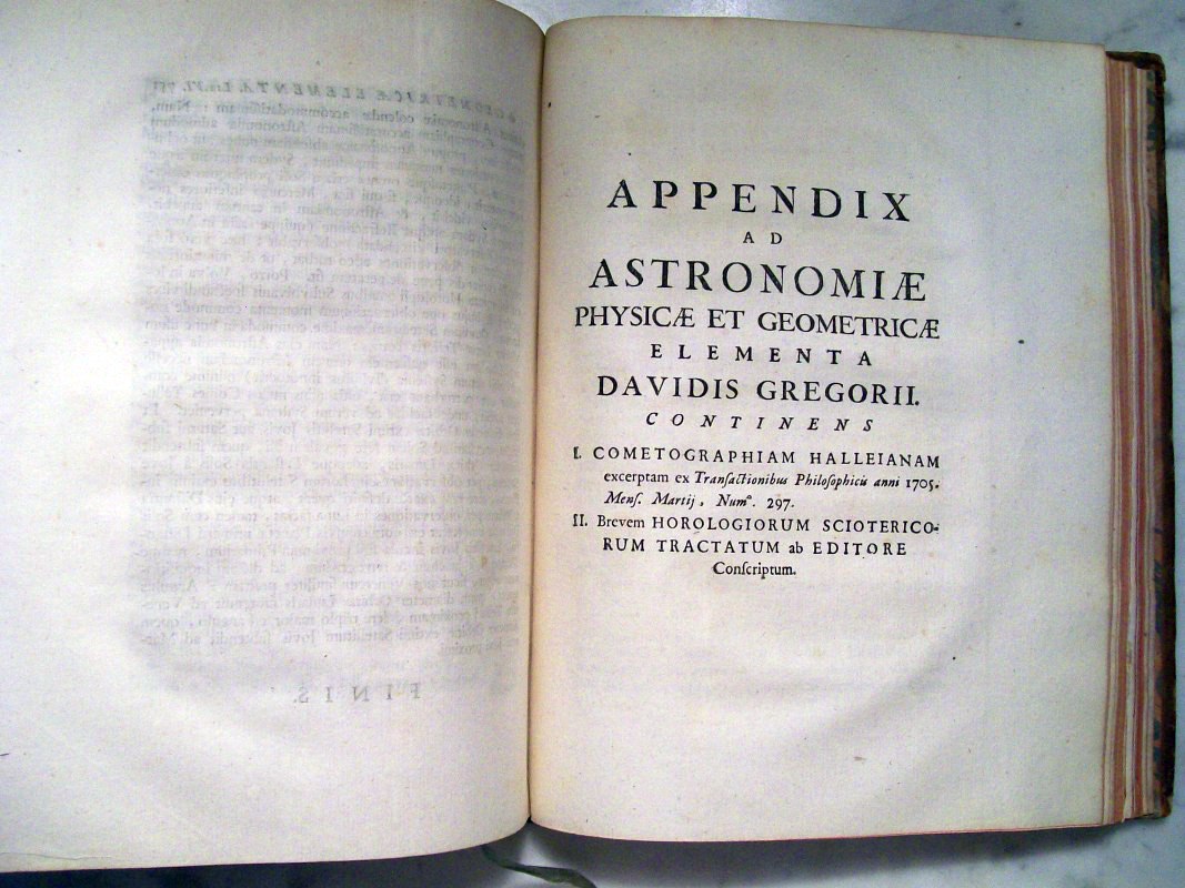 This was the first astronomy textbook based upon Newton's gravitational principles. The first edition was printed in 1702, while this second edition was posthumously published in 1726. This volume covers topics of astronomy, mathematics and gnomonics, and is illustrated with 48 folding plates. The lengthy preface is a copy of Newton's "Classical Scholia", but Gregory nowhere mentions it as belonging to Newton. As an appendix, the first reprint of Edmund Halley's "Astronomiae Cometicae Synopsis" is included where Halley discusses the periodicity of the comet that now bears his name.