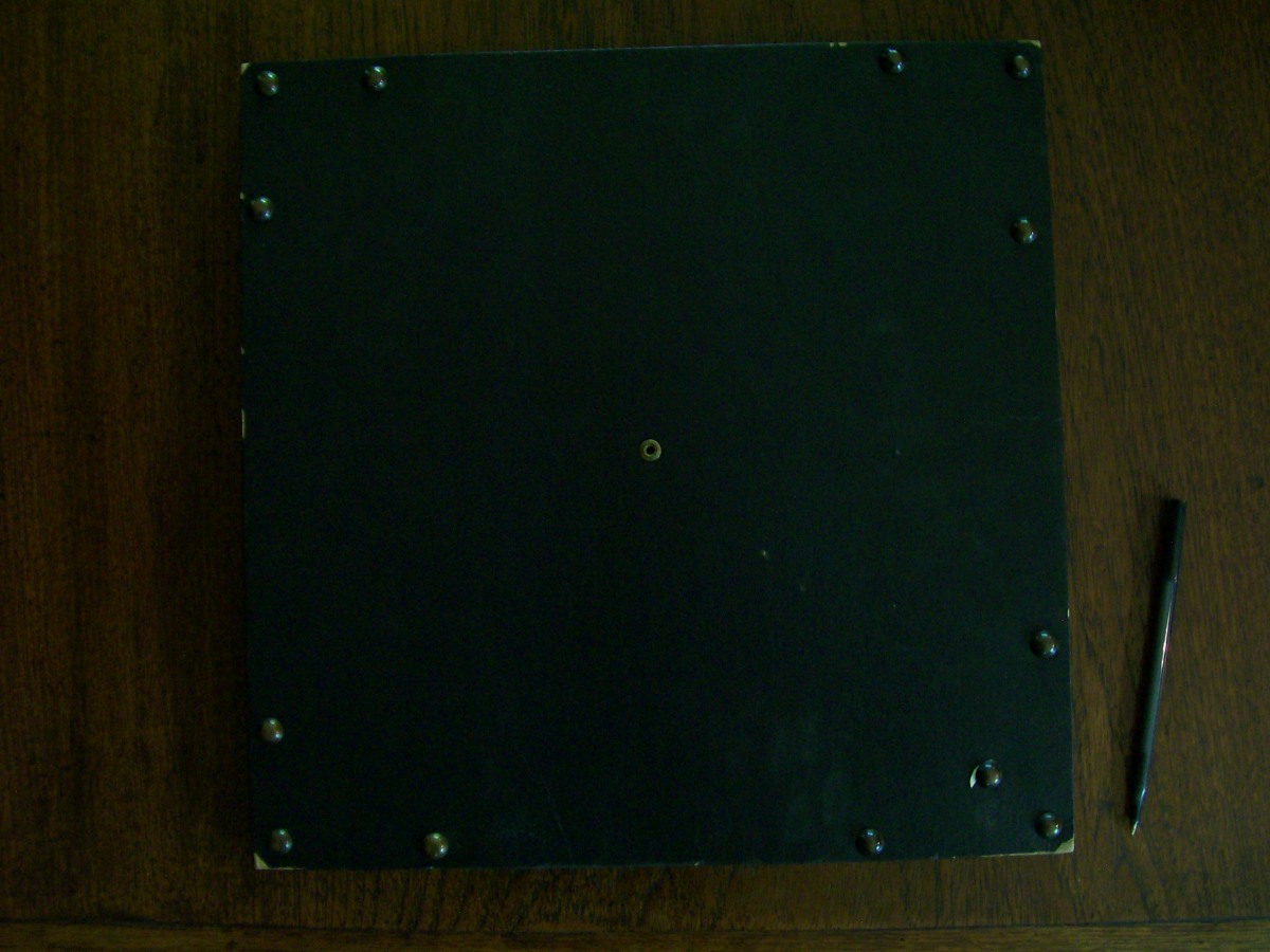 This is the star finder by Barritt-Serviss made sometime after 1906 (there is a copyright of 1906 on the bottom edge). These star finders were apparently made up through the 1960s. Since I don't have the booklet that came with the finder I can't determine its age. The blue colored detailing on the finder hints to a later production around 1955 or later. I had never actually seen one of these star finders in person and I was surprised by the size of it. It has brass thumb tacks that cover the front and back. It appears that some of the thumb tacks might have been replaced on this star finder. According to Peter Grimwood's "Card Planispheres - A collectors Guide" the brass thumb tacks that were used did vary somewhat over the years and I have seen pictures of other examples that had thumb tacks similar to mine. I placed a pen next to the star finder for scale. It is about 15 inches by 15 inches in size, about 1/2 inch thick, and made from 1/8 inch fiber board with a string to represent the observers meridian.