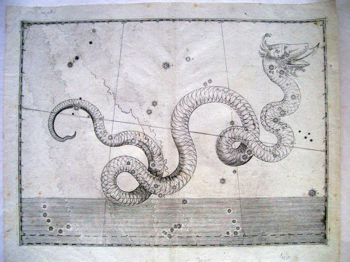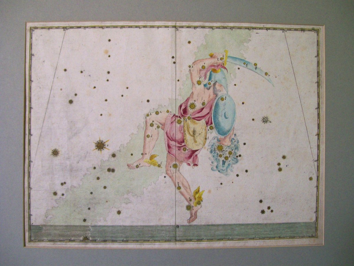 Three prints (Corona, Perseus, Corvus) from the 1661 edition of Uranometria by Johann Bayer. These prints are from the 1661 edition rather than the 1603 edition because there is no text printed on the backs of the prints. These prints were acquired through Sworders Auctions in the UK. I purchased a total of five prints. One of the prints that was attributed to Bayer was actually from John Bevis' atlas Uranometria Britannica. The Serpens print came from the 1624 edition and was purchased through Old World Auctions.