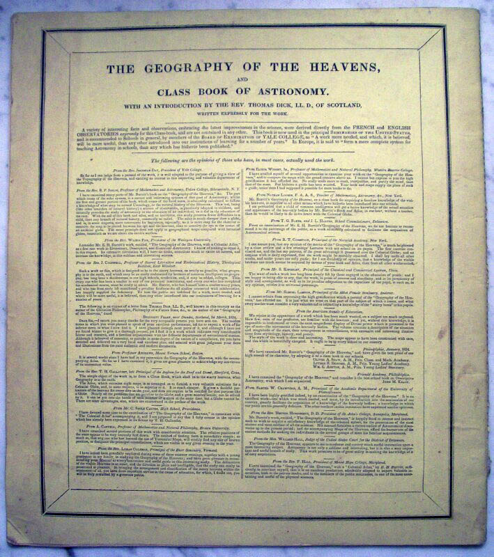 1835 edition of atlas intended to accompany "Burritt's Geography of the Heavens". This is the third edition of Burrit's atlas. This atlas is in very fine condition.