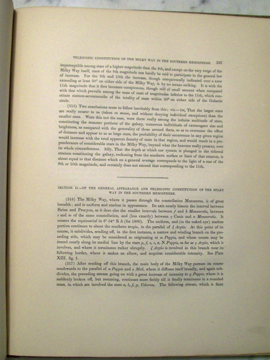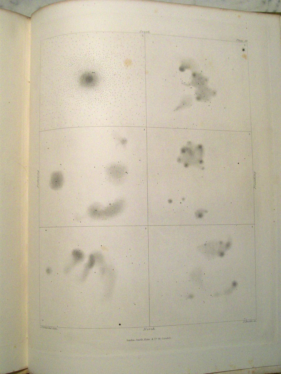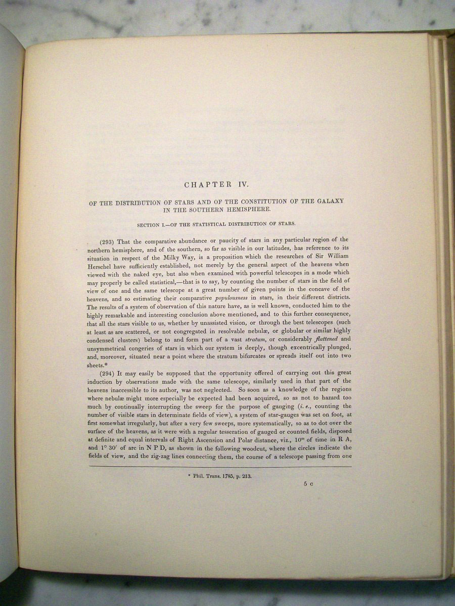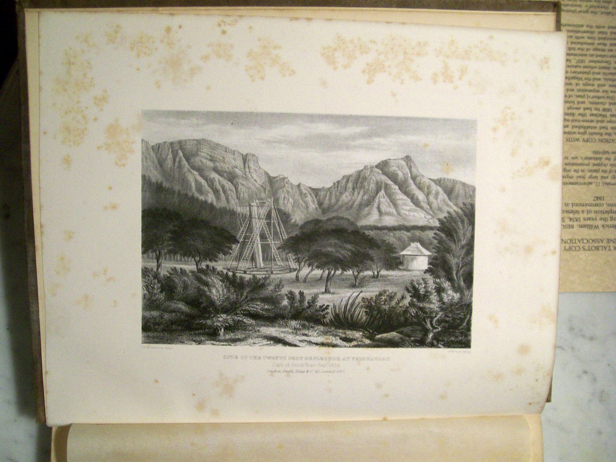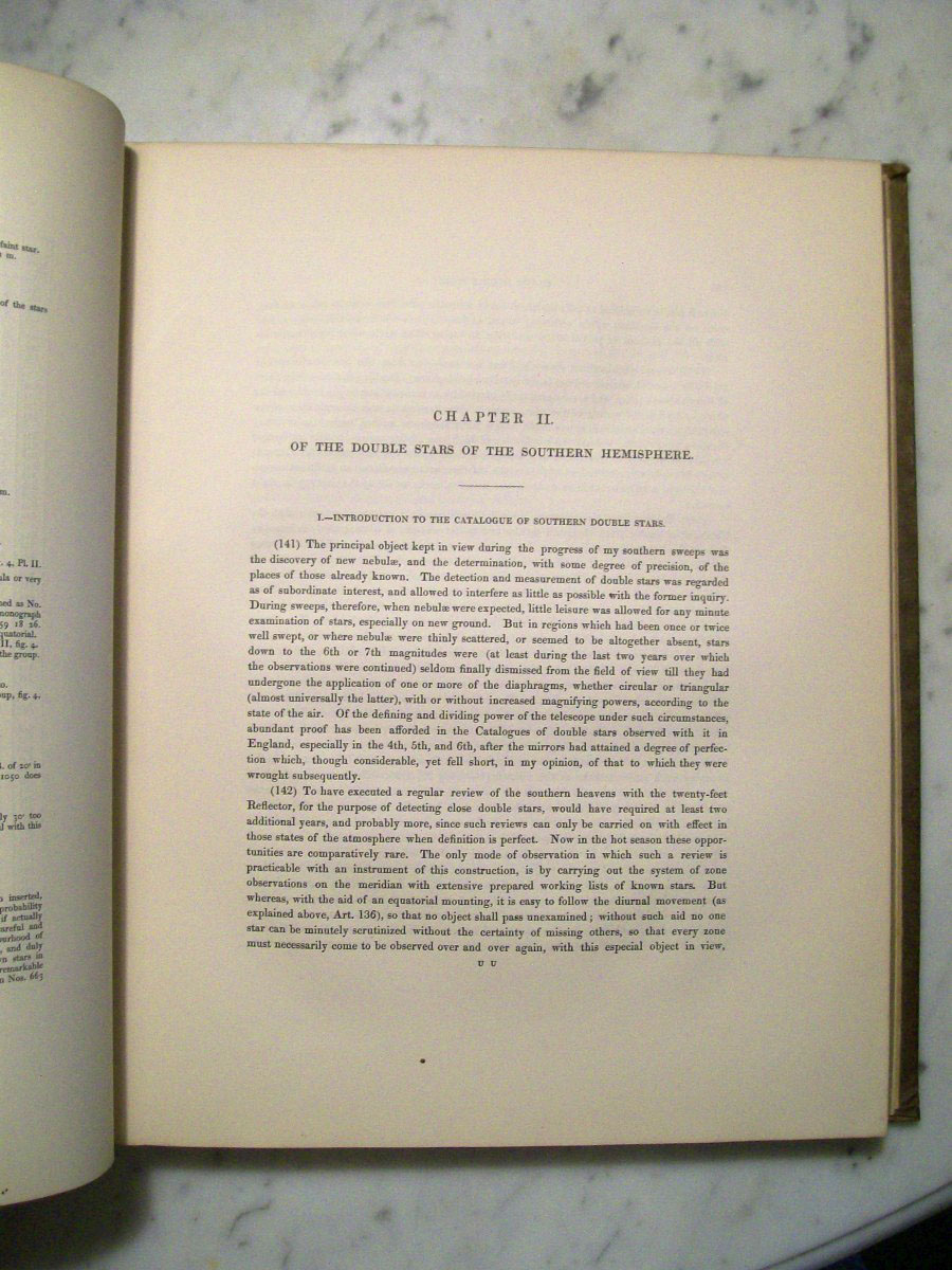Here is John Herschel's most substantial work, which is a compilation of the results of his astronomical observations made at the Cape of Good Hope in South Africa during the time period between 1834 and 1838, and was published in 1847. This is a presentation copy that was given to Henry Fox Talbot, who along with John Herschel was one of the pioneers of photography, which makes this a rather special copy. The objective of John Herschel's work in South Africa was to complete the catalog of nebulae and star clusters that was started by his father William Herschel.