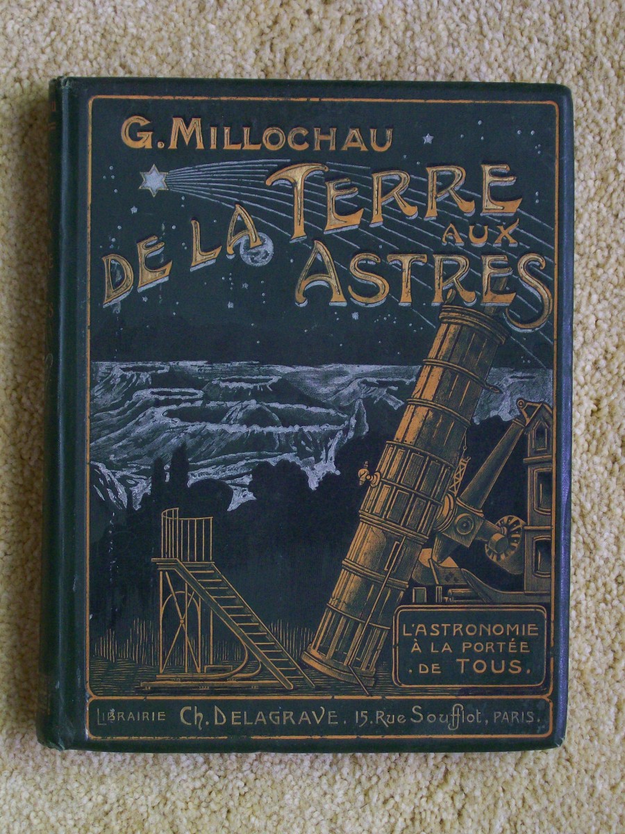 Here is a lovely French language book titled "De la Terre aux Astres" by G. Millochau, which was published in 1910. The cover shows a telescope, moonscape and a comet. The book has gilded edges and the binding is loose, the hinges are cracked, and the pages are darkened with age and brittle.