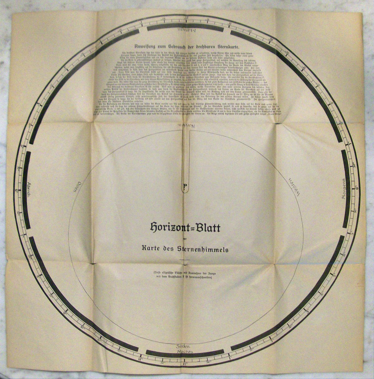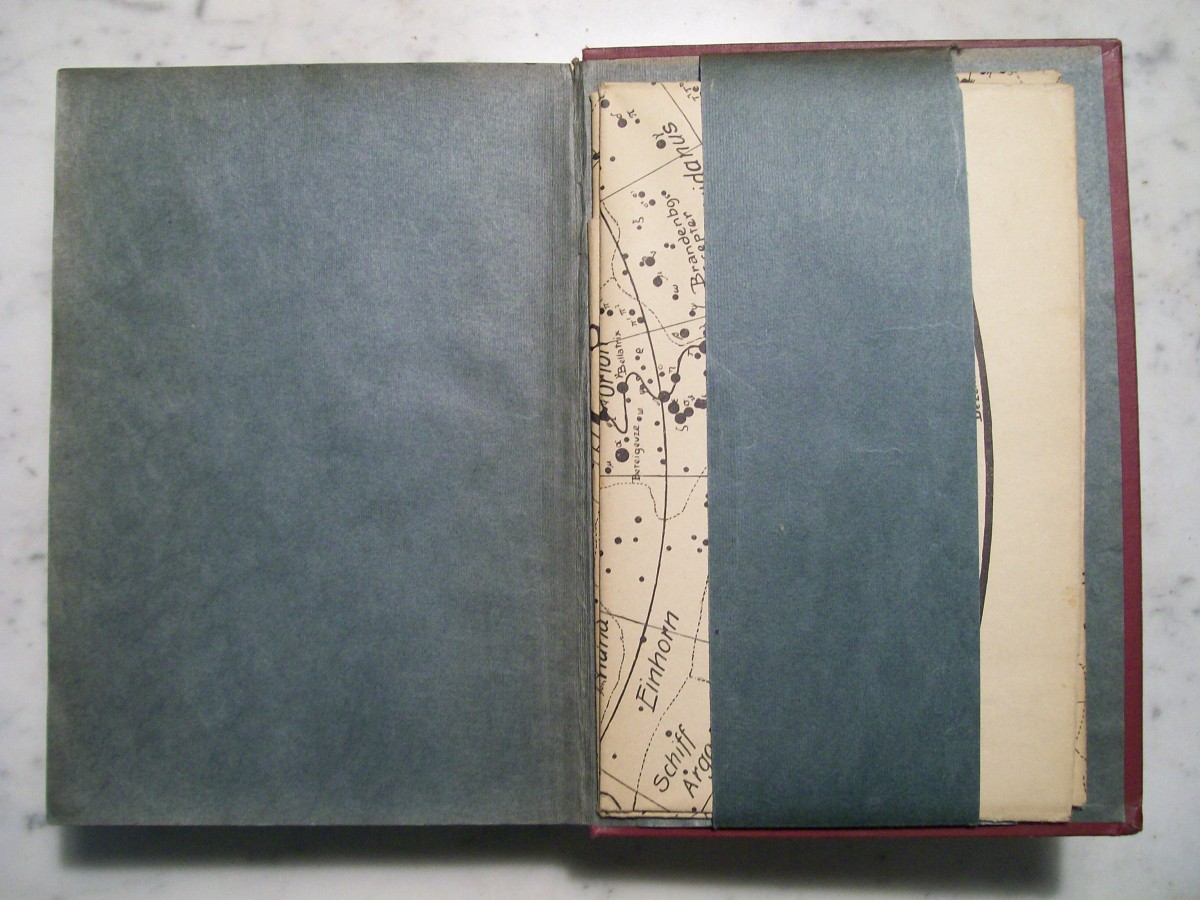 Here is a later edition of "Die Wunder des Himmels" by Joseph Johann von Littrow that I recently acquired. This volume was printed in 1913 and was edited by Dr. Paul Guthnick. What caught my interest, besides the ornate cover, was the large folded planisphere in a sleeve on the inside of the back cover. Unfolded the planisphere is on a sheet of paper that is 22 inches in height by 44 inches in width (55.88 cm by 111.76 cm). To be of any use the planisphere would need to be cut out and pasted to a couple of pieces of stiff cardboard. It is a wonder that it remained with the book uncut. The sheet has been unfolded and refolded many times as can be seen from the wear along the folds. I photographed the planisphere while it was still folded down the middle. The horizon mask has an extension that one would leave which would provide a point of attachment at the North Celestial Pole to the star chart.