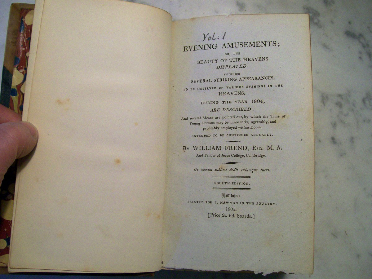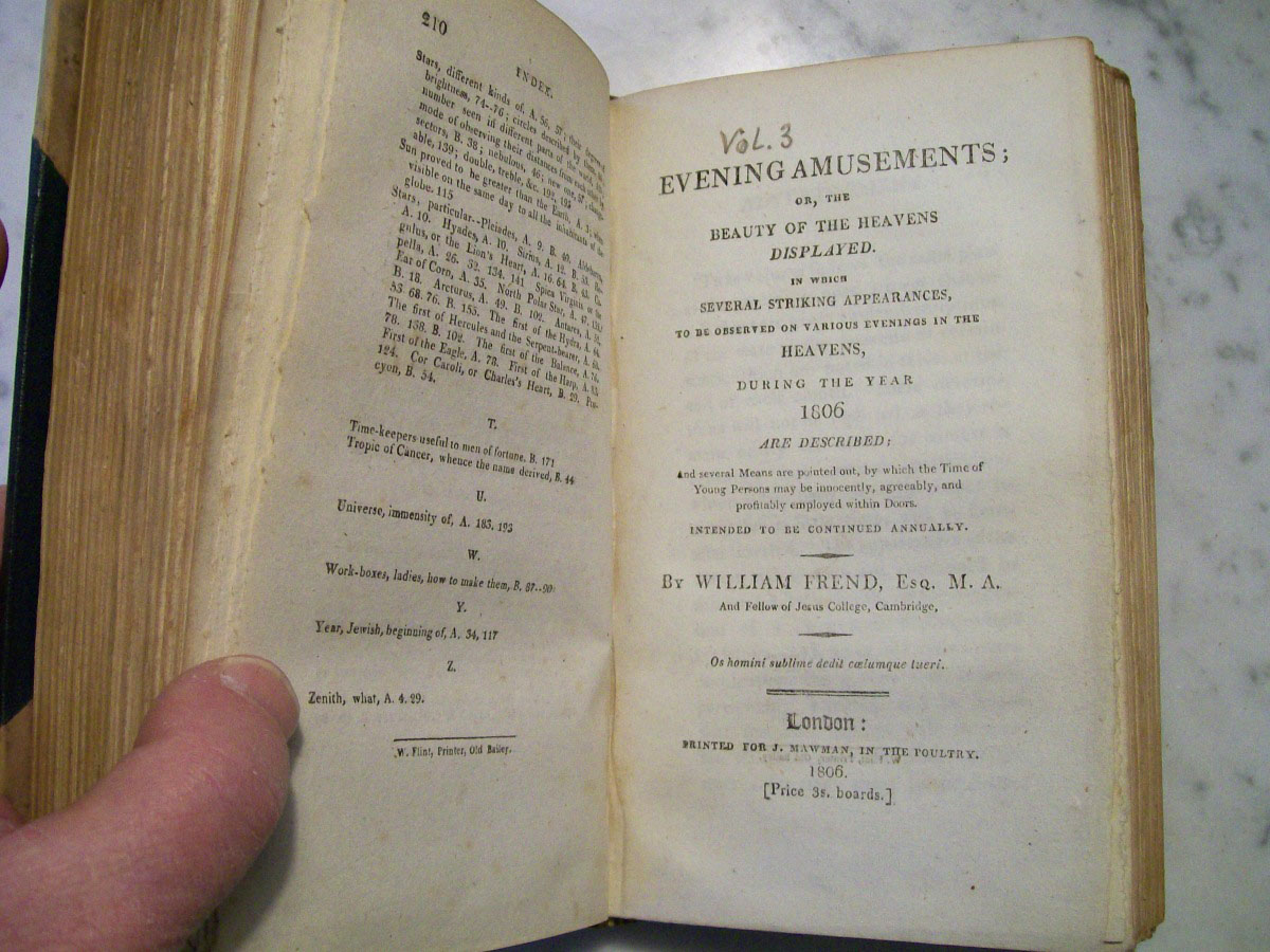 Here is a complete set of Evening Amusements that were published between 1804 and 1822 by William Frend. The 19 volumes were presumably rebound into six volumes by the original owner. The first two volumes from 1804 and 1805 are later editions published in 1805 and 1806, respectively. Each volume explained what an observer could expect to see in the night sky from month to month and they included star maps of individual constellations.