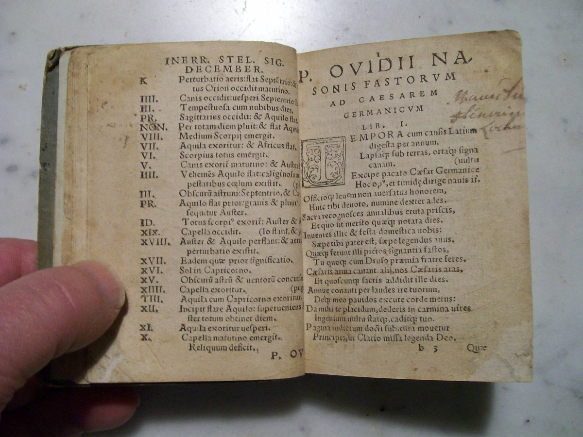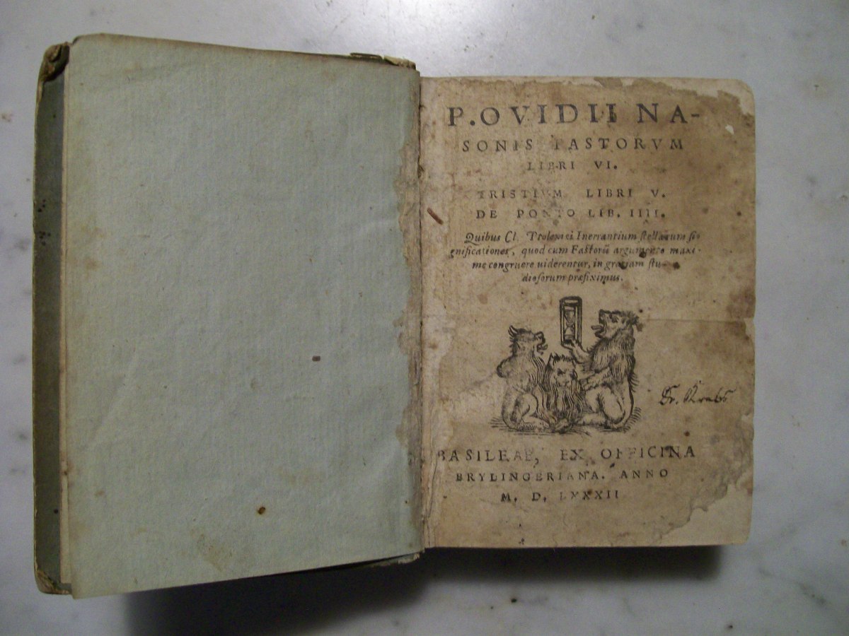 This volume contains three of Ovid's works, the Fasti (the Roman calendar and astronomy), the Tristia, and the Epistulae ex Ponto. This book was perhaps rebound during the 18th or 19th century and was trimmed down in the process. Some conservation work done to tattered pages.