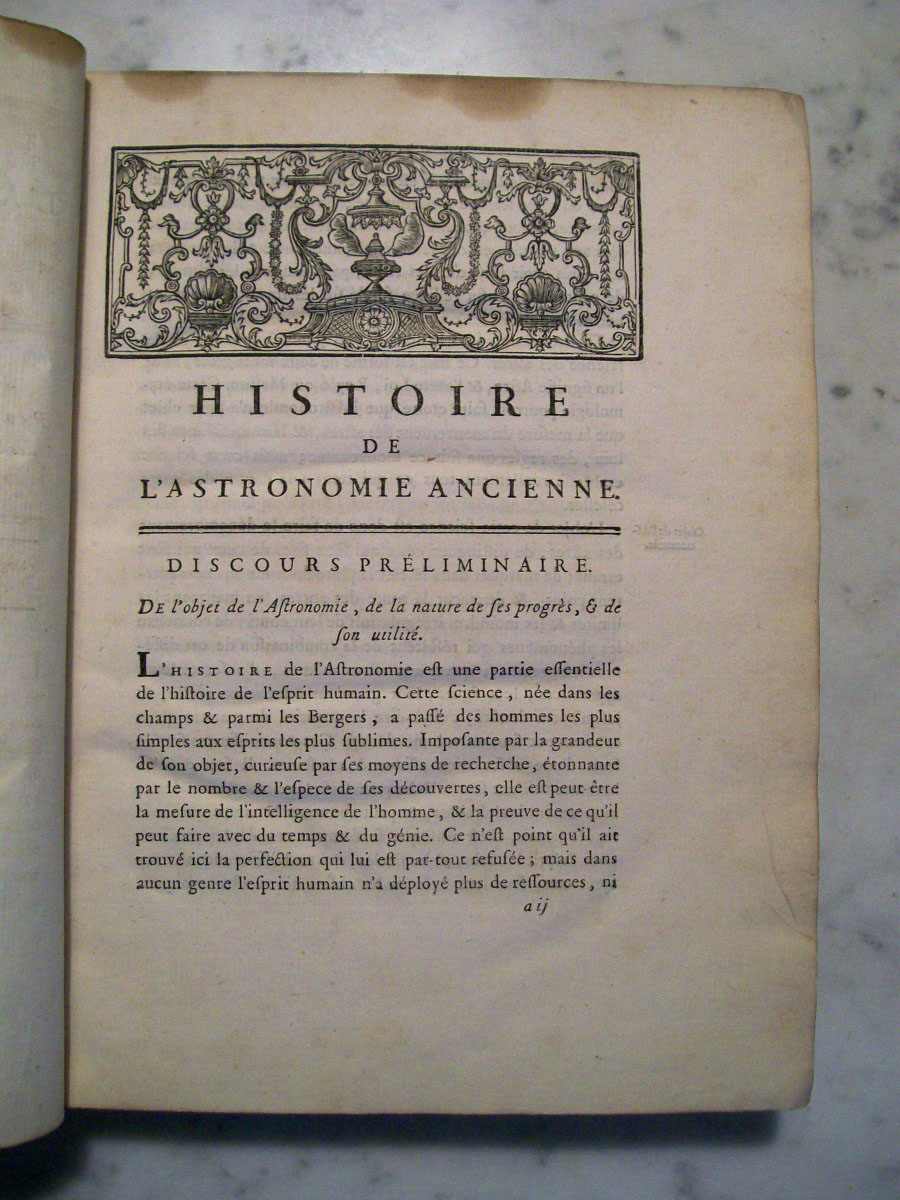 "Histoire De L'astronomie Ancienne Depuis Son Origine" by Jean Sylvain Bailly, is a second edition published in 1781, that tells the history of ancient astronomy. Jean Sylvain Bailly was an astronomer and mathematician and he was also an early leader in the French Revolution who later lost his head during the Reign of Terror.