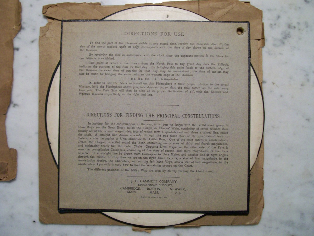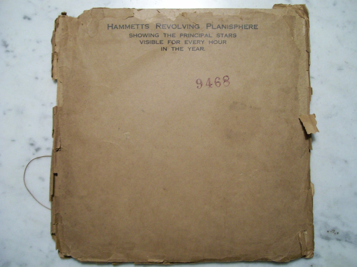 Here is a copy of Hammett's Planisphere with the blue star background that has the remnants of the original envelope. Somehow the envelope managed to protect the planisphere from damage over the decades because the planisphere is in nearly perfect shape. Obviously the planisphere and its envelope were kept somewhere safe. This planisphere dates from about 1920.