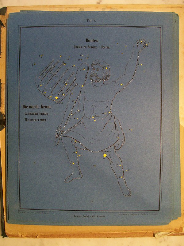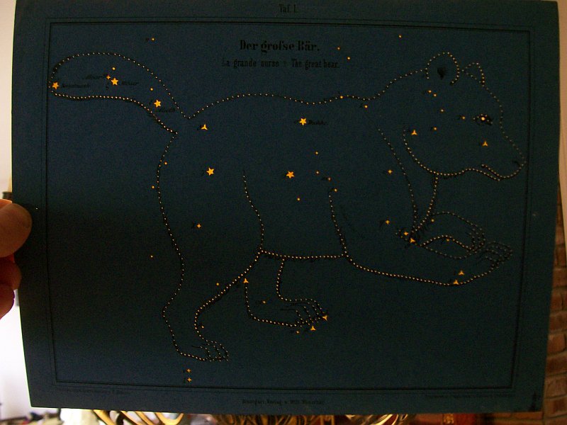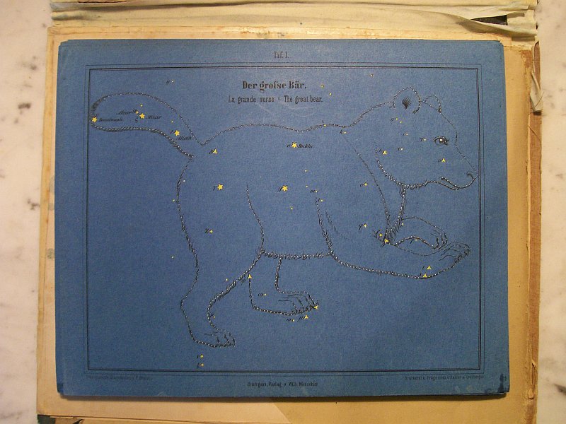 This atlas consists of 30 constellation cards and one northern star chart. All of the cards and the star chart have holes where the stars are located and are backed with a transparent paper so that light shines through the stars. I am missing the booklet that goes with this atlas.