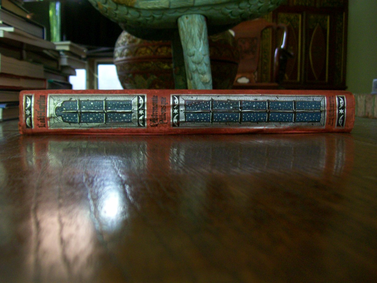 Here is a lovely French language book titled "L'Astronomie Pittoresque" by L'Abbé J. Loridan, which was published in 1896. The cover shows the stereotypical astronomer in a robe and pointed cap looking through a telescope. The book has gilded edges and the binding is a bit loose but the hinges and joints are still intact with no cracks or tears.