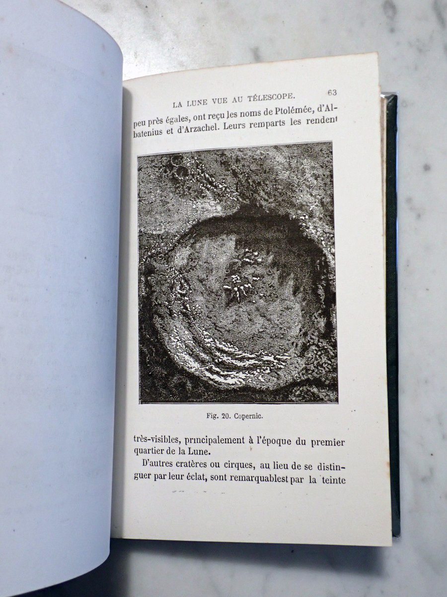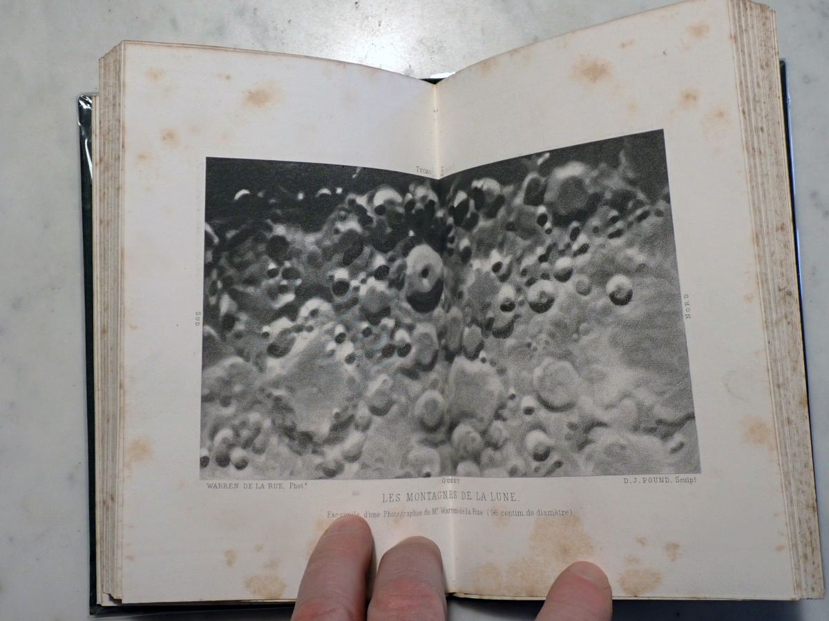 Here is a second edition of Amédée Guillemin's "La Lune". The folding frontispiece shows the full moon. Between pages 114 and 115 there is a reproduction of a photographic image of the region around the crater Tycho, taken by Warren De La Rue and engraved by Daniel John Pound.