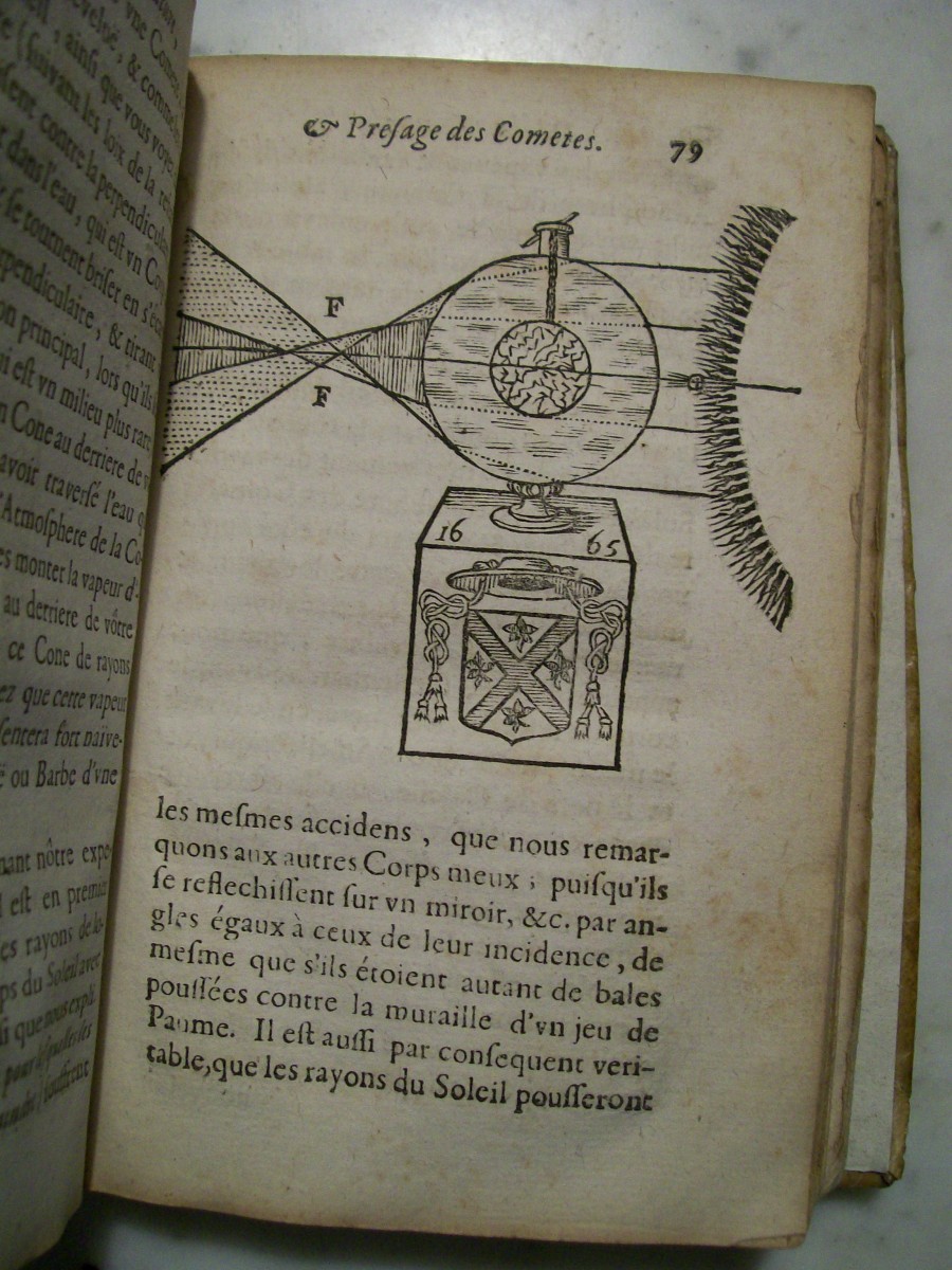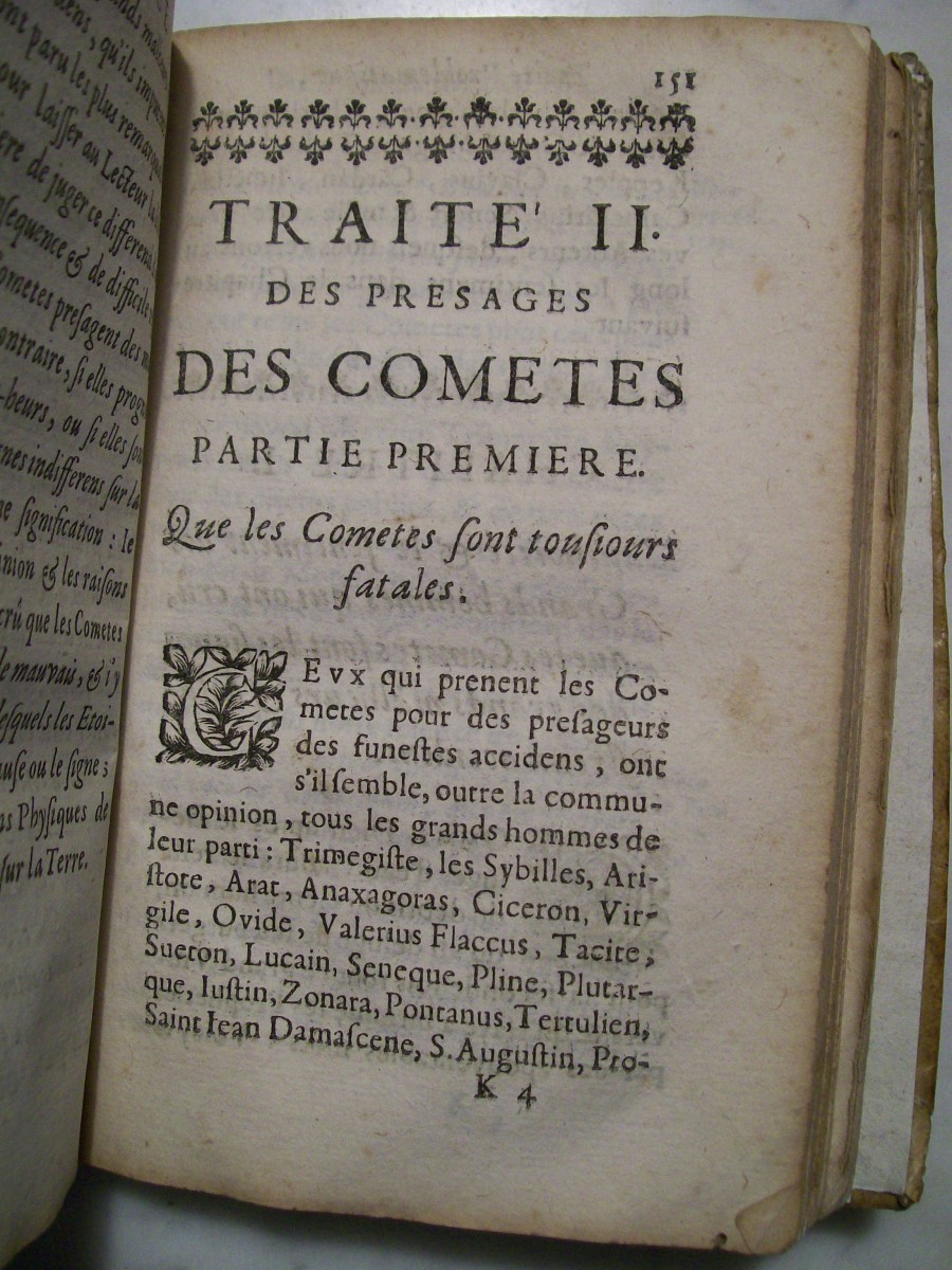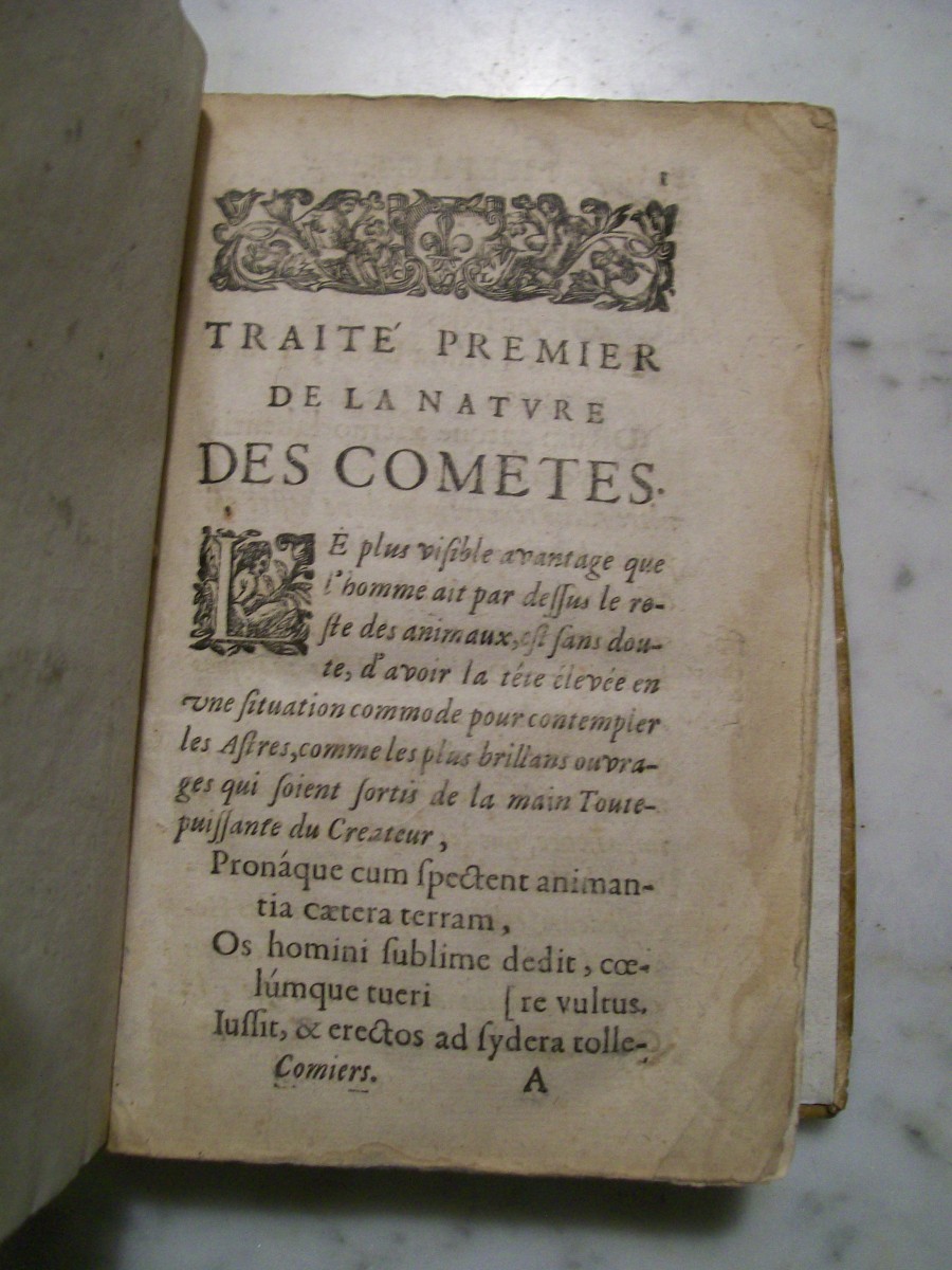 Here is a 17th century book about comets titled "La Nature et Présage des Comètes" (Nature and Omen of Comets) and was written by Claude Comiers in 1665. It is a first edition but it is missing the title page, and all of the introductory pages. It is also missing pages 369 through 387 and pages 399-400. It appears to have been rebound in either the 17th century or perhaps the 18th century. All ten of the woodcut illustrations are present. The following description has been taken from several auction sites that describe copies of this book that were up for sale in the past. "Comiers pleaded for the innocence of comets which he supposed to be only optical phenomena and therefore incapable of having effects apart from those attributed to light. However, while denouncing the superstitions of his time, Comiers painstakingly describes the mechanism of the end of the world triggered by the comet of 1665."