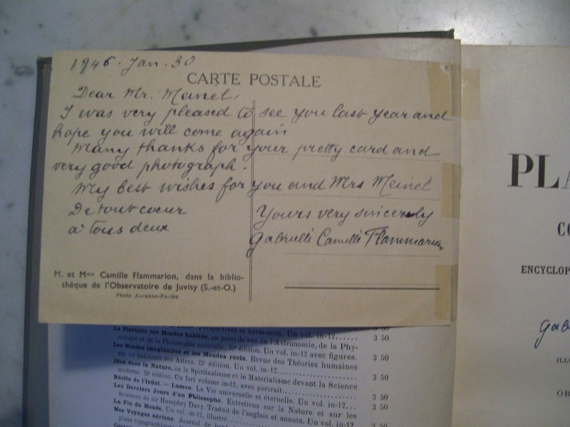 During Aden's assignment in Europe he made the acquaintance with Gabrielle Flammarion, which is when my copy of "La Planéte Mars" was inscribed. The post card inserted into my copy shows that Aden and Gabrielle continued to correspond for a while after he returned to the States.