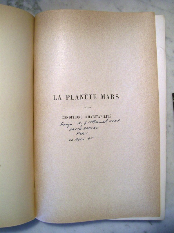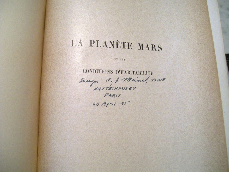 During a talk at the 240th American Astronomical Society meeting on the American astronomer Aden Meinel I managed to make a connection between the name on the half title page of this book and the person. The name of the previous owner written on the half title page was Ensign a. b. Meinel, USNR. Now let me share something about the person.