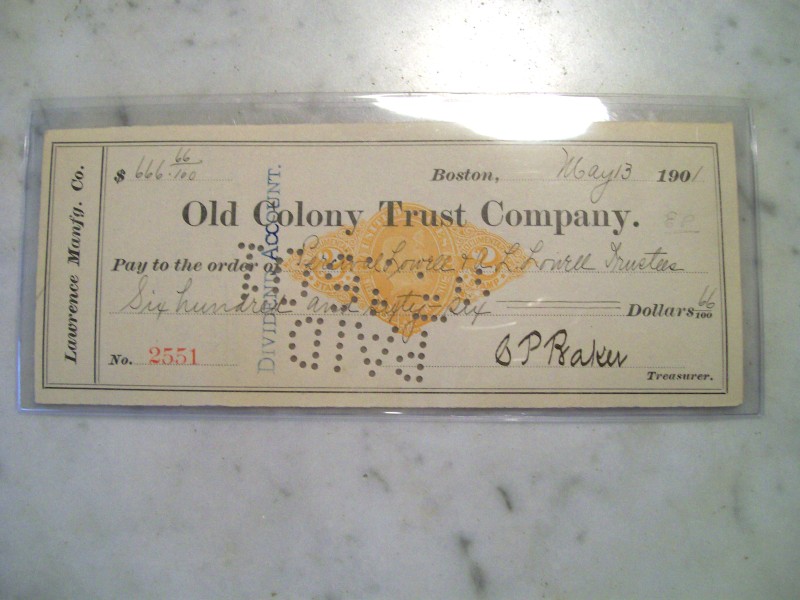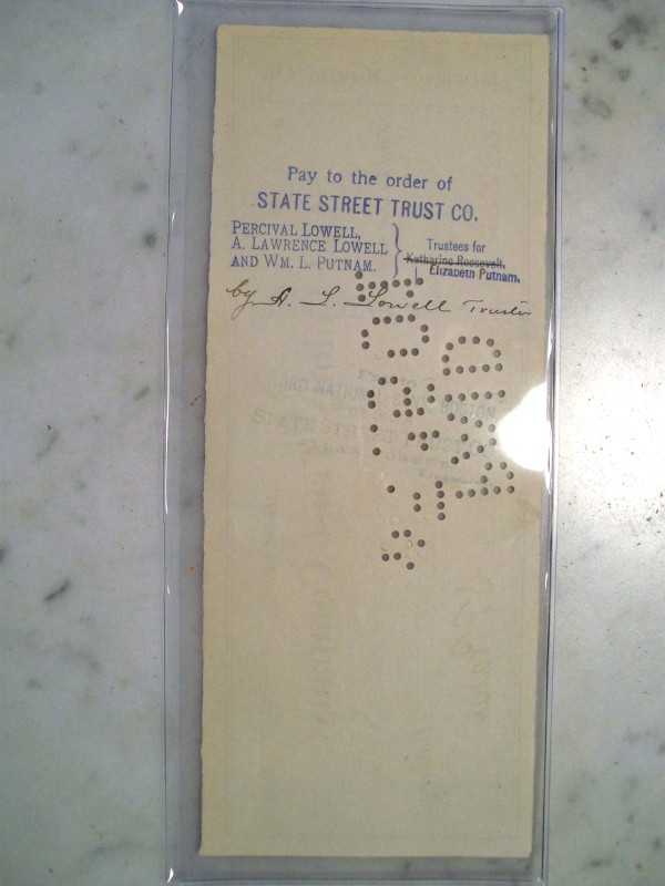A cancelled check from the Lawrence Manufacturing Company that was used to pay dividends to Elizabeth Putnum, who was one of Percival Lowell's sisters.