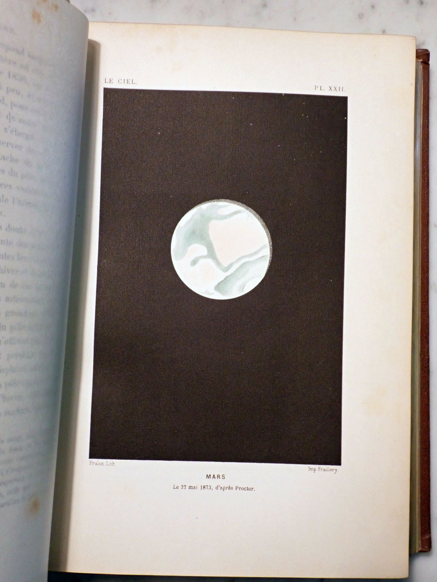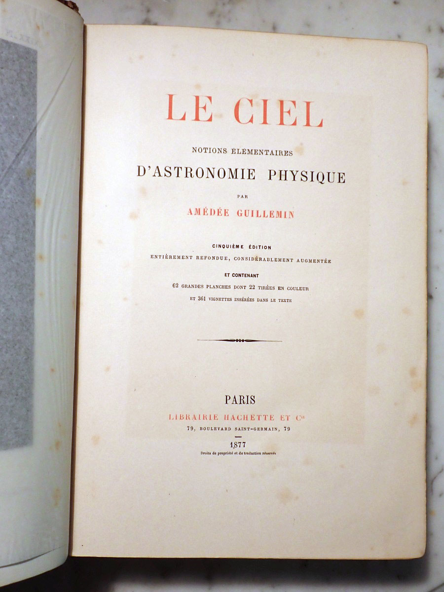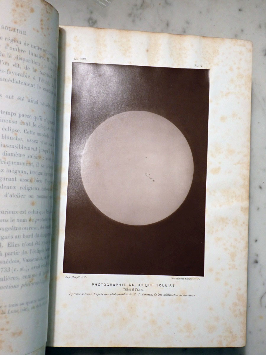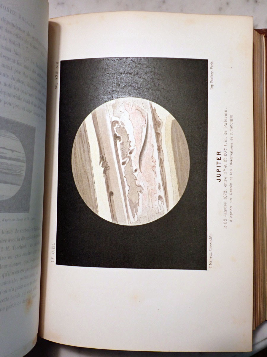 Here is a copy of "Le Ciel" by Amédée Guillemin, published in 1877. This is an amazing, book from its decorative cover to the color plates throughout the book. Plate 6 is a wonderful tipped in photographic print of the sun. Plate 23 has one of the more detailed Jupiter drawings that I have ever run across.