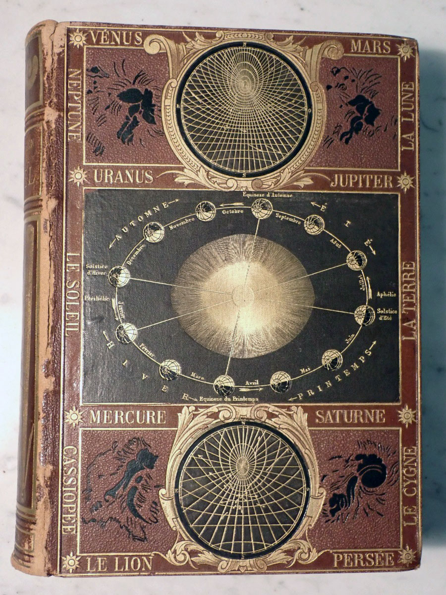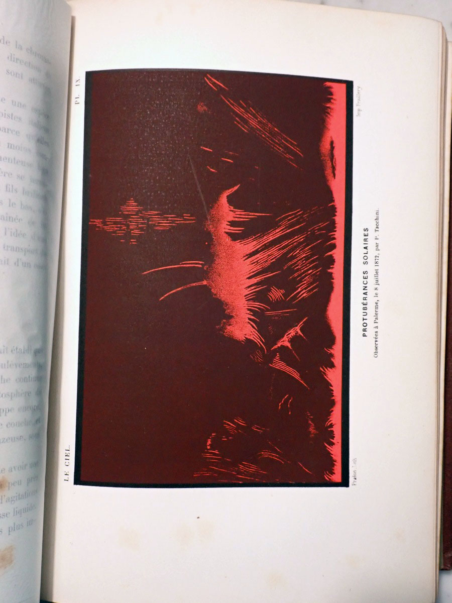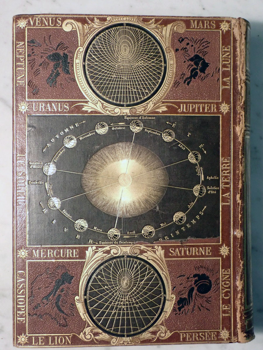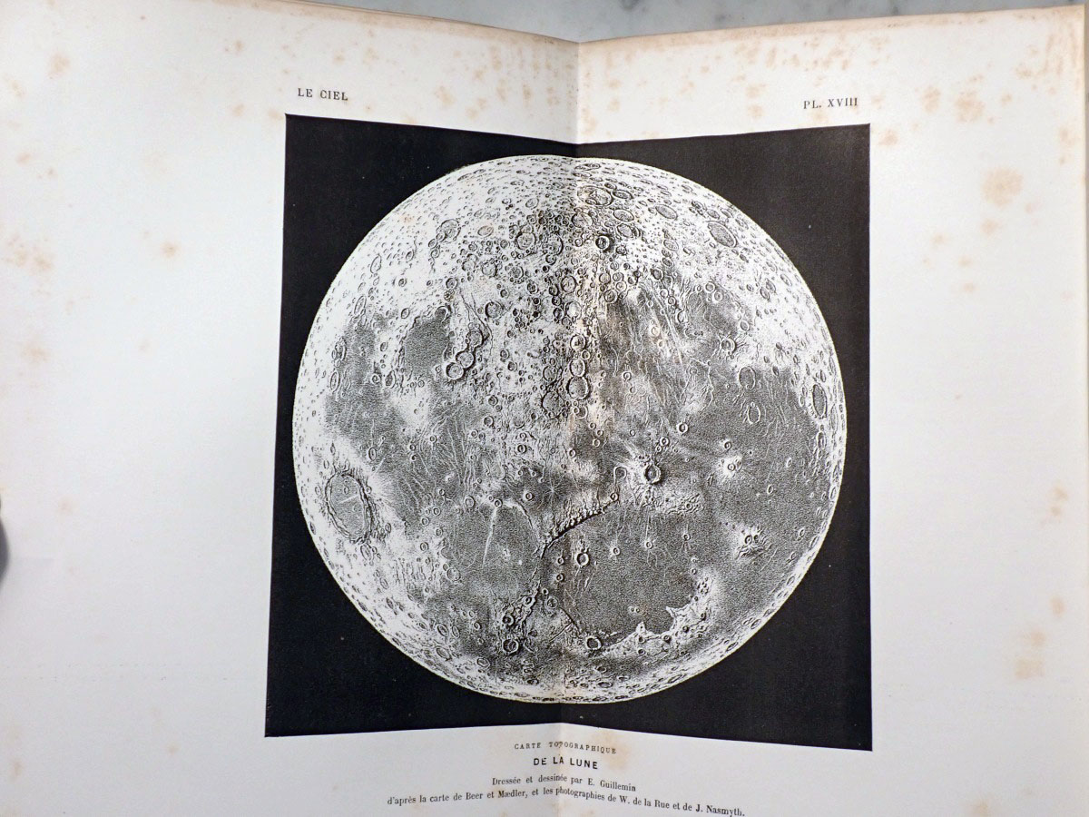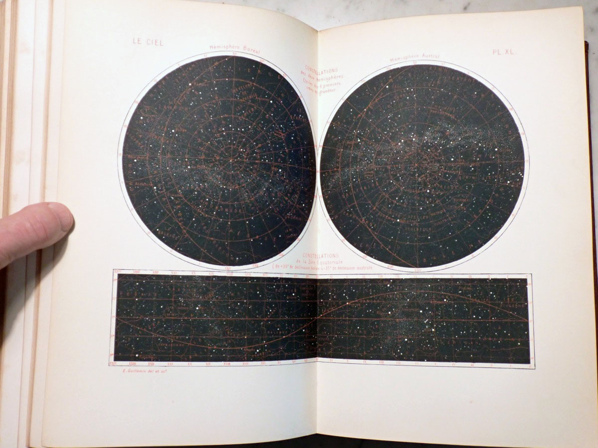 Here is a copy of "Le Ciel" by Amédée Guillemin, published in 1877. This is an amazing, book from its decorative cover to the color plates throughout the book. Plate 6 is a wonderful tipped in photographic print of the sun. Plate 23 has one of the more detailed Jupiter drawings that I have ever run across.