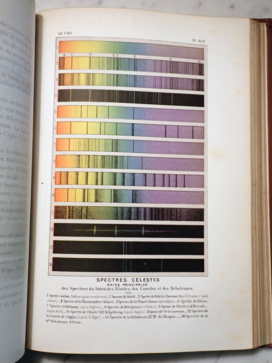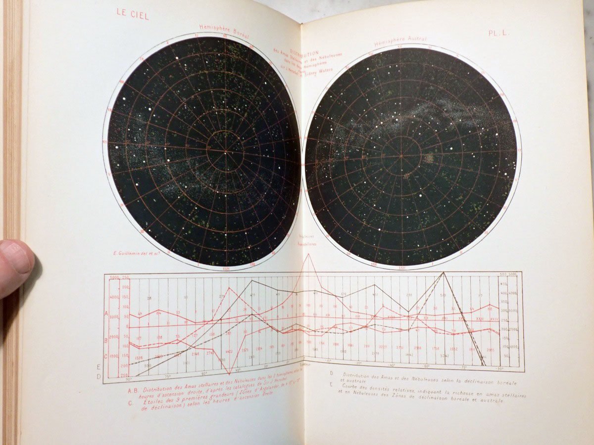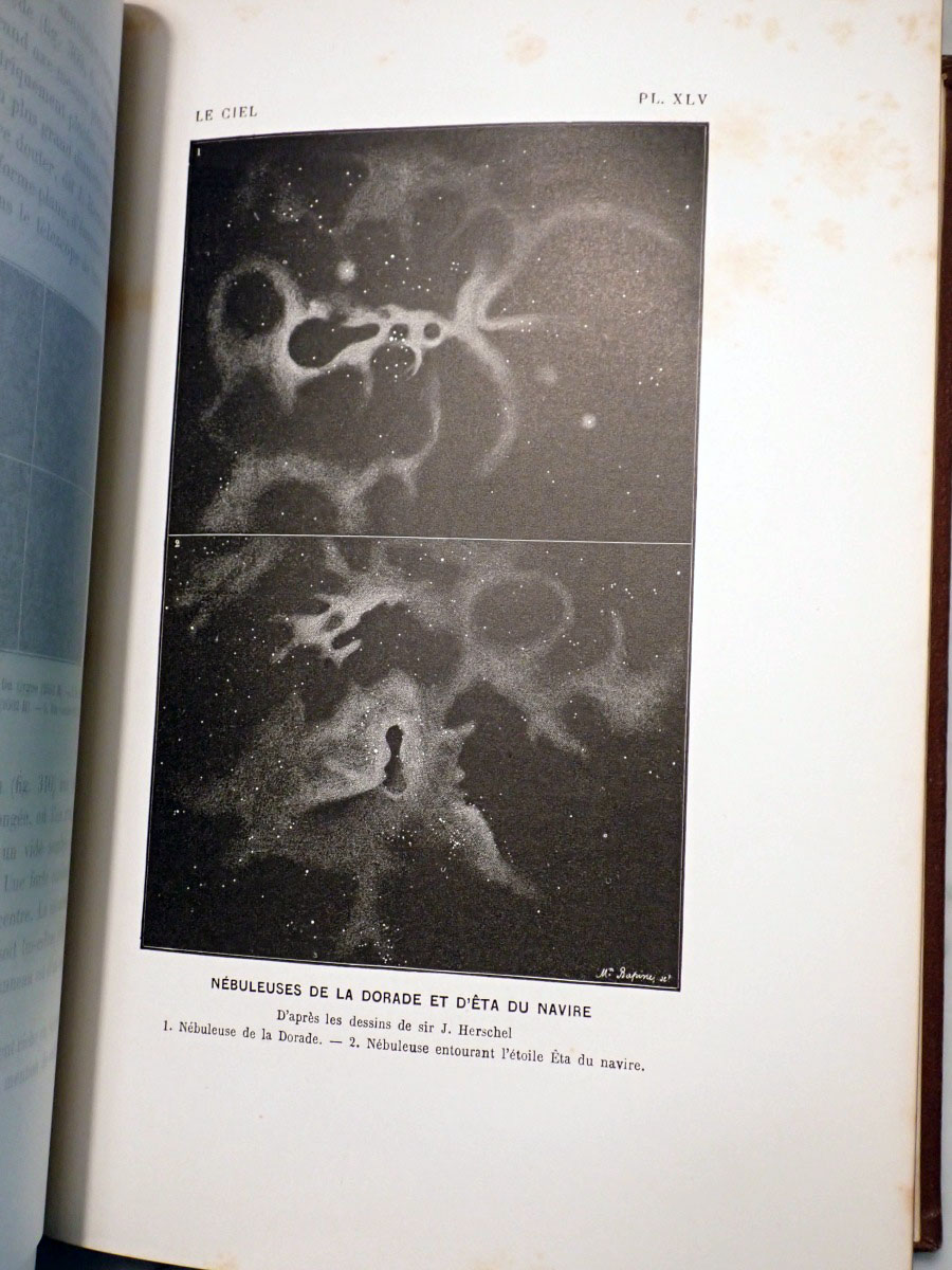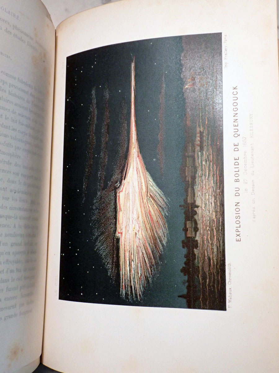 Here is a copy of "Le Ciel" by Amédée Guillemin, published in 1877. This is an amazing, book from its decorative cover to the color plates throughout the book. Plate 6 is a wonderful tipped in photographic print of the sun. Plate 23 has one of the more detailed Jupiter drawings that I have ever run across.