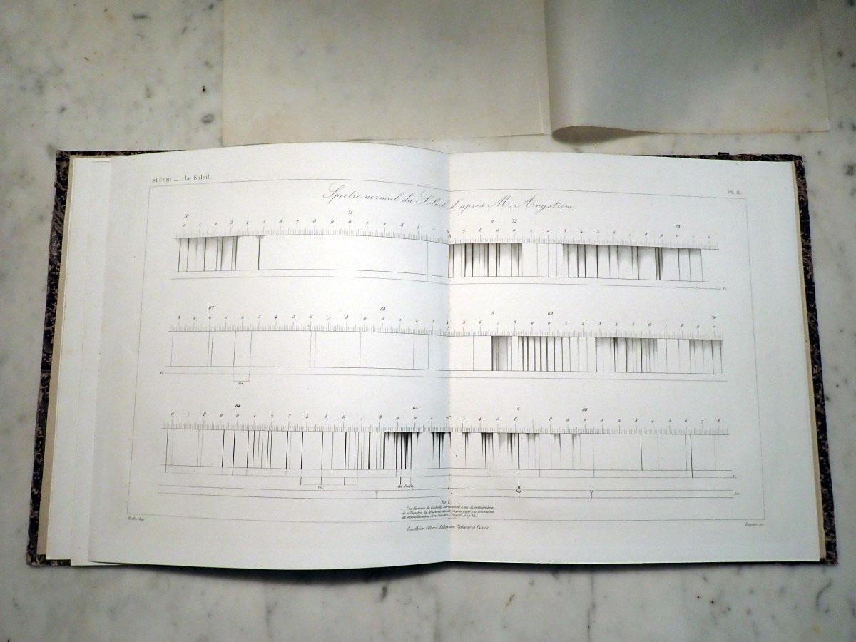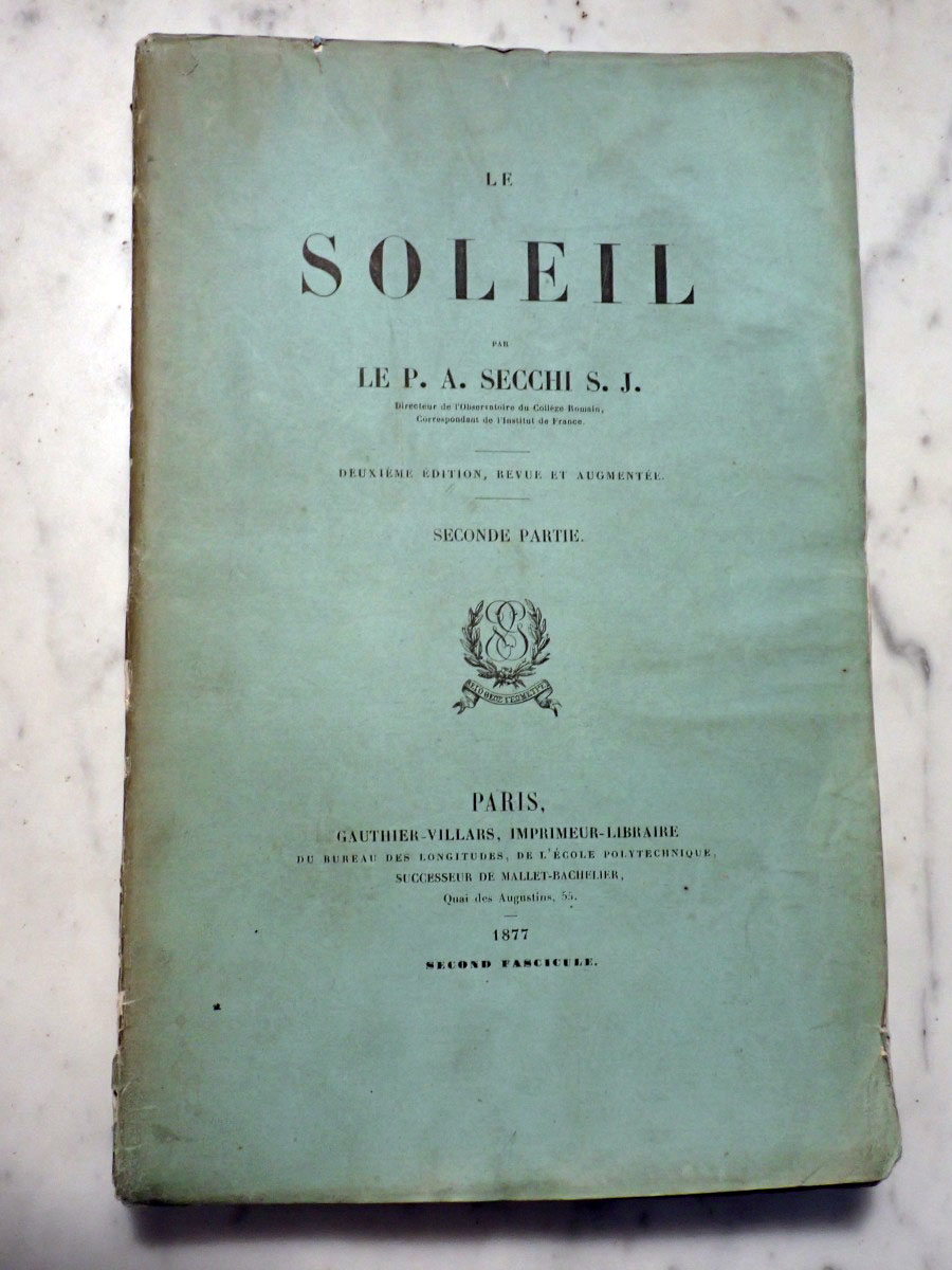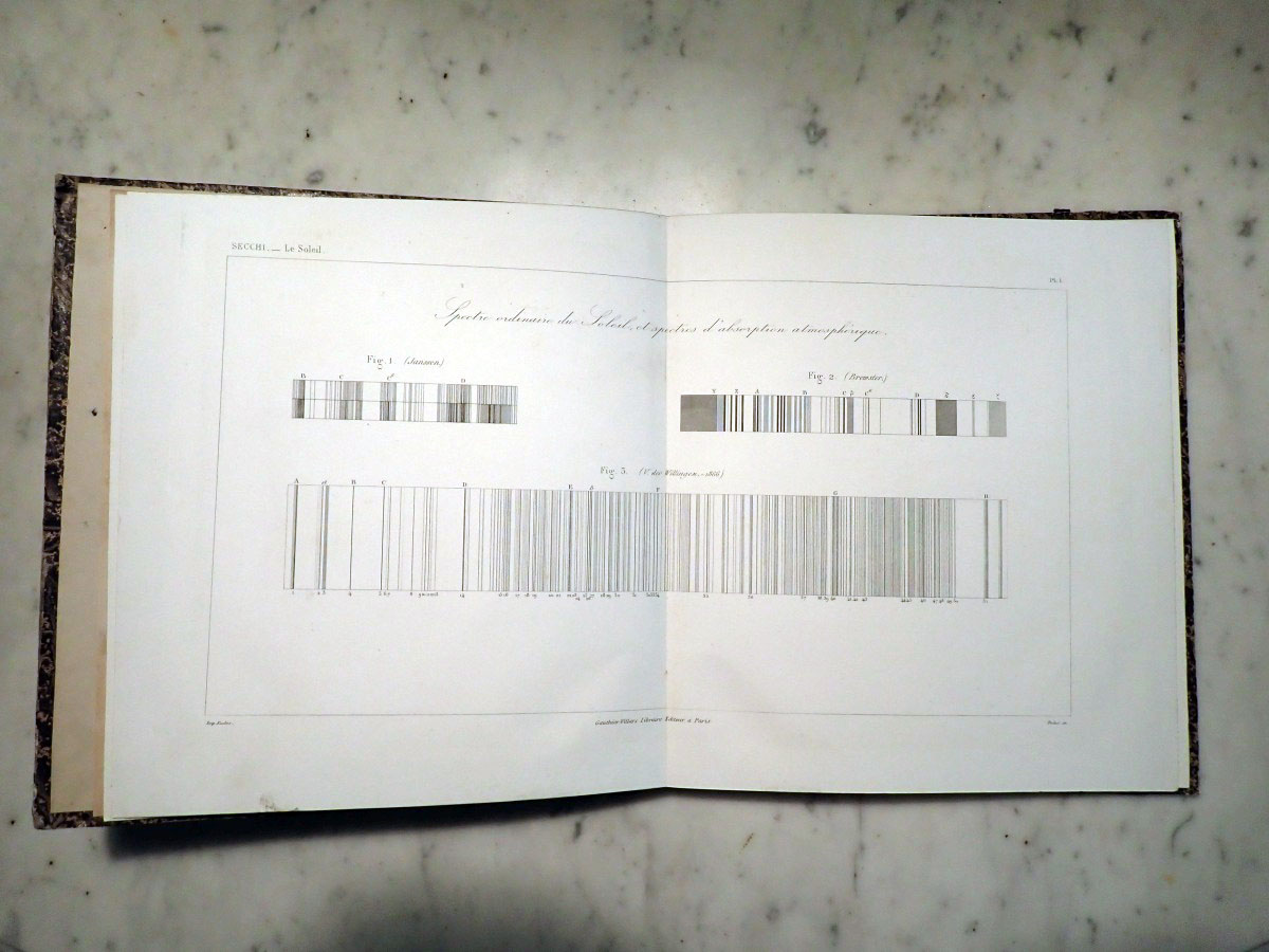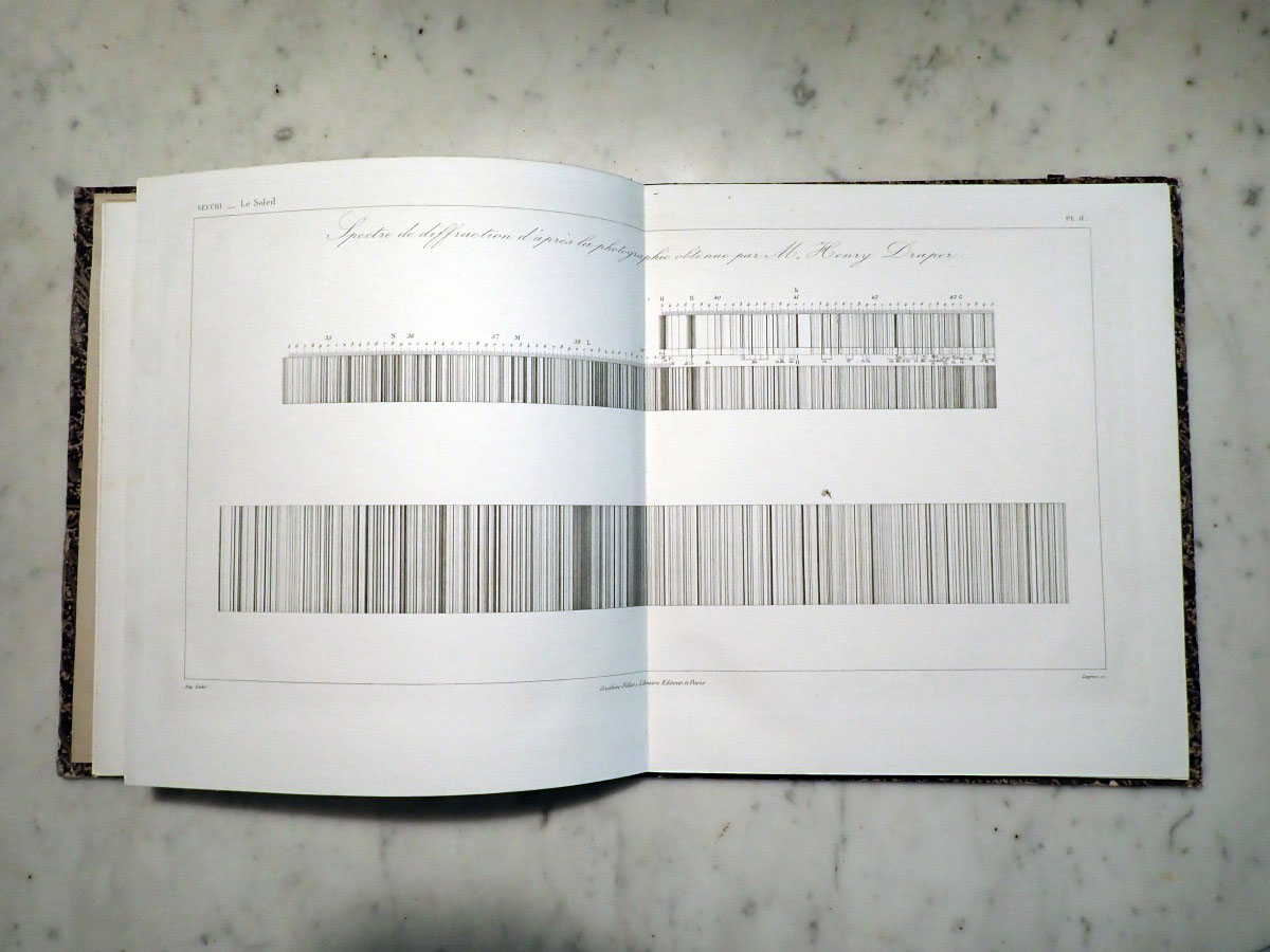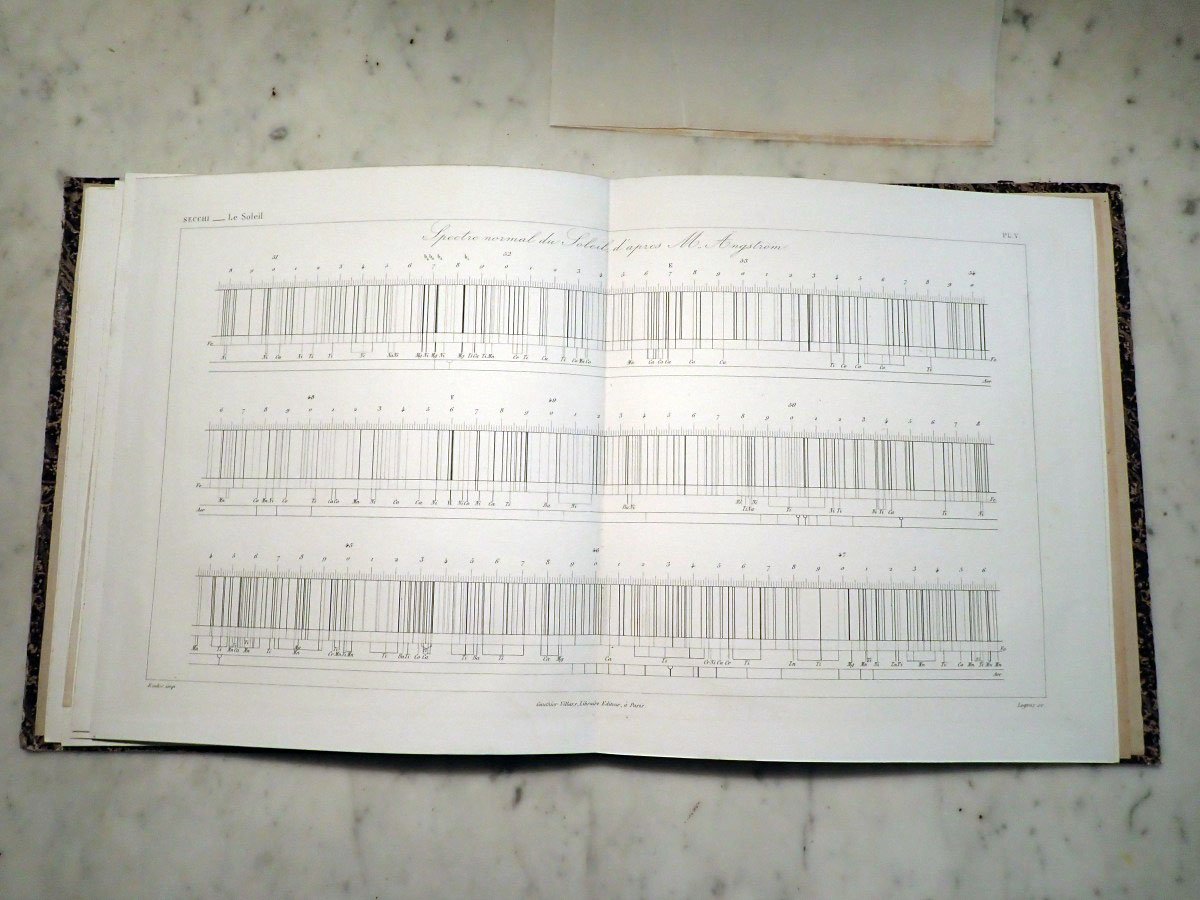 Here is a copy of Angelo Secchi's "Le Soleil" that consists of a two volume book on his solar research and an atlas of the solar spectrum. I am missing the first volume of the solar researches. The second volume that I have is in two parts. The first part was published in 1875, and the second part was published in 1877. The atlas was published in 1875. The first part concentrates on the Sun while the second part continues with the Sun and covers the solar system and stellar astronomy. Part one has a series of wonderful solar prominence drawings made by Angelo Secchi using a special spectroscope (high dispersion, double pass instruments that employ five or more prisms) and technique that was independently developed by Norman Lockyer and Jules Jenssen in 1868 in which a spectroscope slit is centered on the edge of the Sun where the chromosphere is located. If you read the biography of Secchi on Wikipedia it states that he was the inventor of the heliospectrograph, which is not true. I am not sure if the author of that Wikipedia article was referring to the spectroscope that Secchi used as a heliospectroscope or if they confused it with the spectroheliograph invented by George Ellery Hale. The same Wikipedia article falsely claims that Secchi also invented the stellar spectroscope. Wikipedia articles need to have appropriate references. The statements that I saw that were false were not backed up by any references. The second part of volume two starts with two very nice plates of nebular drawings. It continues with a couple of chapters on the Sun. It includes a chapter on the transits of Venus, chapters on the planets, a chapter on comets, and a chapter on stellar spectroscopy that includes two color plates of stellar spectra. Angelo Secchi was a Catholic priest and astronomer from Italy that was a pioneer in astronomical spectroscopy. He developed a system of stellar spectral classification based on five different spectral types (Secchi classes) that was a forerunner to the Henry Draper spectral classification system developed by Edward Pickering at the Harvard College Observatory.