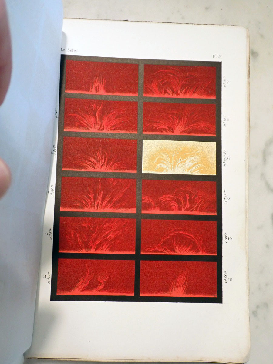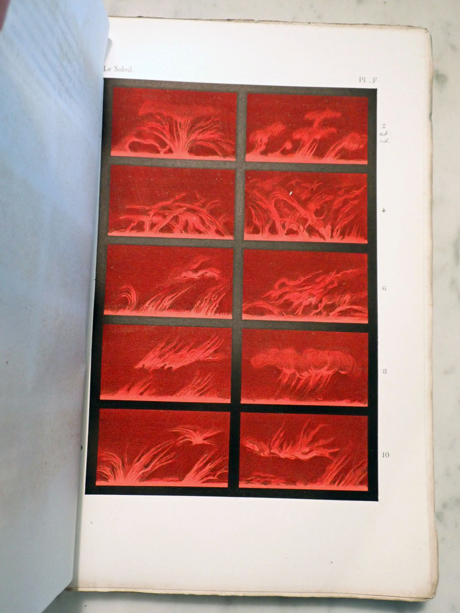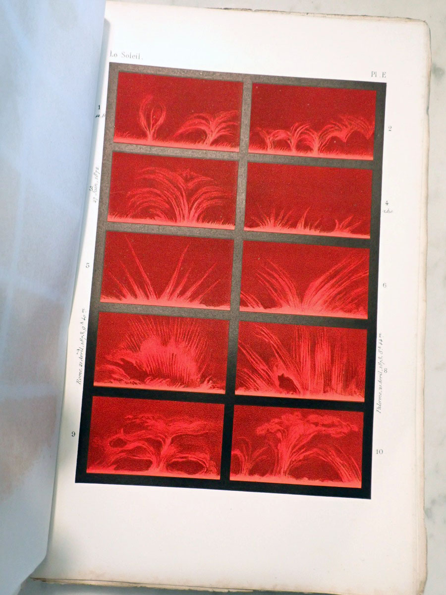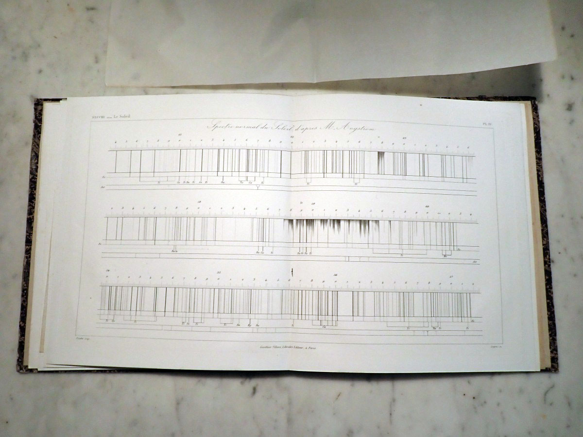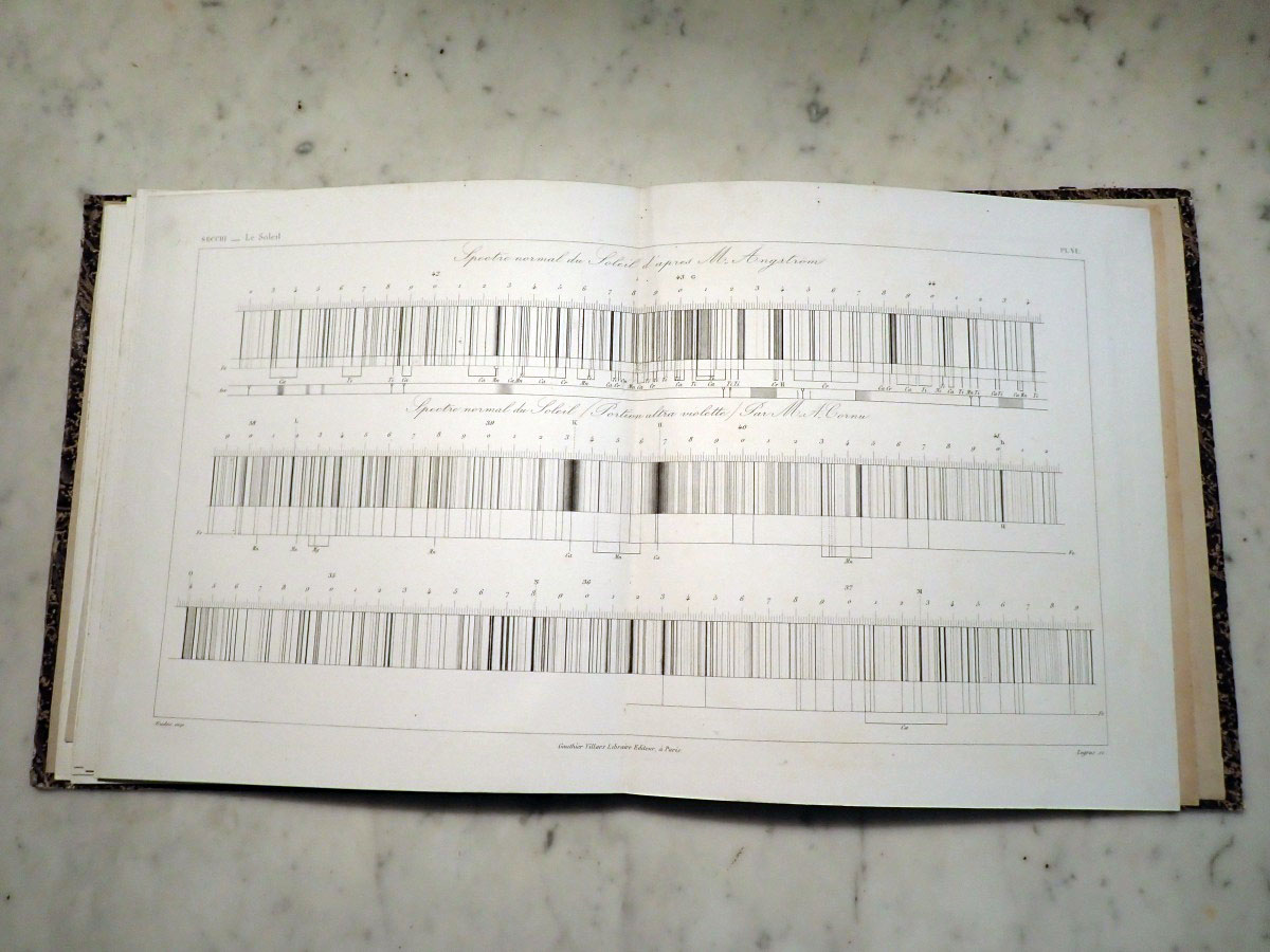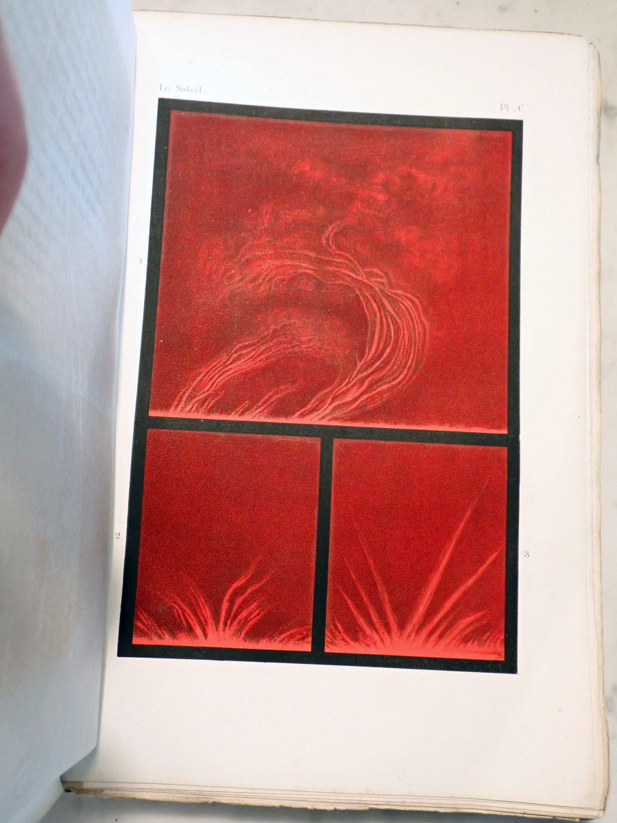 Here is a copy of Angelo Secchi's "Le Soleil" that consists of a two volume book on his solar research and an atlas of the solar spectrum. I am missing the first volume of the solar researches. The second volume that I have is in two parts. The first part was published in 1875, and the second part was published in 1877. The atlas was published in 1875. The first part concentrates on the Sun while the second part continues with the Sun and covers the solar system and stellar astronomy. Part one has a series of wonderful solar prominence drawings made by Angelo Secchi using a special spectroscope (high dispersion, double pass instruments that employ five or more prisms) and technique that was independently developed by Norman Lockyer and Jules Jenssen in 1868 in which a spectroscope slit is centered on the edge of the Sun where the chromosphere is located. If you read the biography of Secchi on Wikipedia it states that he was the inventor of the heliospectrograph, which is not true. I am not sure if the author of that Wikipedia article was referring to the spectroscope that Secchi used as a heliospectroscope or if they confused it with the spectroheliograph invented by George Ellery Hale. The same Wikipedia article falsely claims that Secchi also invented the stellar spectroscope. Wikipedia articles need to have appropriate references. The statements that I saw that were false were not backed up by any references. The second part of volume two starts with two very nice plates of nebular drawings. It continues with a couple of chapters on the Sun. It includes a chapter on the transits of Venus, chapters on the planets, a chapter on comets, and a chapter on stellar spectroscopy that includes two color plates of stellar spectra. Angelo Secchi was a Catholic priest and astronomer from Italy that was a pioneer in astronomical spectroscopy. He developed a system of stellar spectral classification based on five different spectral types (Secchi classes) that was a forerunner to the Henry Draper spectral classification system developed by Edward Pickering at the Harvard College Observatory.