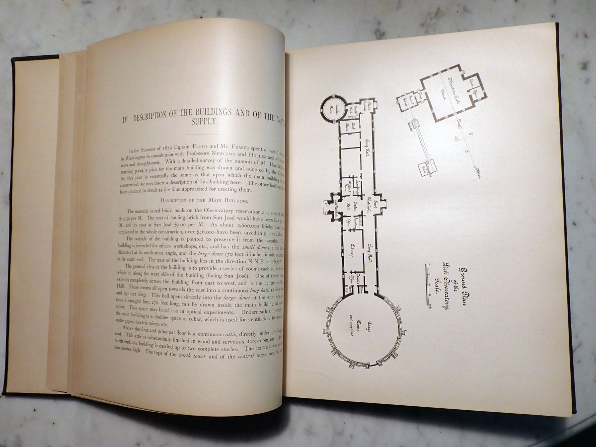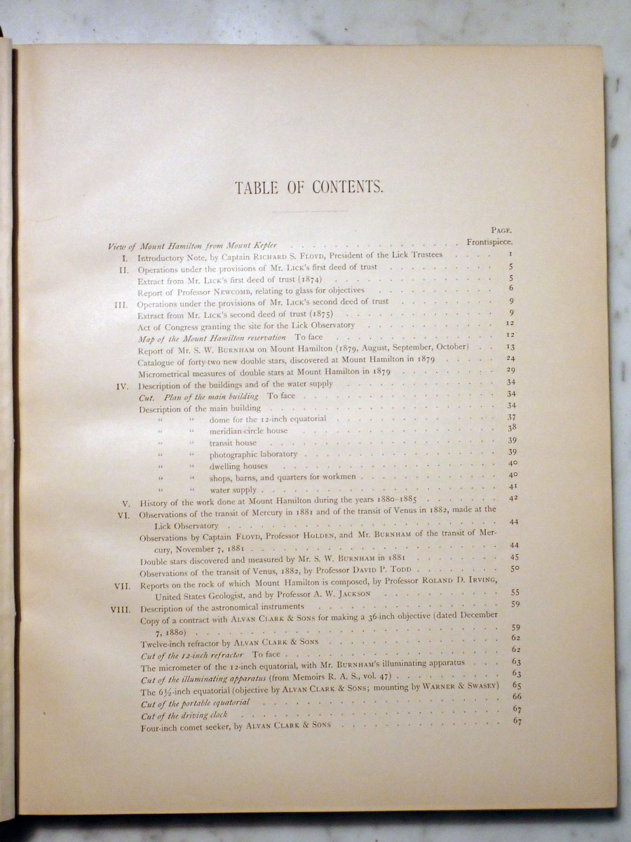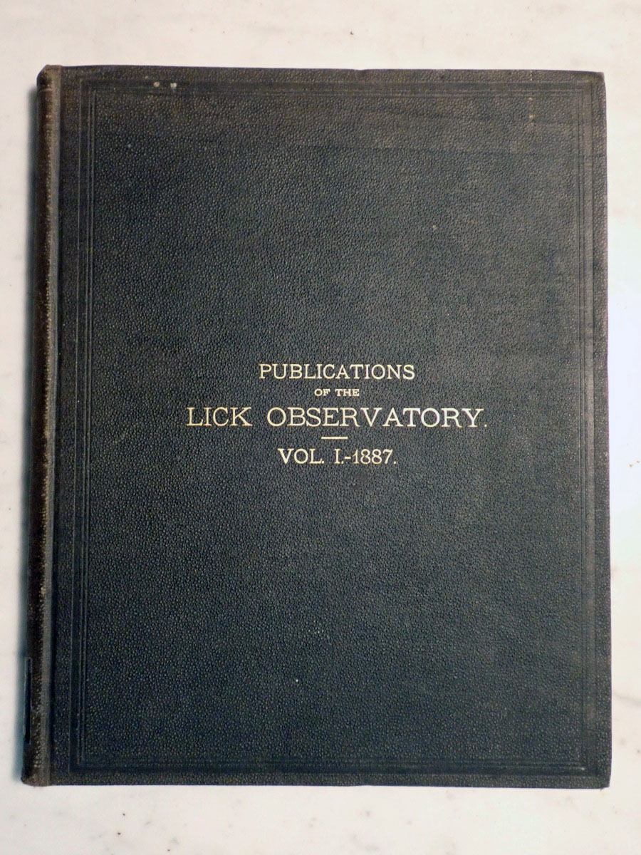Here is a copy of the first volume of the "Publications of the Lick Observatory" published in 1887 and prepared by Edward Holden, who served as the first Lick Observatory director from 1887 to 1897. Most of the actual work in preparing this first volume was done by the astronomer James Keeler, who would become the observatory's second director. This particular volume was a presentation copy from the Lick Trustees to the Hon. John T. Doyle of Menlo Park California. There is also a bookplate that belonged to Monsignor Joseph M. Gleason (1869-1942) who was a Catholic priest, historian, and collector of books and photographs (see https://www.jstor.org/stable/3633294). The frontispiece shows Mount Hamilton in 1886 before the installation of the 36 inch refractor. This volume describes the equipment and facilities as they existed in 1887 along with meteorological records, geographical information, and other miscellaneous things like refraction tables, etc...