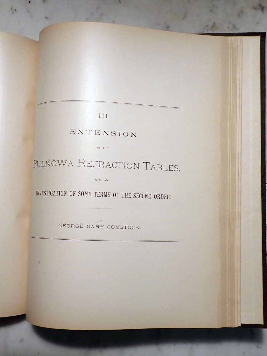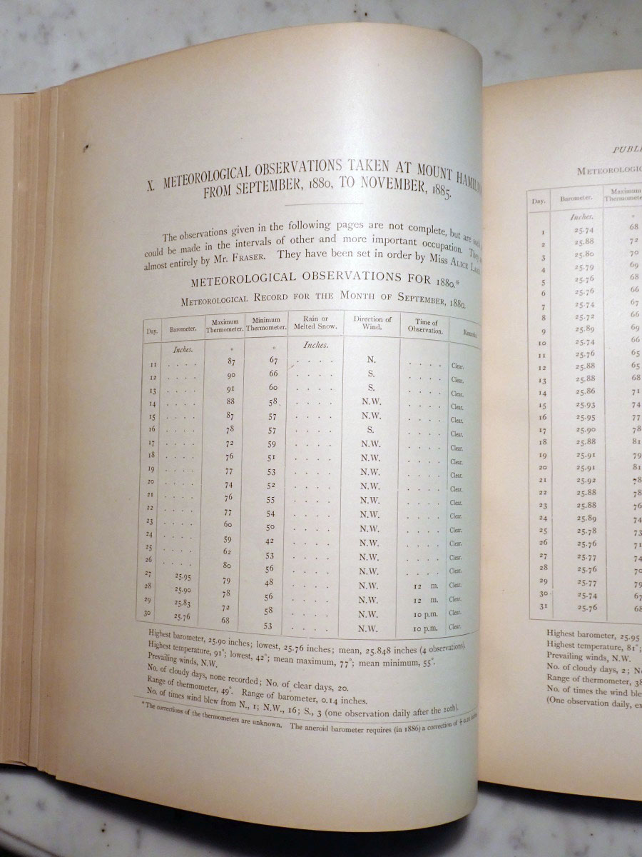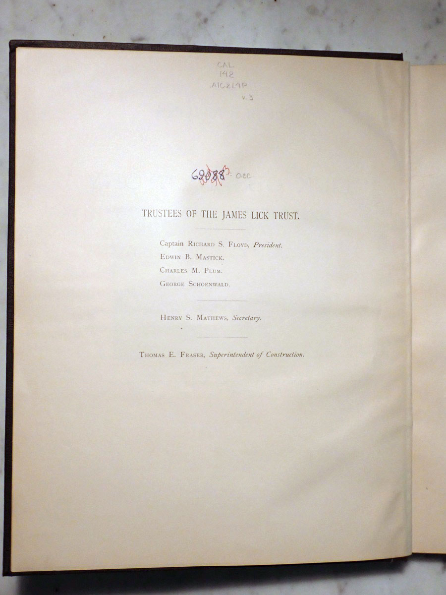 Here is a copy of the first volume of the "Publications of the Lick Observatory" published in 1887 and prepared by Edward Holden, who served as the first Lick Observatory director from 1887 to 1897. Most of the actual work in preparing this first volume was done by the astronomer James Keeler, who would become the observatory's second director. This particular volume was a presentation copy from the Lick Trustees to the Hon. John T. Doyle of Menlo Park California. There is also a bookplate that belonged to Monsignor Joseph M. Gleason (1869-1942) who was a Catholic priest, historian, and collector of books and photographs (see https://www.jstor.org/stable/3633294). The frontispiece shows Mount Hamilton in 1886 before the installation of the 36 inch refractor. This volume describes the equipment and facilities as they existed in 1887 along with meteorological records, geographical information, and other miscellaneous things like refraction tables, etc...