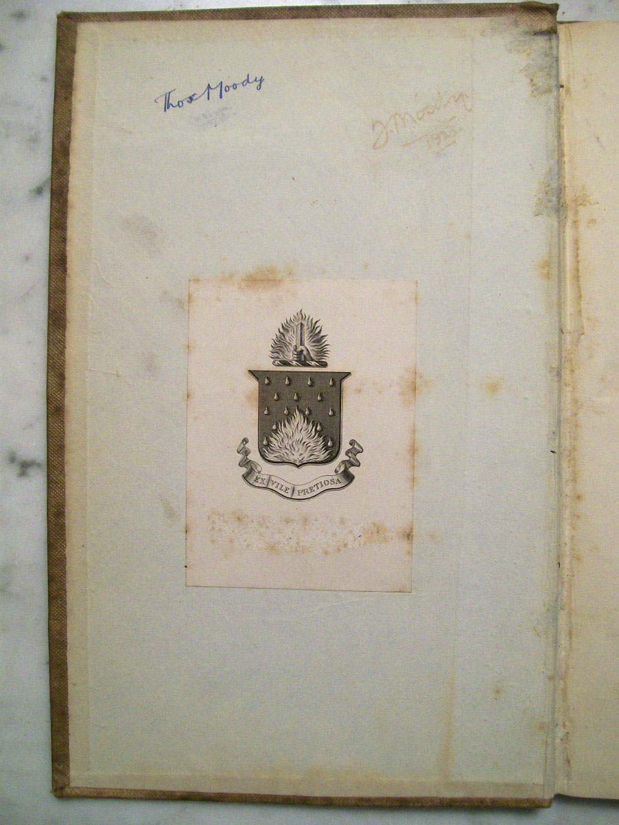 "An Explanation of the Gnomonic Projection of the Sphere", by Augustus De Morgan, was published by the Society for the Diffusion of Useful Knowledge in 1836. The book explains the construction and use of the their "Maps of the Stars" and "Six Maps of the Earth". The original owner of this book was Hugh Lee Pattinson, who was an English industrial chemist, known for developing a process for refining silver. He is also known for his early daguerreotype photographs, and he was also a fellow of the Royal Astronomical Society. His great granddaughter was Gertrude Bell. Hugh Pattinson's bookplate is present on the front endpaper, but someone erased his name. I was able to validate that the bookplate belonged to Hugh Pattinson. His arms Ex Vile Pretiosa (from base materials to precious ) reflect his discovery of the silver refining process.