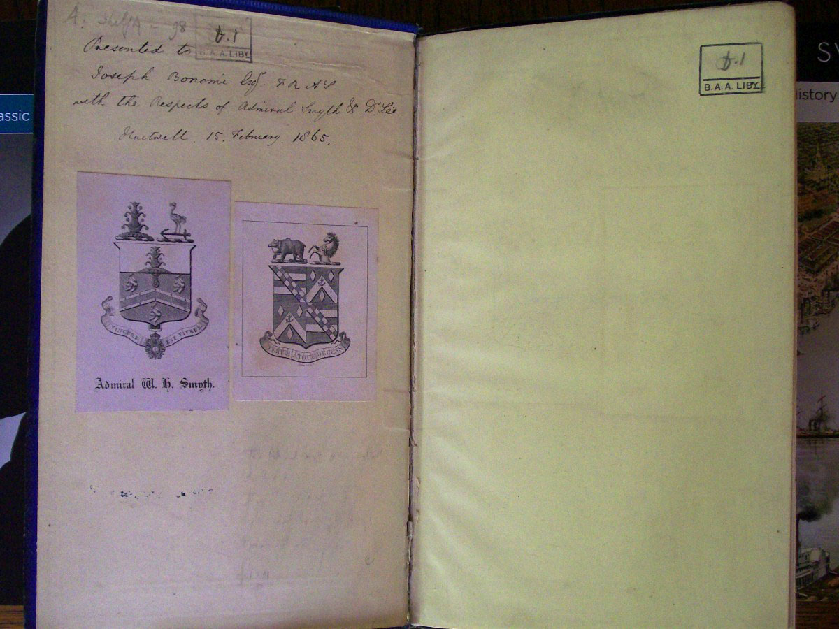 Here we have a presentation copy of Admiral Smyth's "Sidereal Chromatics", which is about the colors of double stars. The front endpaper has the bookplates of Smyth and the dedicatee, scientific colleague John Lee, with inscription to Joseph Bonomi, cataloguer of the Hartwell Collection of Egyptology and designer of at least one building on the Hartwell estate, where Smyth's astronomical observatory was. This copy was subsequently owned by the British Astronomical Association, with their rubber stamps on the title-page and front free endpaper.