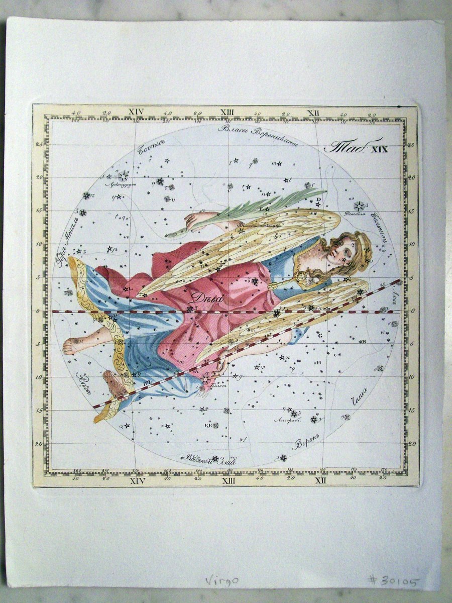 One print from Созвѣздія представленныя на XXX таблицах (roughly translates to "Presentation of Constellations in 30 Tables"). This print was obtained through PBA Galleries in San Francisco and came out of the collection of Nick Kanas, who is one of the world's authorities on celestial atlases. This print was not originally colored, but was hand colored at a later date. The atlas Созвѣздія представленныя на XXX таблицах was the first Russian celestial atlas, being published by Kornelius Reĭssig in 1829. There were two editions, one having the star charts printed with black stars on a white background, the other with the stars and constellation figures printed with bronze ink on a black background. There are only four complete copies of this atlas available in the United States making this a rather rare atlas and they are located at the Library of Congress, the Linda Hall Library in Kansas City, the Pennsylvania State University Library, and the Memorial Library at the University of Wisconsin. More information on Созвѣздія представленныя на XXX таблицах is available at the Library of Congress and the Linda Hall Library.