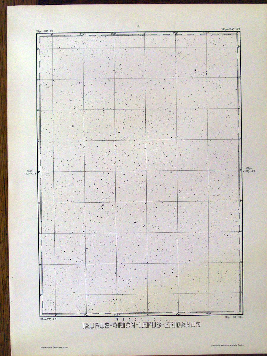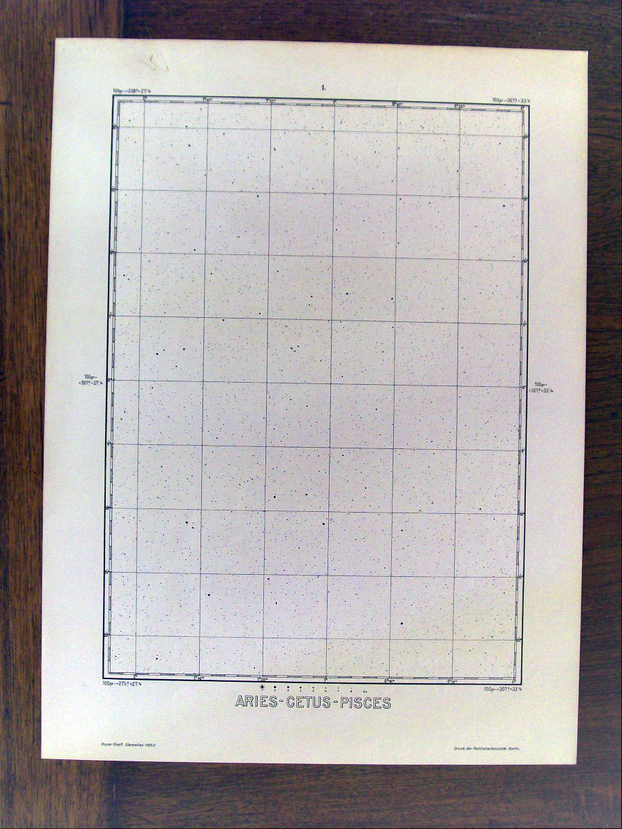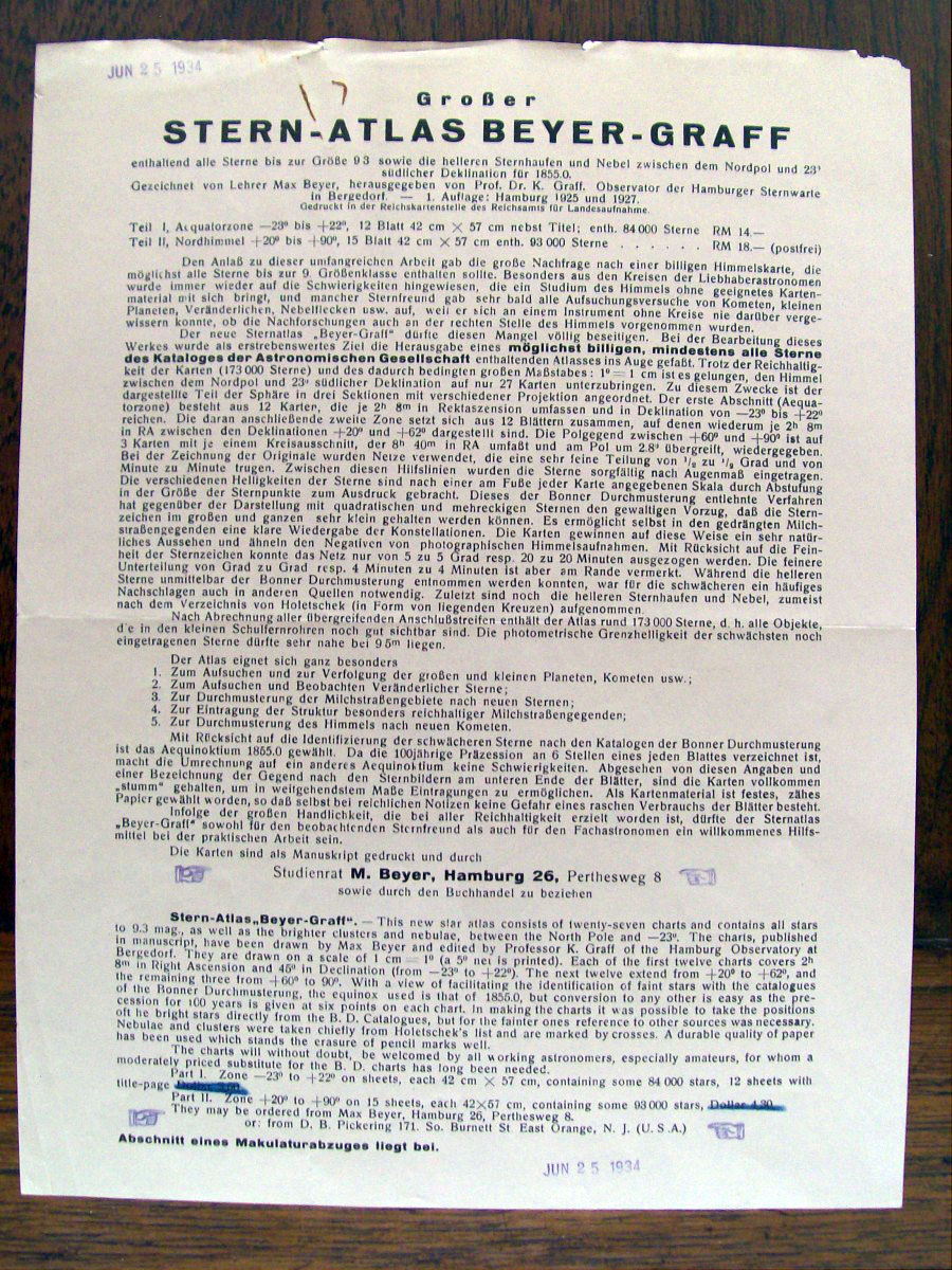 This is a German atlas of the northern sky produced in 1925 by the astronomers Max Beyer and Kasimir Graff. It was probably the favorite atlas among German amateurs until the Falkauer Atlas came out in 1963. This atlas contained 50,000 stars down to magnitude 9 on 27 large loose sheets that are 16.5 inches by 22.5 inches.