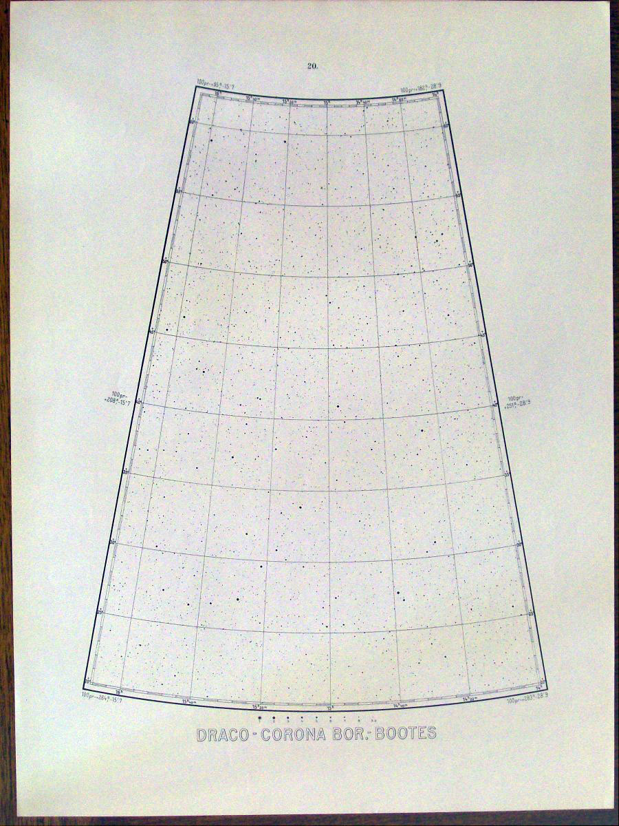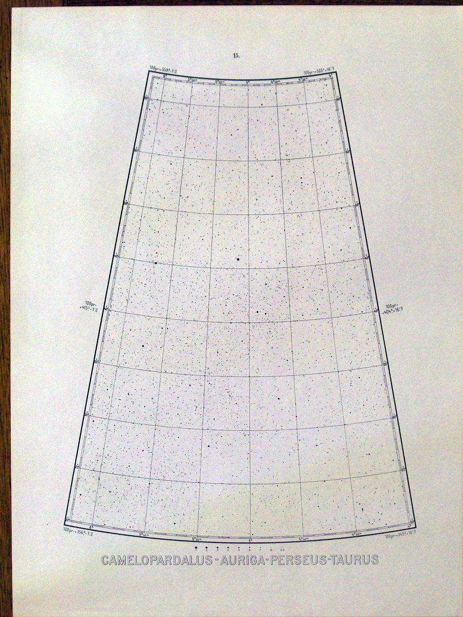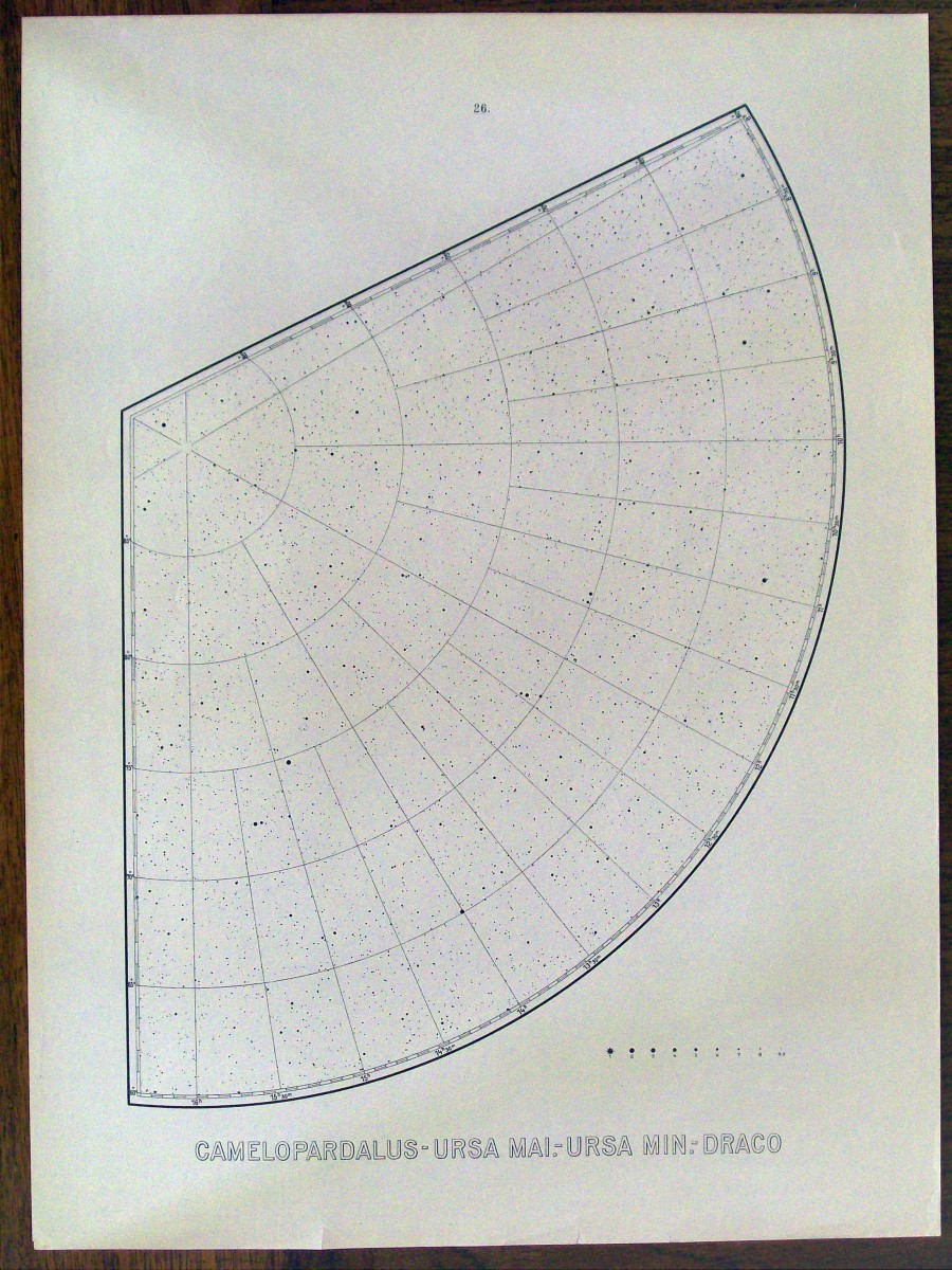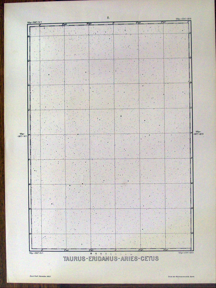 This is a German atlas of the northern sky produced in 1925 by the astronomers Max Beyer and Kasimir Graff. It was probably the favorite atlas among German amateurs until the Falkauer Atlas came out in 1963. This atlas contained 50,000 stars down to magnitude 9 on 27 large loose sheets that are 16.5 inches by 22.5 inches.