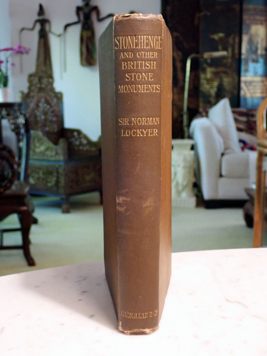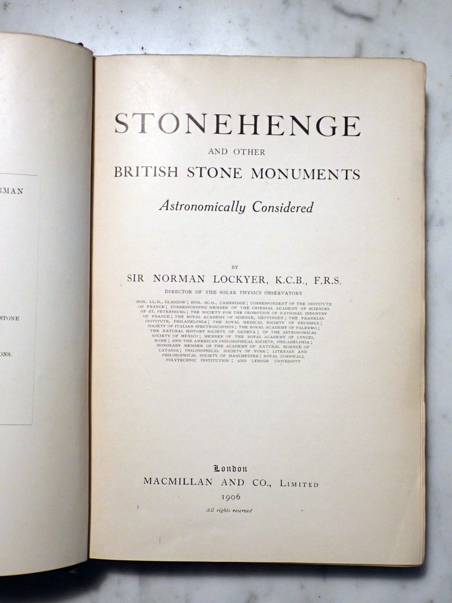 Here is a copy of Norman Lockyer's "Stonehenge and Other British Stone Monuments Astronomically Considered", published in 1906. Norman Lockyer was well known for his work in solar physics and spectroscopy, but he is also known for his work in archeoastronomy. This book along with "The Dawn of Astronomy" are his two major works in archeoastronomy. Some people even consider Lockyer as the founder of archeoastronomy.