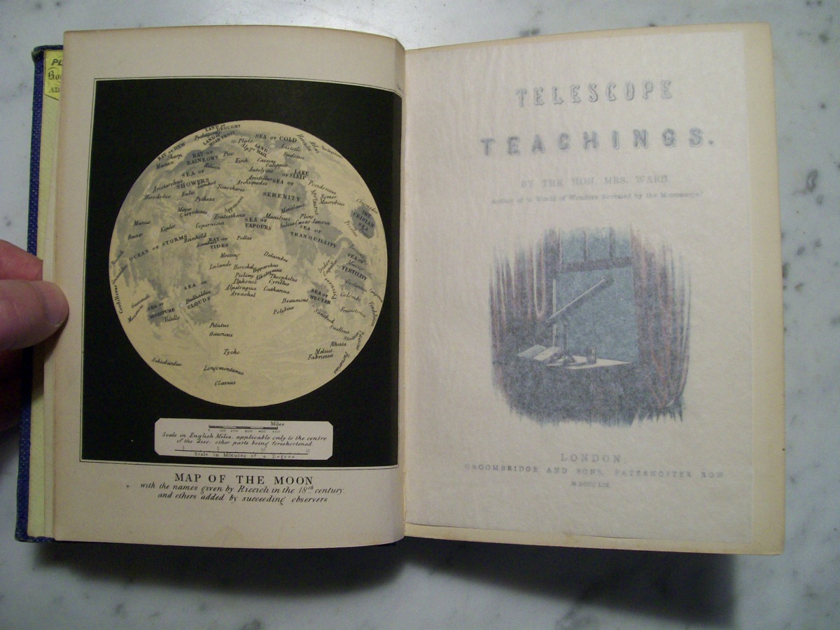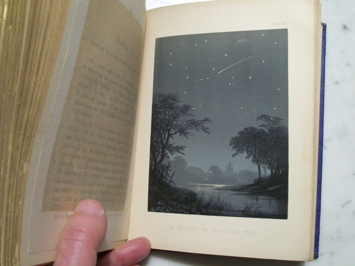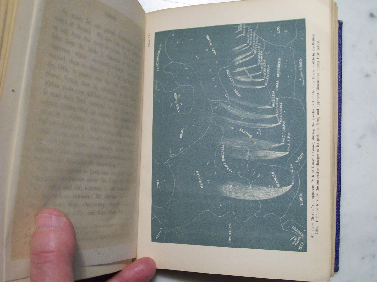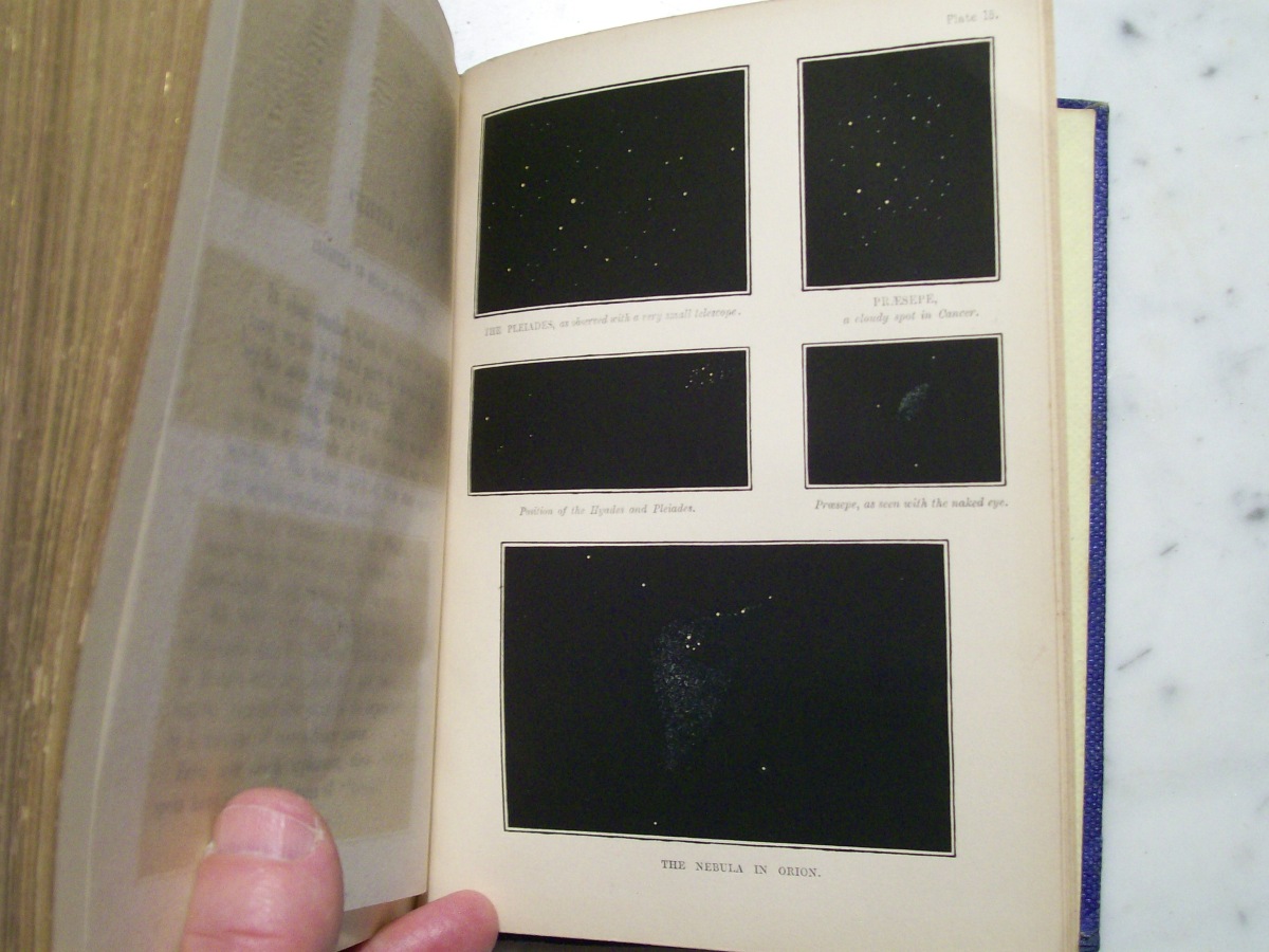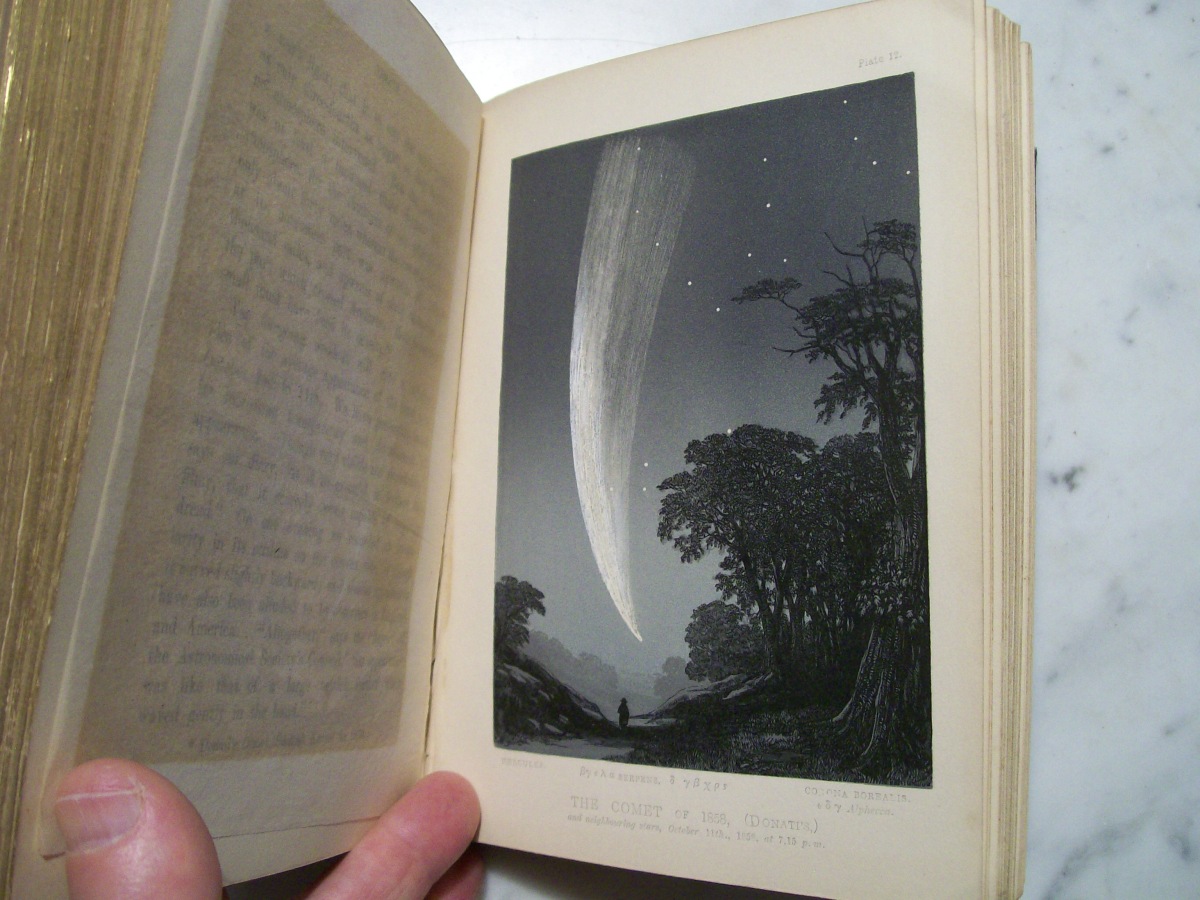 This lovely little book was written by the amateur astronomer Mrs. Mary Ward. She never intended this volume to be an astronomy textbook but rather an observing guide that describes what someone should be able to see through 2 inch refracting telescope. In addition, she goes into detail of her observations of Donati's Comet of 1858. One thing that I noticed about this book is that there is a gap between plates 3 and 5. It does not appear that plate 4 was ever present. I compared this volume with other volumes that were available online and they were also missing plate 4 so I would assume that is the way that the book was published. This copy was expertly rebacked at some point. At first I did not notice the rebacking but then I saw the indications of repair to the hinges and then closer inspection revealed that the spine had been replaced with the original cloth being preserved. Mary Ward was also known as a naturalist, microscopist and artist (she drew all of the illustrations in her books). Her other works are: "Sketches With the Microscope" (1857), "A World of Wonders, Revealed by the Microscope" (1857), "Entomology in Sport, and Entomology in Earnest" (1857), and "Microscope Teachings" (1864). She also holds the unfortunate distinction of being the first victim of an automobile accident. In 1869 she was visiting her cousins at Birr Castle when she fell off their steam powered automobile and broke her neck.