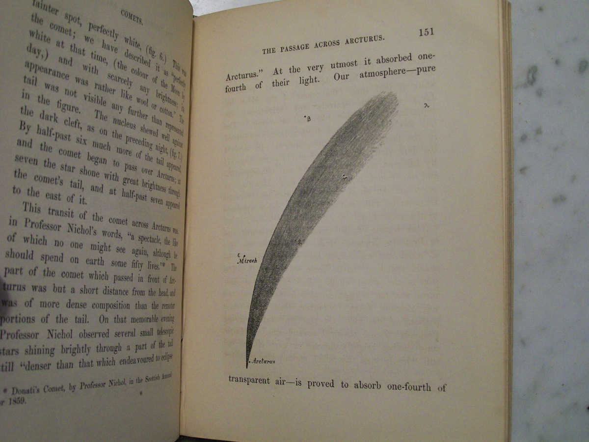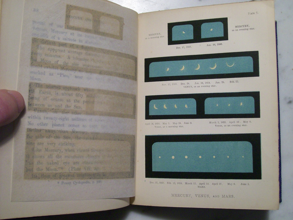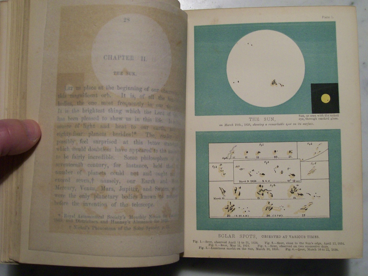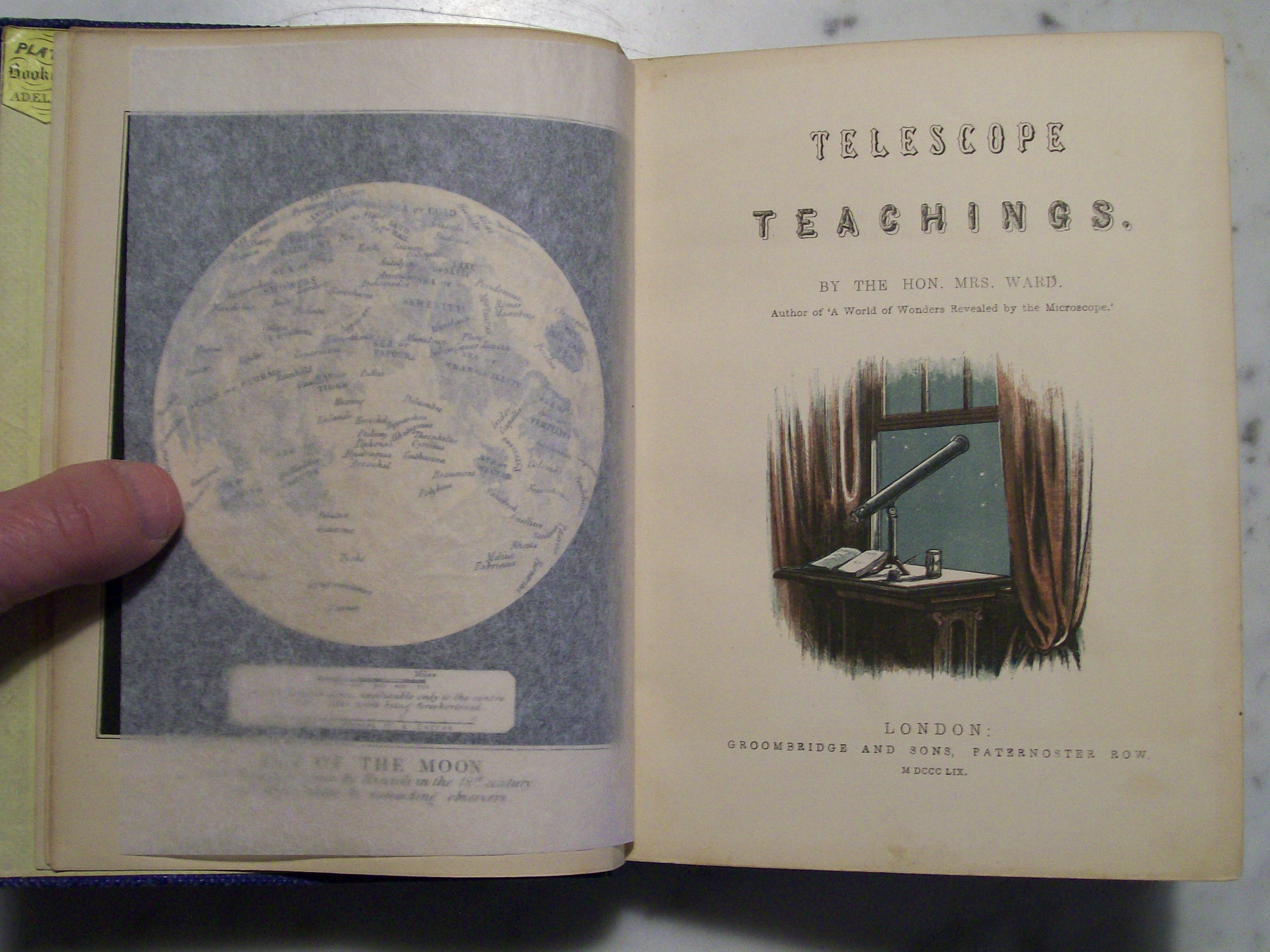 This lovely little book was written by the amateur astronomer Mrs. Mary Ward. She never intended this volume to be an astronomy textbook but rather an observing guide that describes what someone should be able to see through 2 inch refracting telescope. In addition, she goes into detail of her observations of Donati's Comet of 1858. One thing that I noticed about this book is that there is a gap between plates 3 and 5. It does not appear that plate 4 was ever present. I compared this volume with other volumes that were available online and they were also missing plate 4 so I would assume that is the way that the book was published. This copy was expertly rebacked at some point. At first I did not notice the rebacking but then I saw the indications of repair to the hinges and then closer inspection revealed that the spine had been replaced with the original cloth being preserved. Mary Ward was also known as a naturalist, microscopist and artist (she drew all of the illustrations in her books). Her other works are: "Sketches With the Microscope" (1857), "A World of Wonders, Revealed by the Microscope" (1857), "Entomology in Sport, and Entomology in Earnest" (1857), and "Microscope Teachings" (1864). She also holds the unfortunate distinction of being the first victim of an automobile accident. In 1869 she was visiting her cousins at Birr Castle when she fell off their steam powered automobile and broke her neck.