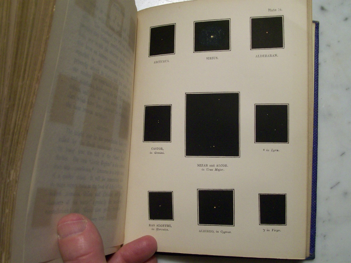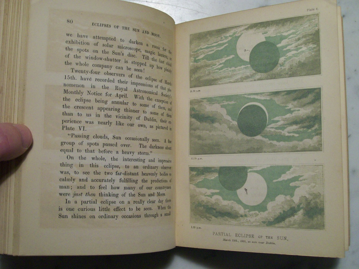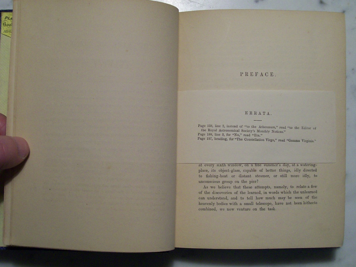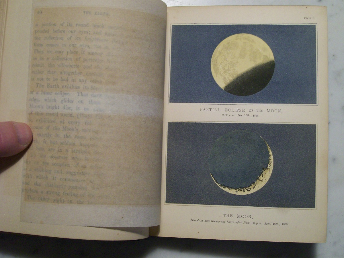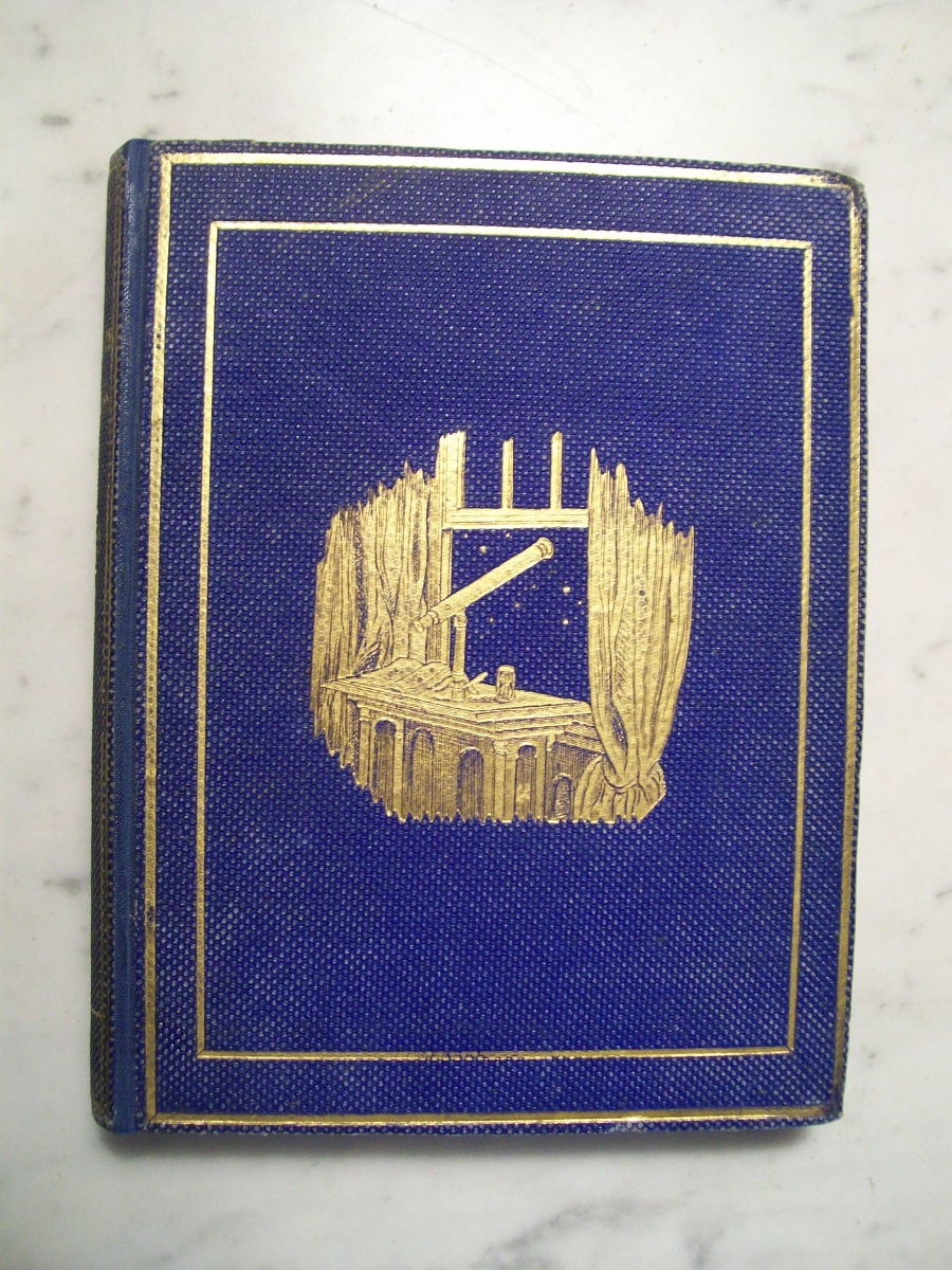 This lovely little book was written by the amateur astronomer Mrs. Mary Ward. She never intended this volume to be an astronomy textbook but rather an observing guide that describes what someone should be able to see through 2 inch refracting telescope. In addition, she goes into detail of her observations of Donati's Comet of 1858. One thing that I noticed about this book is that there is a gap between plates 3 and 5. It does not appear that plate 4 was ever present. I compared this volume with other volumes that were available online and they were also missing plate 4 so I would assume that is the way that the book was published. This copy was expertly rebacked at some point. At first I did not notice the rebacking but then I saw the indications of repair to the hinges and then closer inspection revealed that the spine had been replaced with the original cloth being preserved. Mary Ward was also known as a naturalist, microscopist and artist (she drew all of the illustrations in her books). Her other works are: "Sketches With the Microscope" (1857), "A World of Wonders, Revealed by the Microscope" (1857), "Entomology in Sport, and Entomology in Earnest" (1857), and "Microscope Teachings" (1864). She also holds the unfortunate distinction of being the first victim of an automobile accident. In 1869 she was visiting her cousins at Birr Castle when she fell off their steam powered automobile and broke her neck.