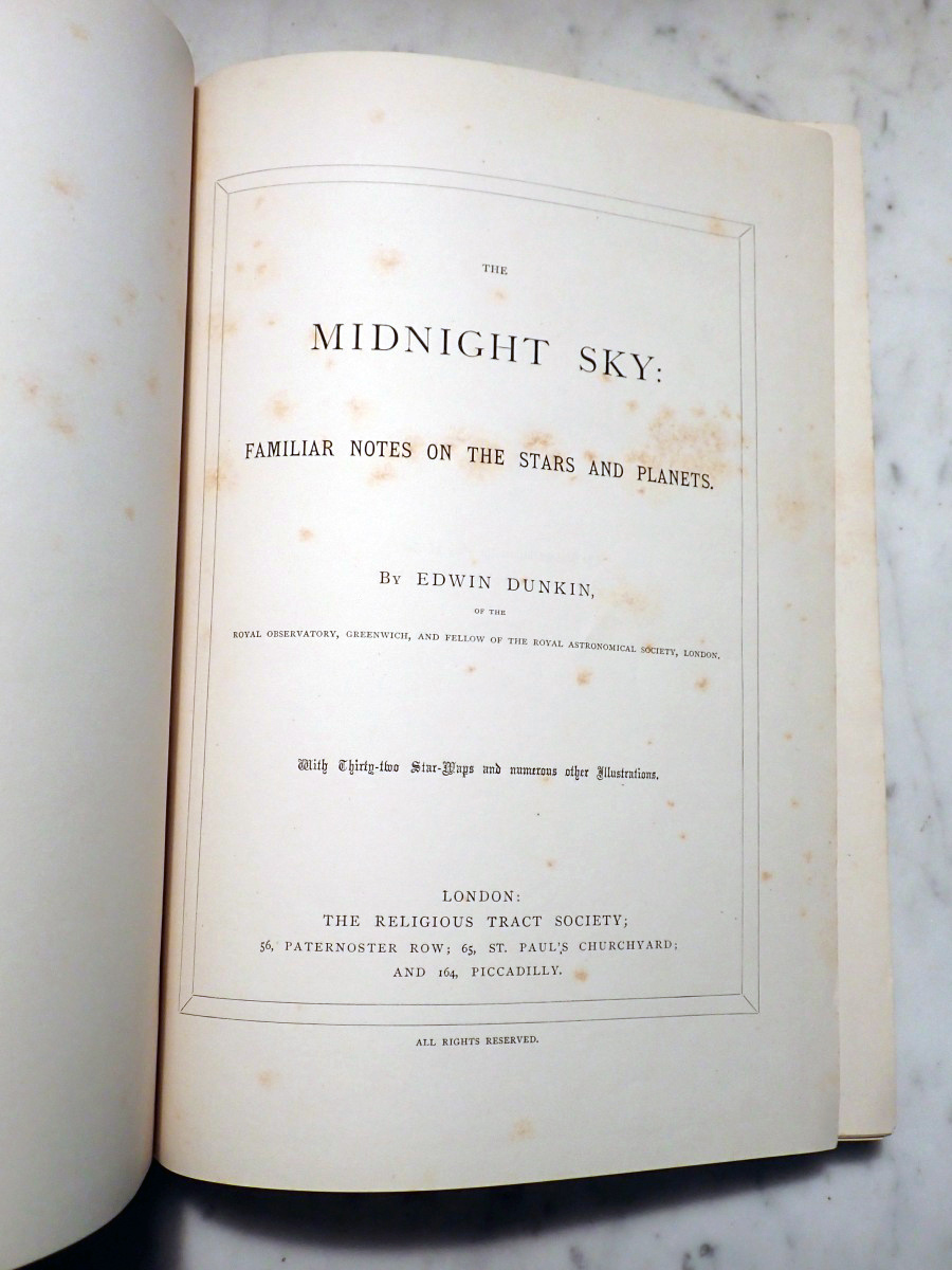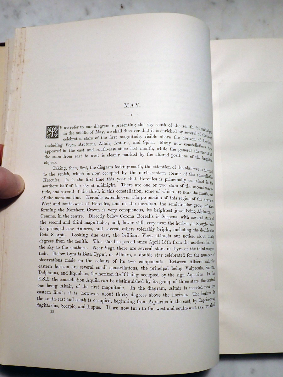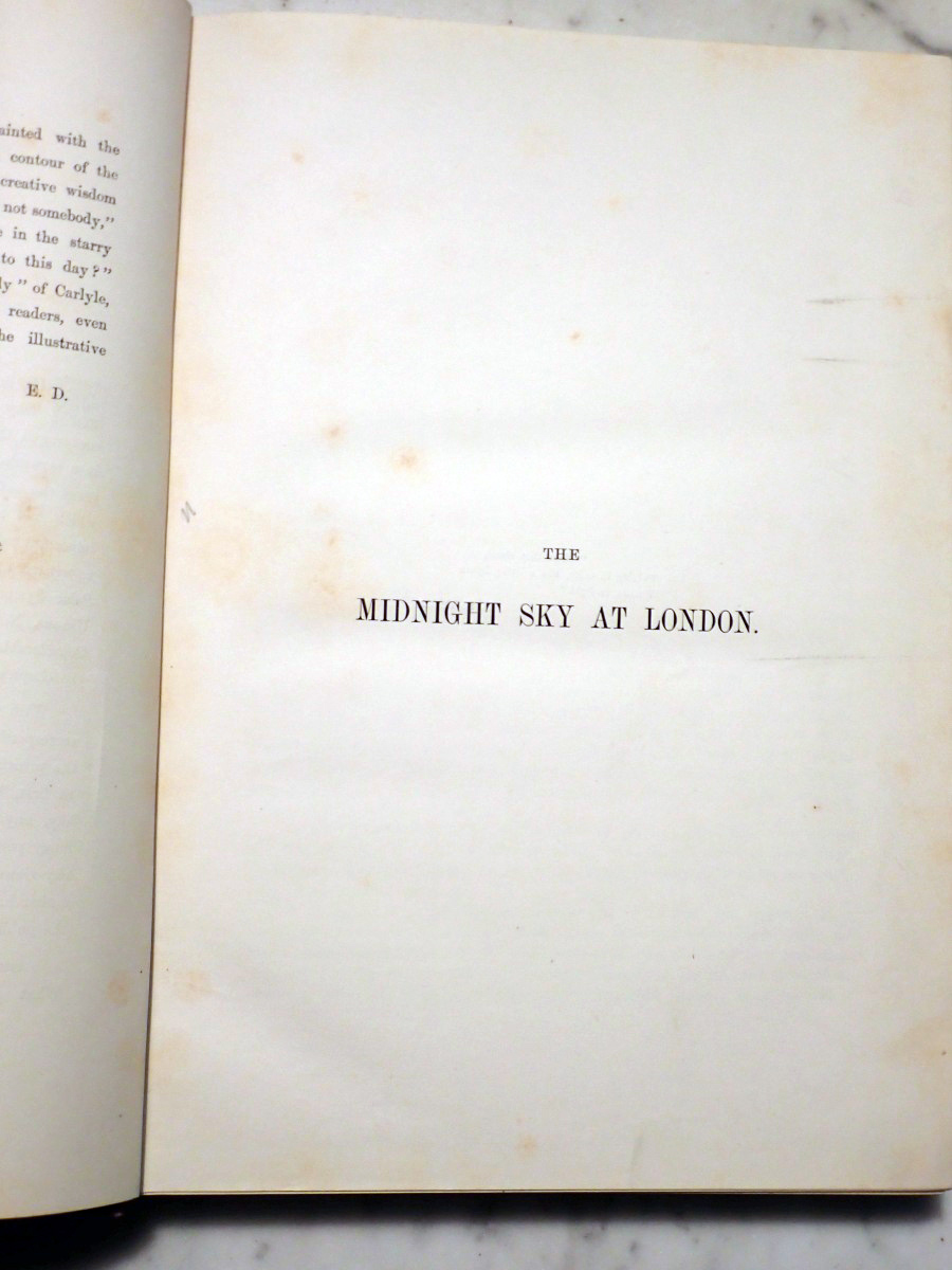 This lovely volume was published by The Religious Tract Society in 1869. It describes what an observer of the night sky could see from the city of London from month to month and it provides nice little star maps for each month showing the London skyline, with St. Paul's Cathedral displayed at the center of the skyline, and the Milky Way prominently shown in the sky. I doubt that anyone has seen anything like that over the London skyline since the mandatory blackouts of World War II.