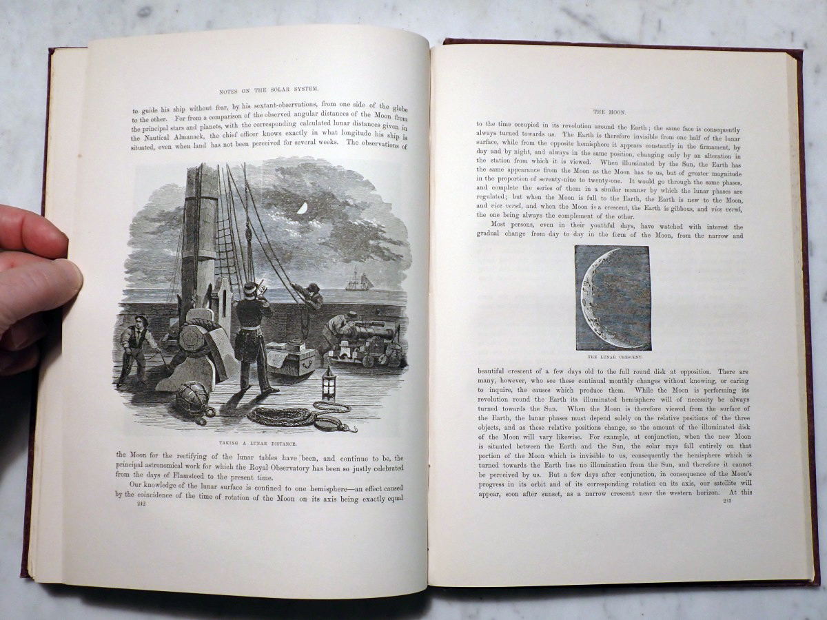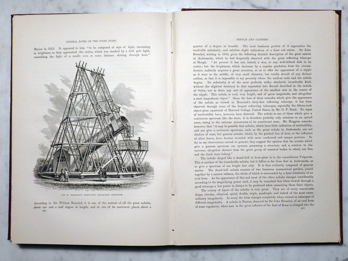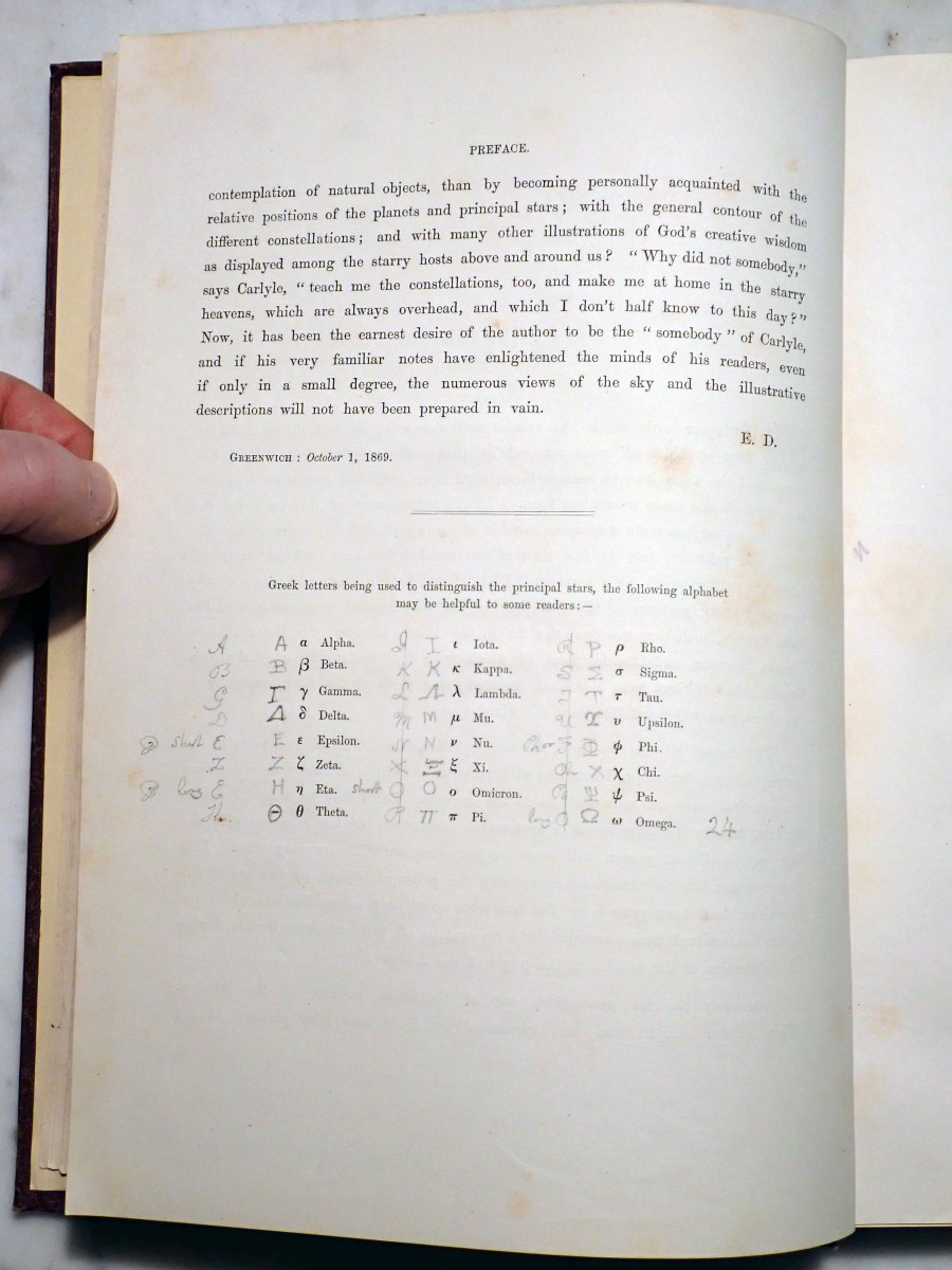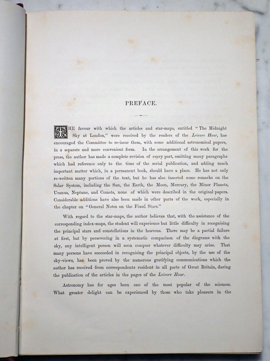 This lovely volume was published by The Religious Tract Society in 1869. It describes what an observer of the night sky could see from the city of London from month to month and it provides nice little star maps for each month showing the London skyline, with St. Paul's Cathedral displayed at the center of the skyline, and the Milky Way prominently shown in the sky. I doubt that anyone has seen anything like that over the London skyline since the mandatory blackouts of World War II.