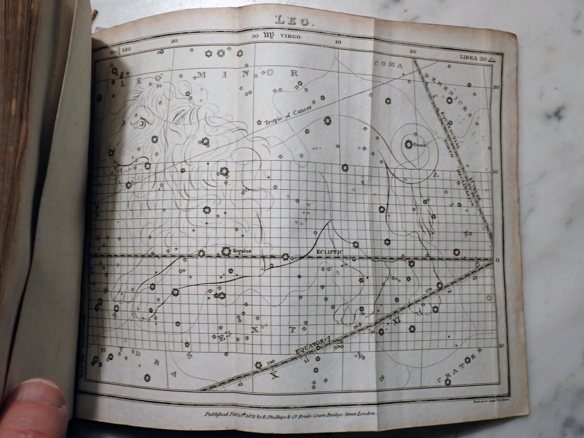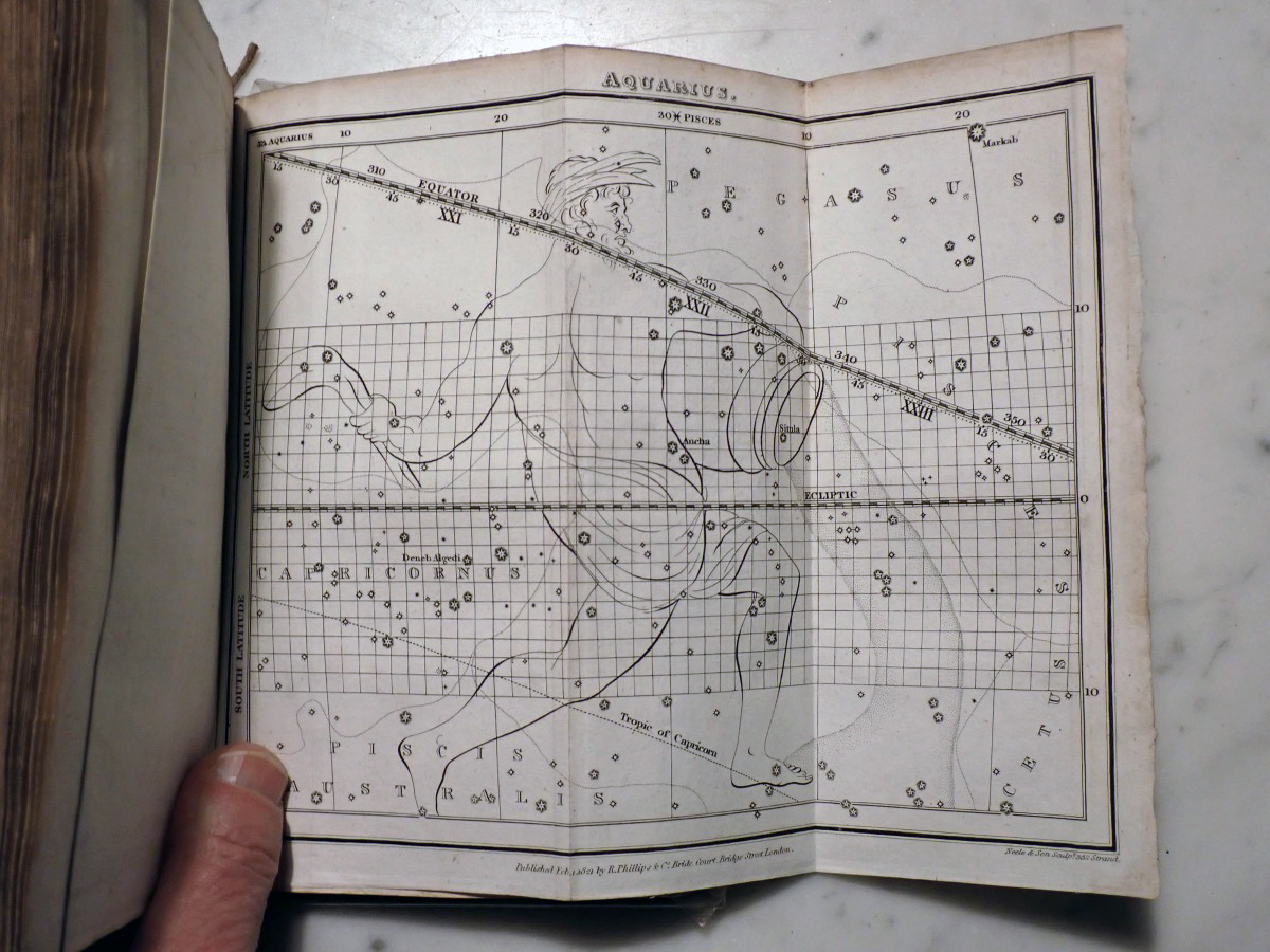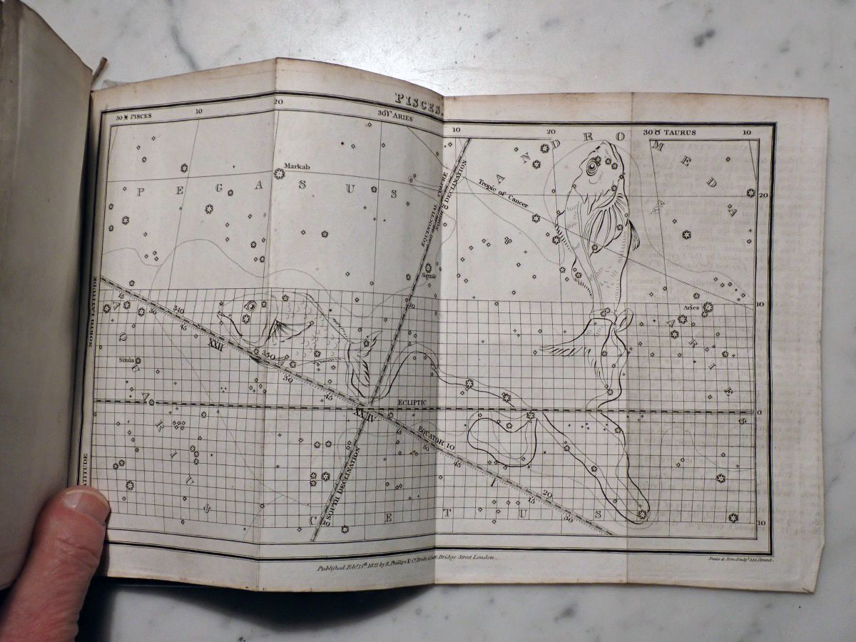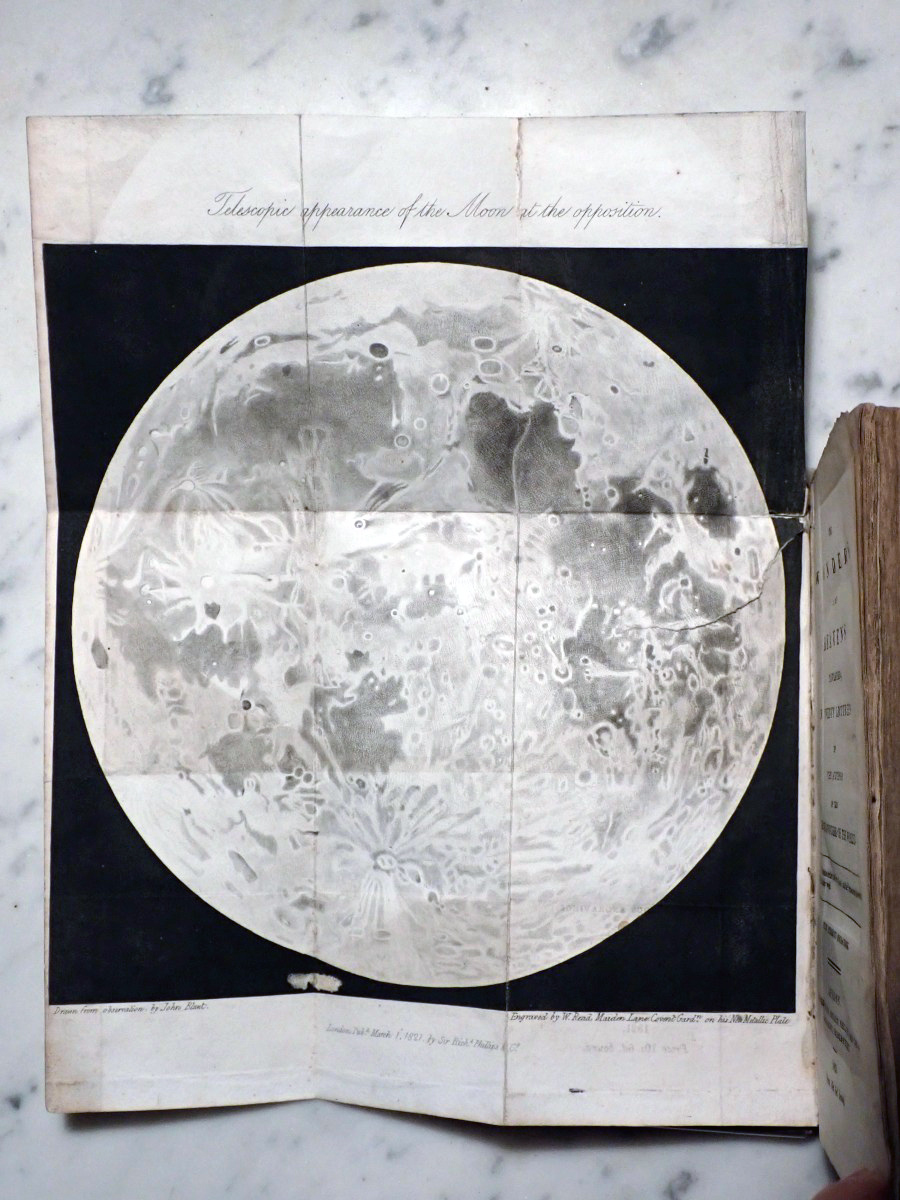 Here is a copy of "The Wonders of the Heavens" by Sir Richard Phillips, that was published 1821. There are 14 nice folding star charts in this book along with lots of other illustrations. The frontispiece consists of a very nice folding chart of the Moon. This is the only time that I have seen this book come up for sale and there are no copies available on AbeBooks. The Royal Astronomical Society of Canada used to sell a T-shirt with with an image of the lunar phases engraving from this book printed on it (see RASC T-shirt).
