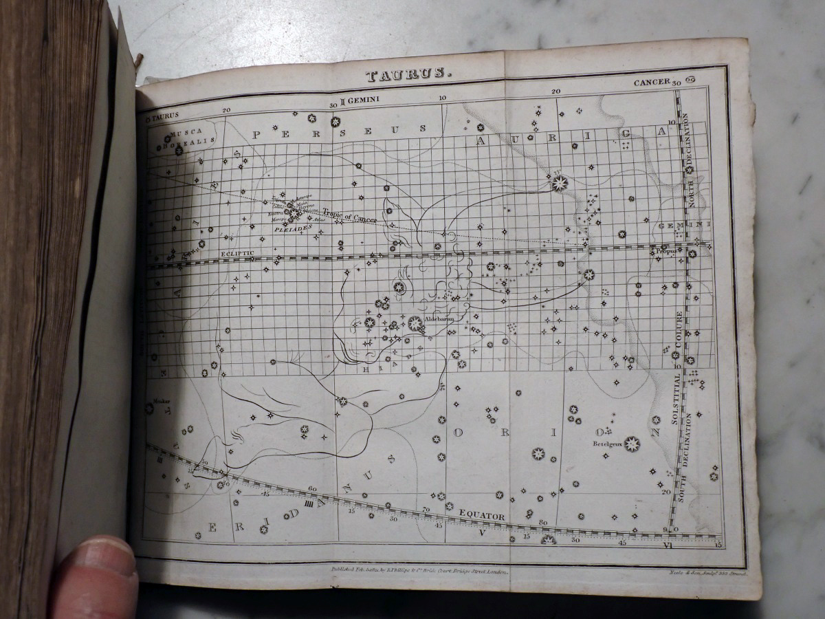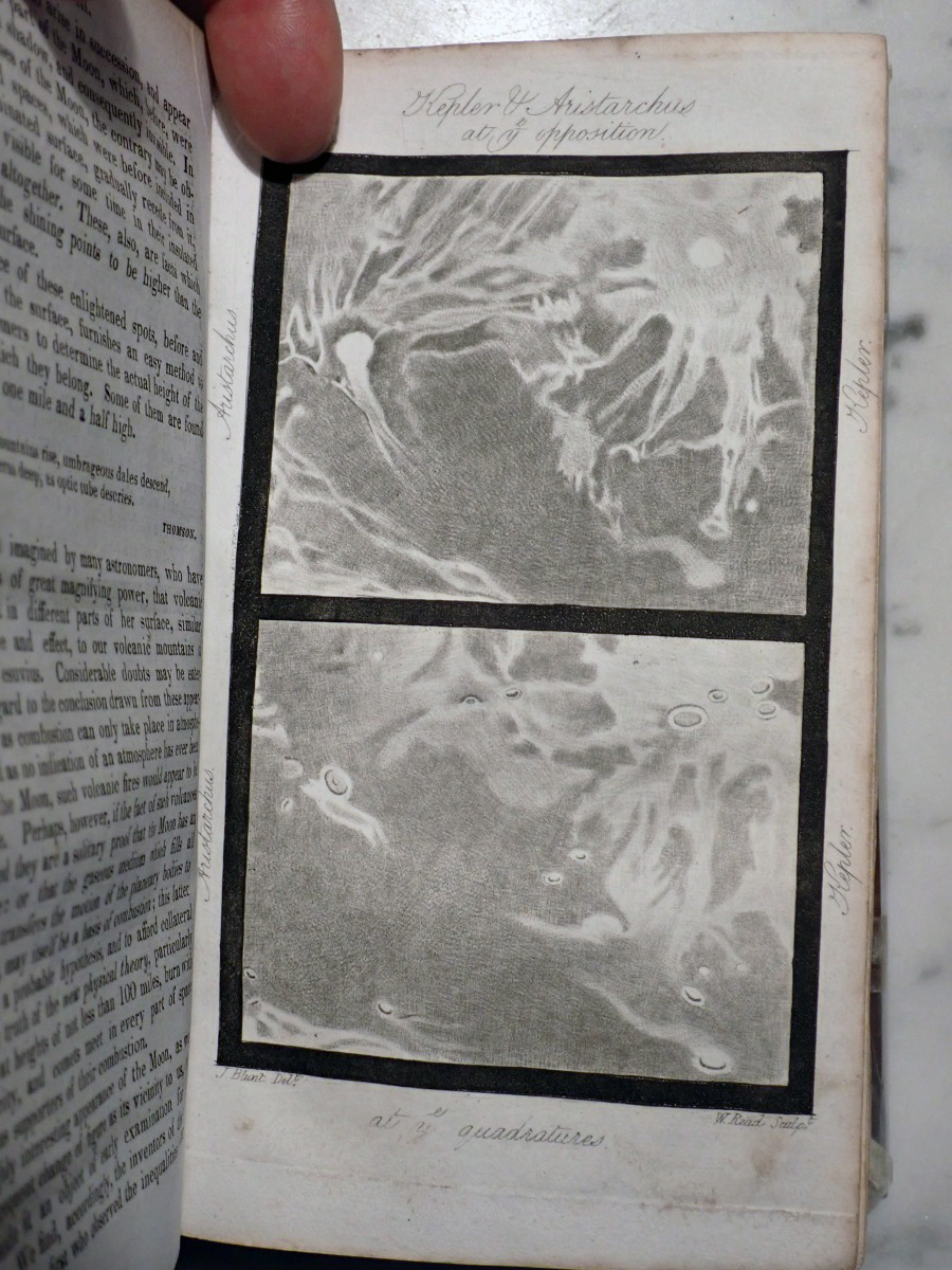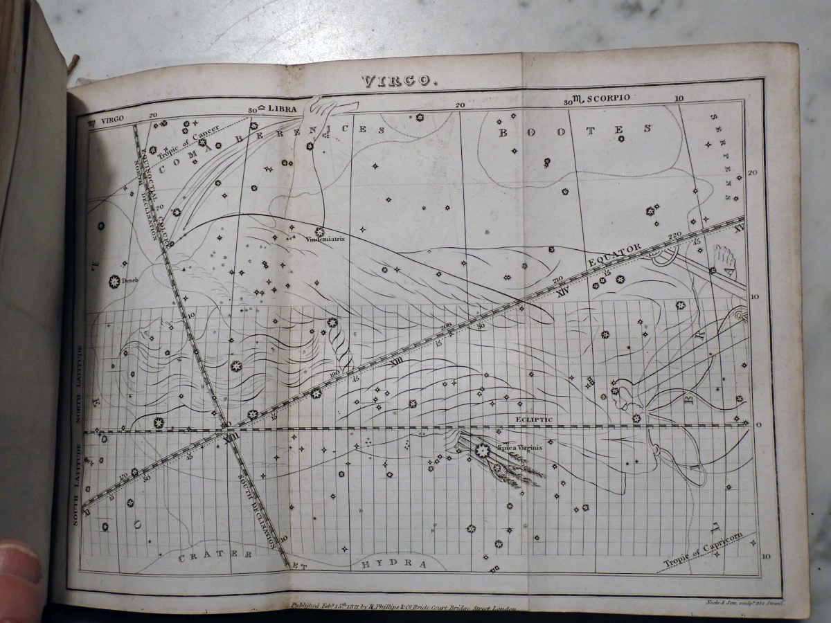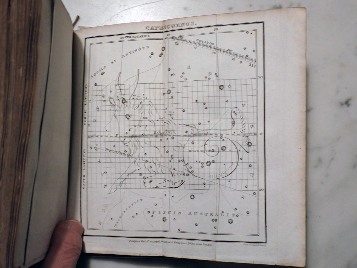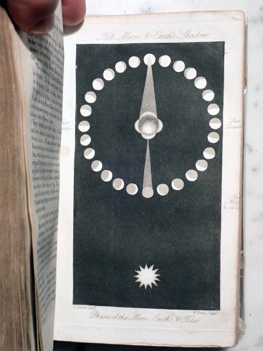 Here is a copy of "The Wonders of the Heavens" by Sir Richard Phillips, that was published 1821. There are 14 nice folding star charts in this book along with lots of other illustrations. The frontispiece consists of a very nice folding chart of the Moon. This is the only time that I have seen this book come up for sale and there are no copies available on AbeBooks. The Royal Astronomical Society of Canada used to sell a T-shirt with with an image of the lunar phases engraving from this book printed on it (see RASC T-shirt).
