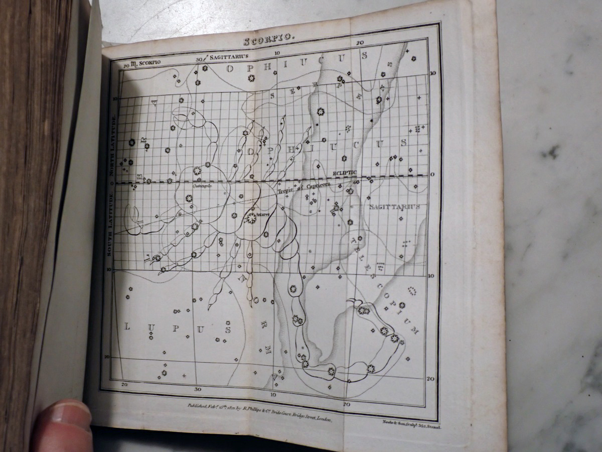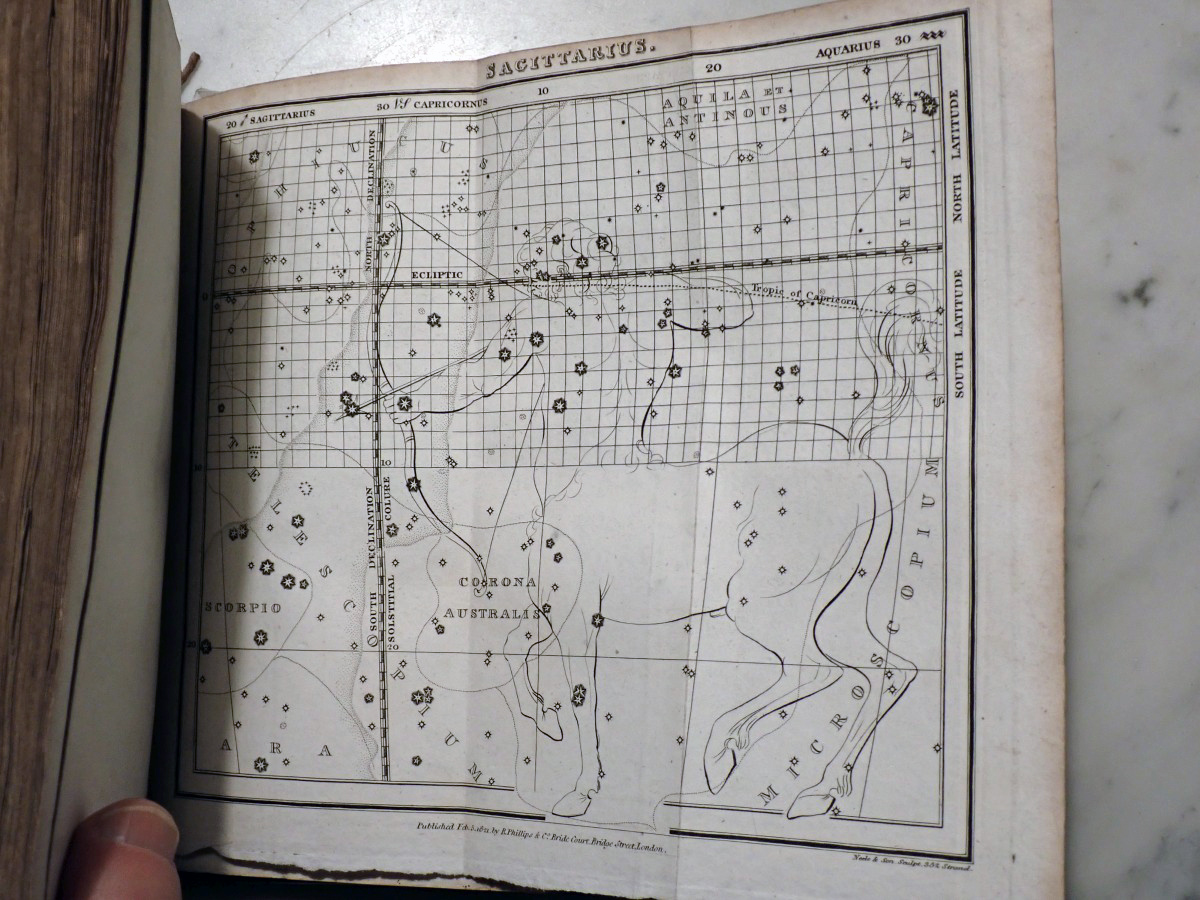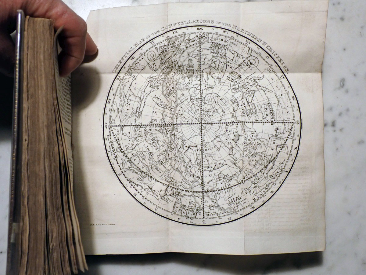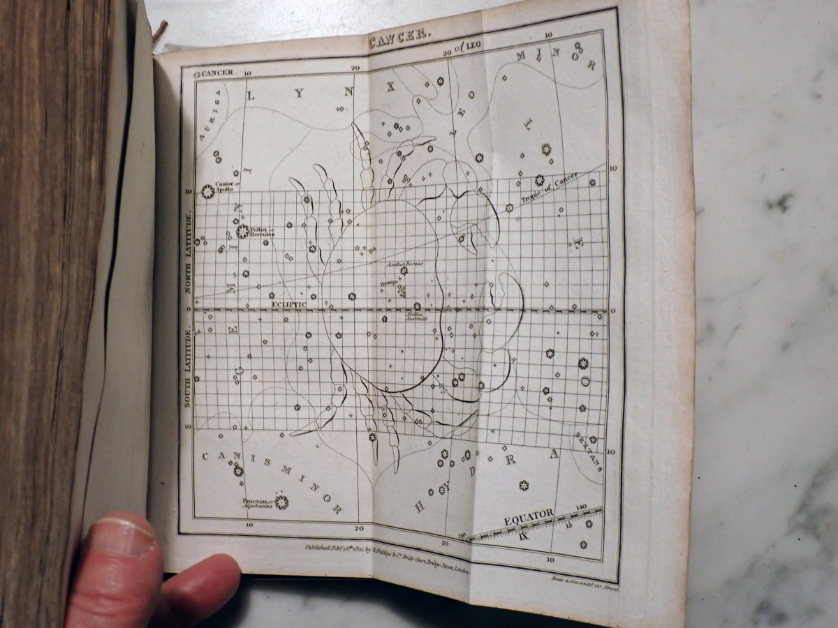 Here is a copy of "The Wonders of the Heavens" by Sir Richard Phillips, that was published 1821. There are 14 nice folding star charts in this book along with lots of other illustrations. The frontispiece consists of a very nice folding chart of the Moon. This is the only time that I have seen this book come up for sale and there are no copies available on AbeBooks. The Royal Astronomical Society of Canada used to sell a T-shirt with with an image of the lunar phases engraving from this book printed on it (see RASC T-shirt).