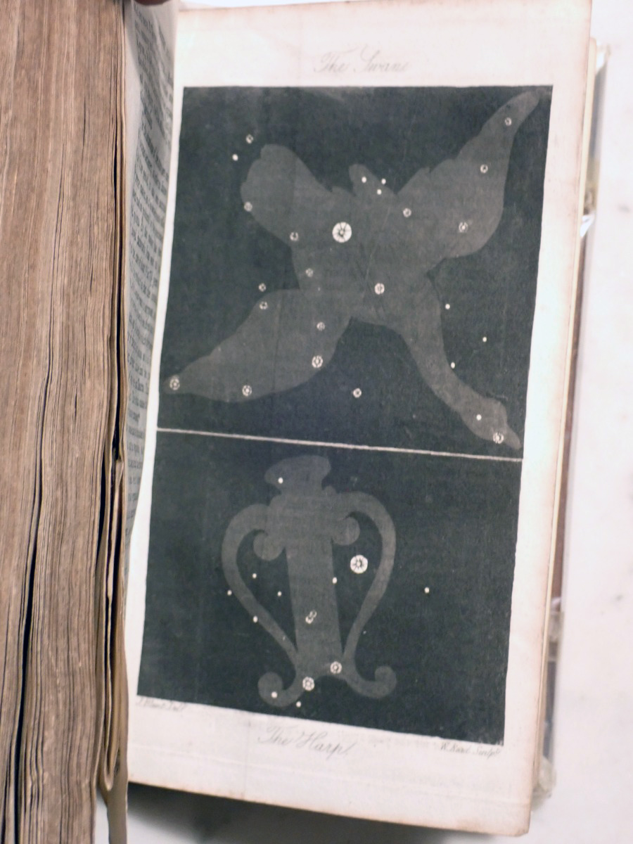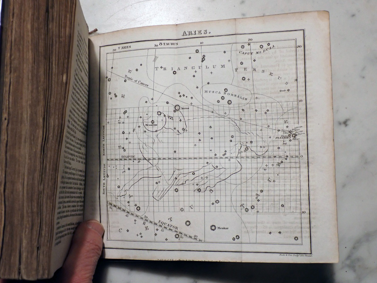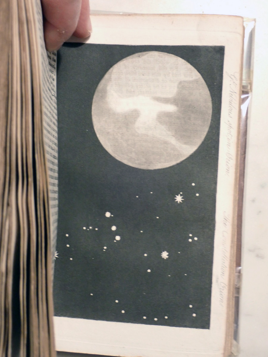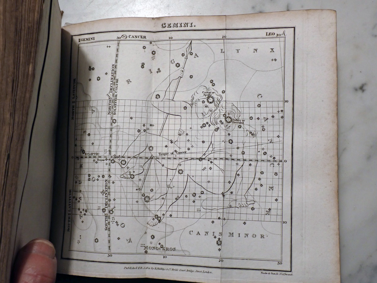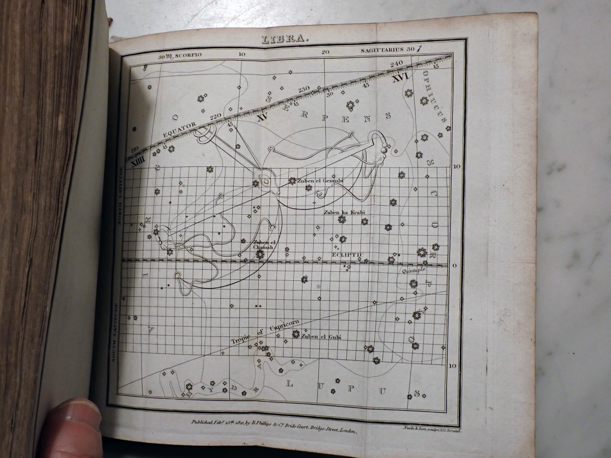 Here is a copy of "The Wonders of the Heavens" by Sir Richard Phillips, that was published 1821. There are 14 nice folding star charts in this book along with lots of other illustrations. The frontispiece consists of a very nice folding chart of the Moon. This is the only time that I have seen this book come up for sale and there are no copies available on AbeBooks. The Royal Astronomical Society of Canada used to sell a T-shirt with with an image of the lunar phases engraving from this book printed on it (see RASC T-shirt).