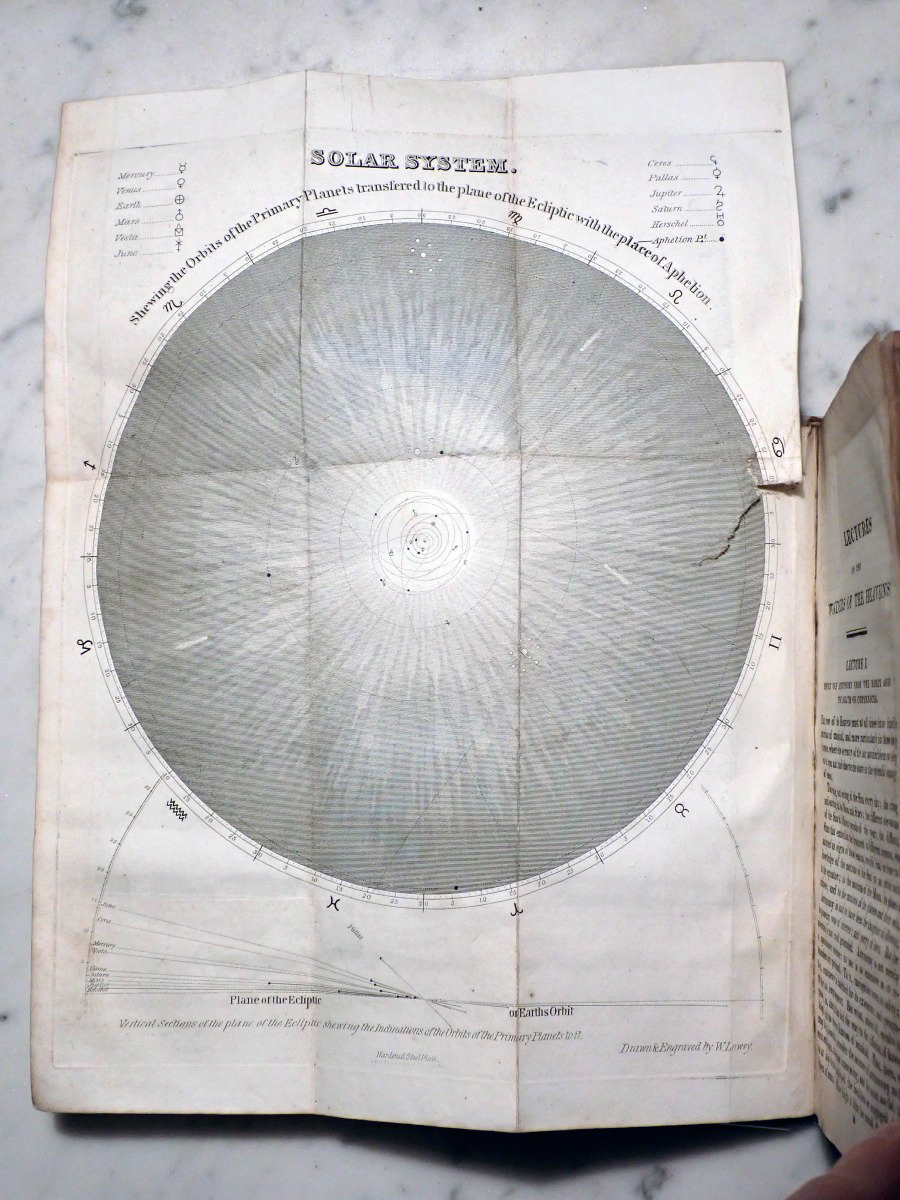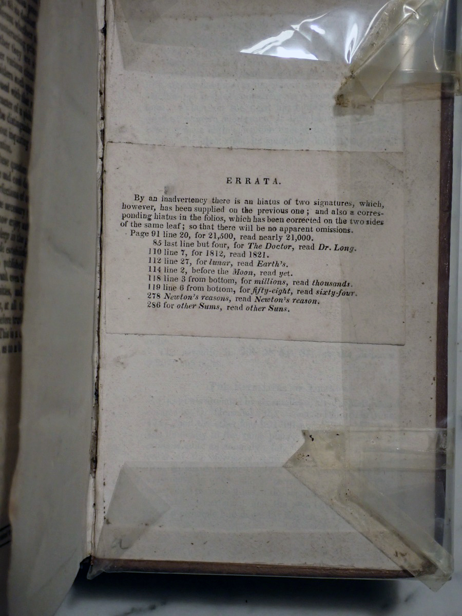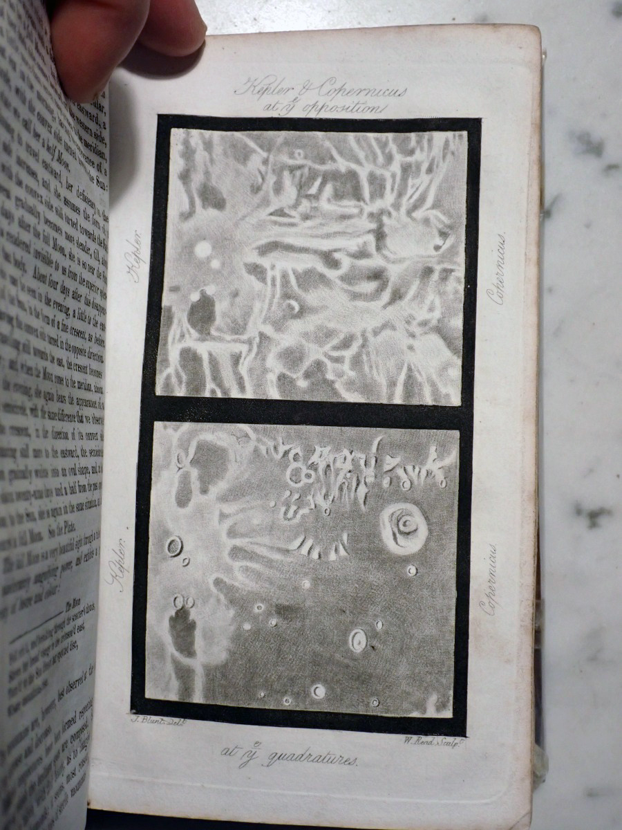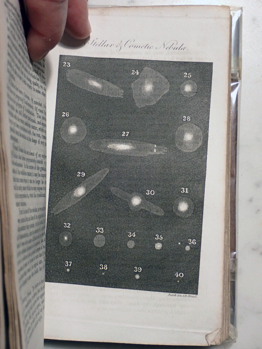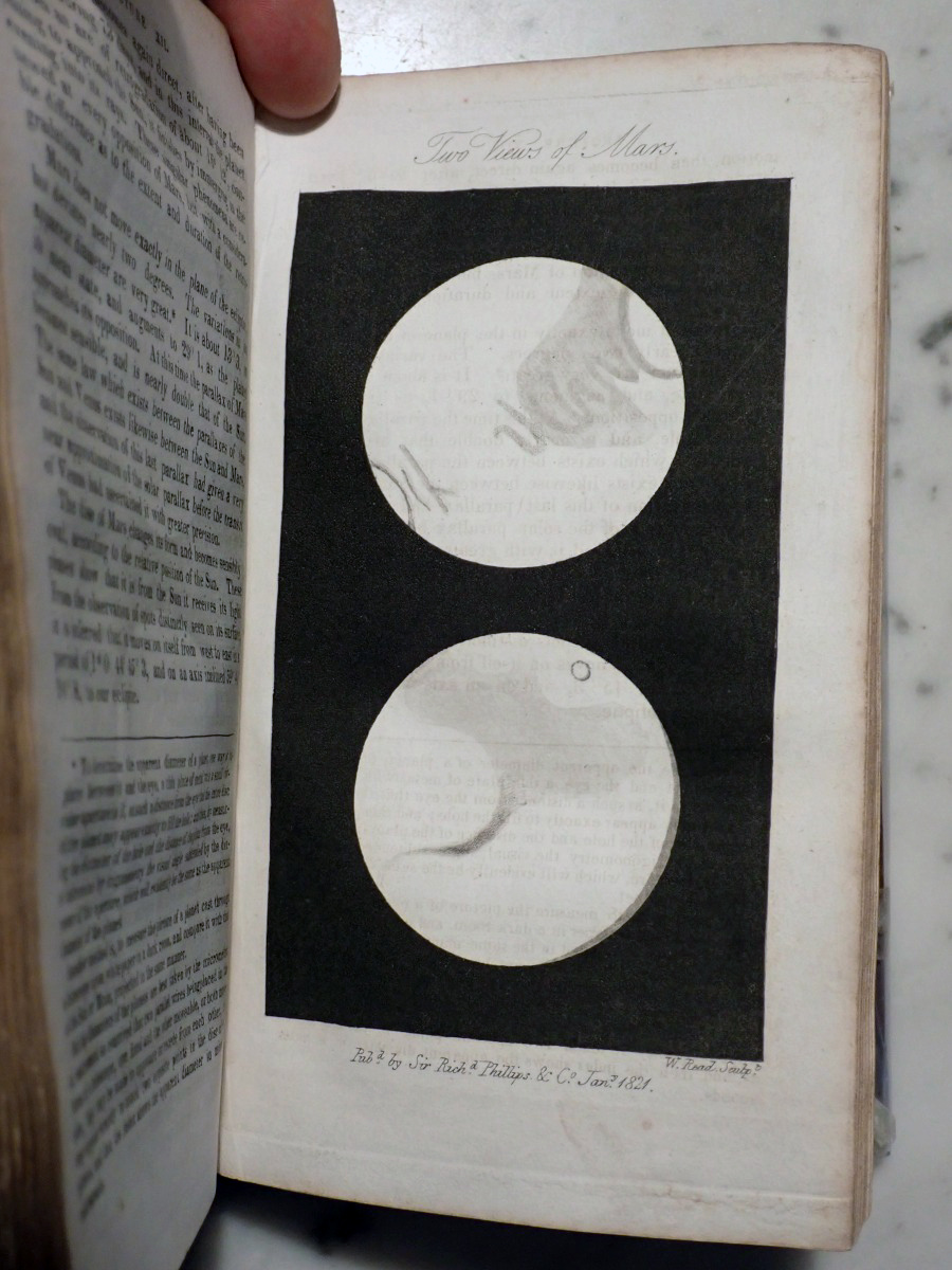 When I acquired this book I posted images of the plates on the Vintage Astronomy Books Facebook group and Bob McNaught noticed that I did not have the two foot long plate of the relative sizes of the planets that his 1821 edition has. The total number of plates in my copy is 47 and his copy has 51 plates. At first we thought that my copy had lost some of its plates over the years but when I checked the section of my copy that describes the plates there was only 47 plates included with my copy. The same section of Bob's copy describes 51 plates. We then looked at the errata at the end of my book and Bob found that his copy has all of the corrections described in the errata of my copy. So it turns out that there were at least two editions published in 1821, but the author, who was also the publisher, did not indicate that they were different editions. My copy appears to be the earliest known version of the 1821 edition.