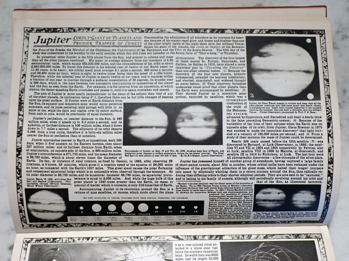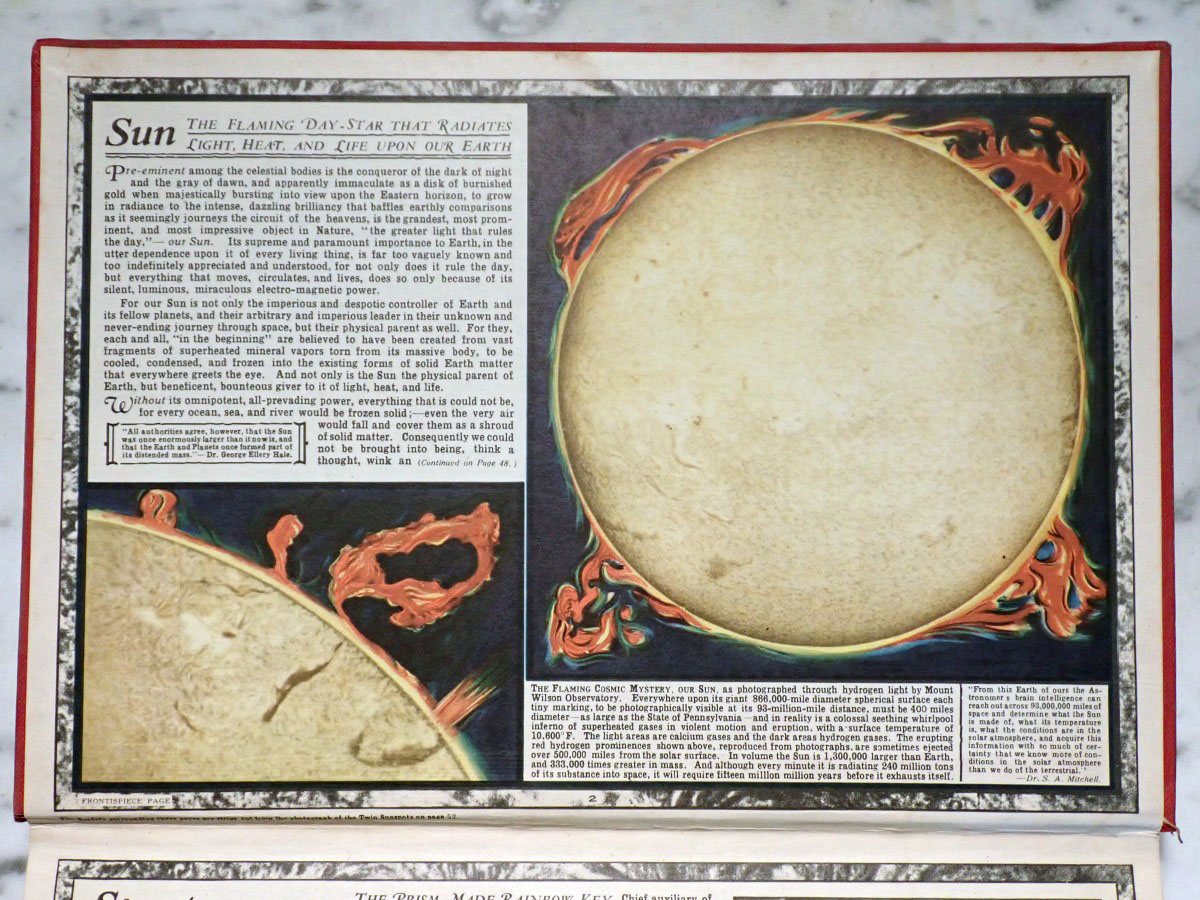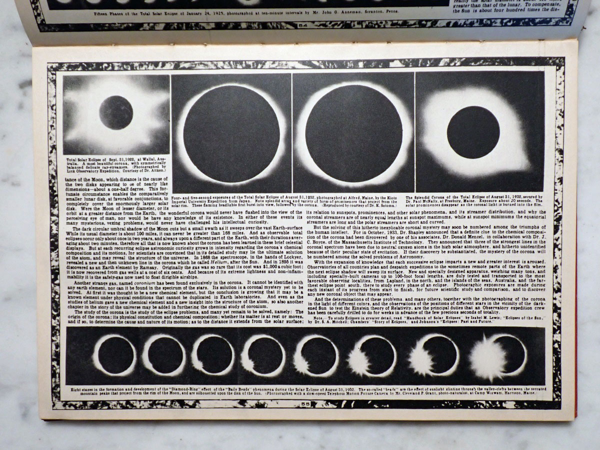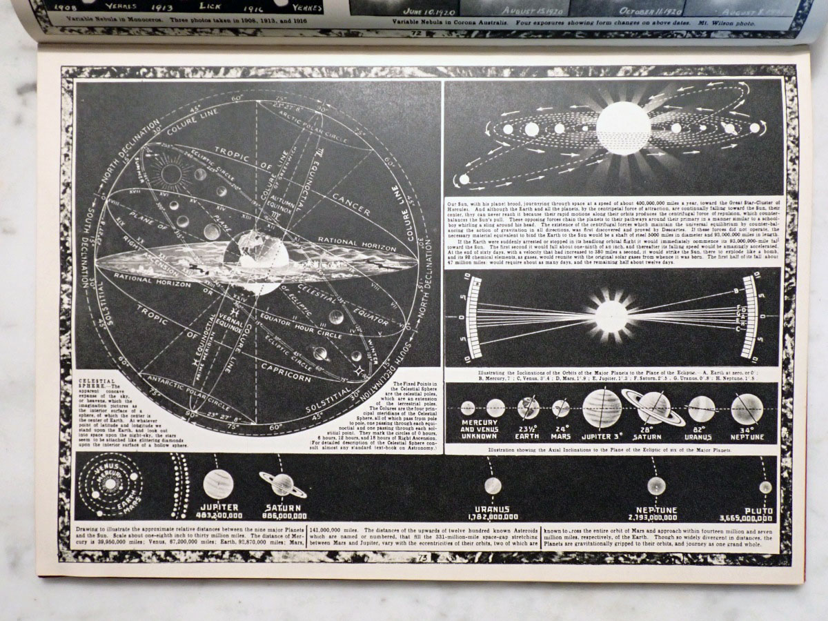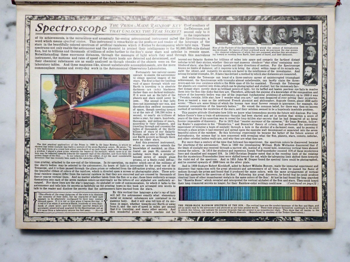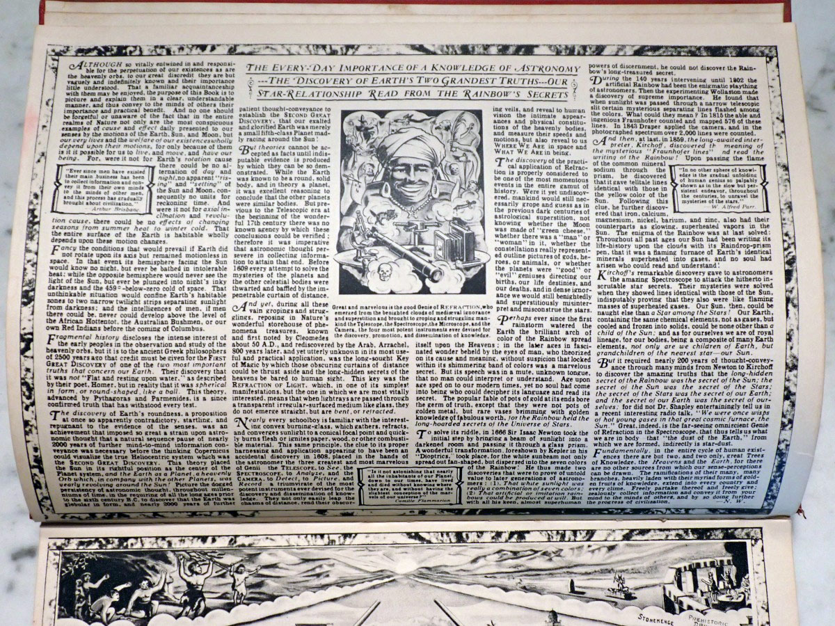 Here is an interesting astronomy picture book titled "Unveiling the Universe: Where We Are and What We Are as Told by the Telescope and Spectroscope" that was published in 1936 by Norton Wagner. The publishing company "The Research Publishers" did not waste any space in this book by filling the endpapers and flyleaves with text and pictures. The layout of this book feels much like a newspaper because the text is laid out in columns and the reader is occasionally directed to turn to another page for the continuation what they are reading. For example, the section on the spectroscope that starts on the front flyleaf continues on page 71. This book is also different in that the frontispiece starts on the front endpaper and continues on both sides of the front flyleaf. All three frontispiece parts are clearly labeled 'frontispiece' in the bottom left corners. The pagination is also a bit off in that the front endpaper is page 2. It looks like the publisher was more interested in making the book visually appealing, by maximizing the number of pictures and information within the book, than adhering to a normal book layout. Another thing about the book that is odd is the strong chemical odor throughout the pages. There are no signs that anything has ever been spilled on the book so I think the odor may be a byproduct of the printing process that was used. When I search for information on the publisher I am unable to find anything. A search for books printed by the publisher on ABE Books only turns up a couple other copies of this title so perhaps the publisher was very short lived since 1936 was at the depth of the Great Depression.
