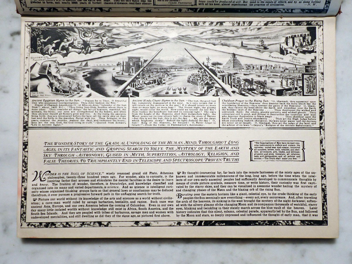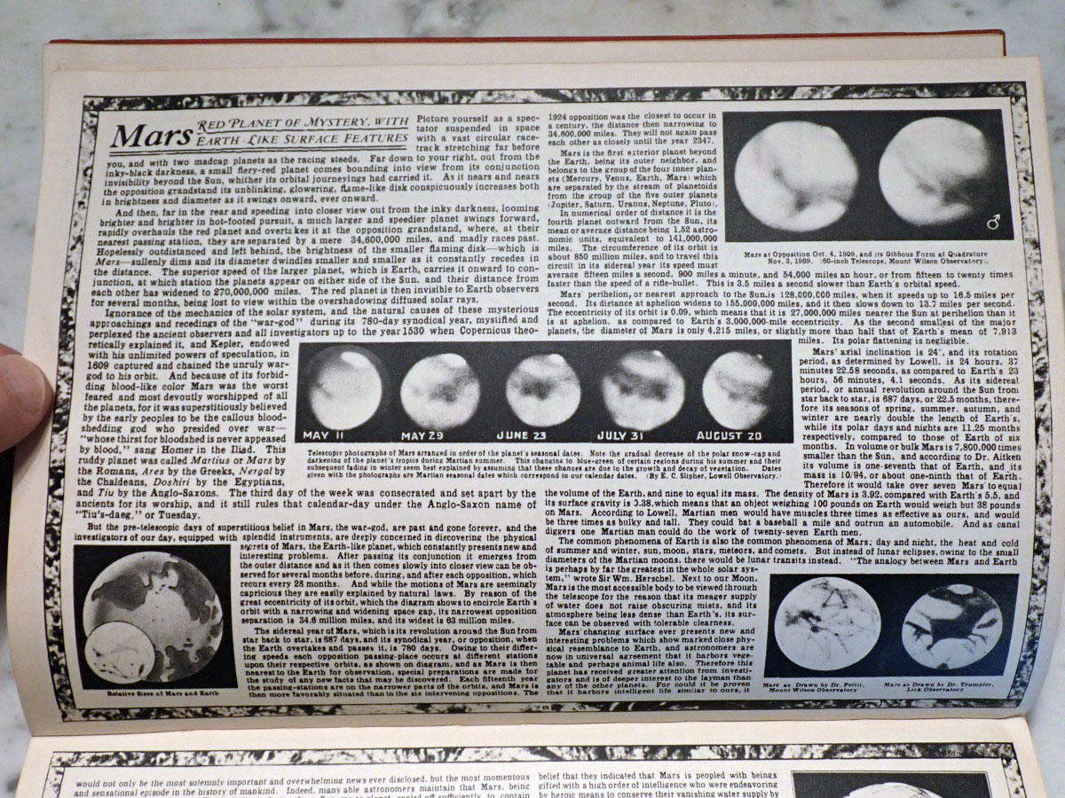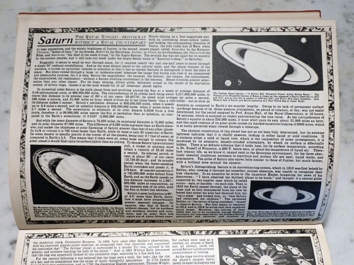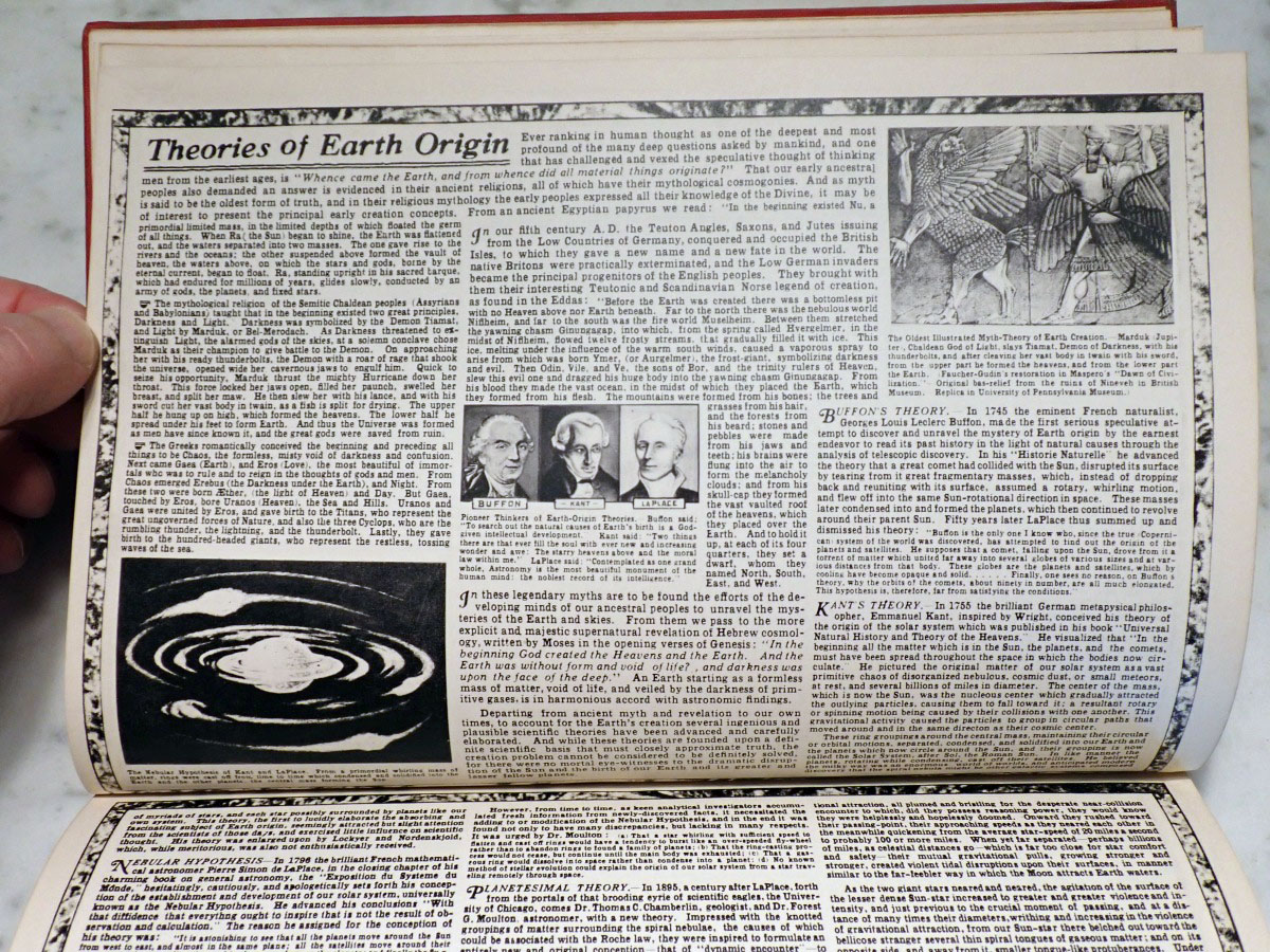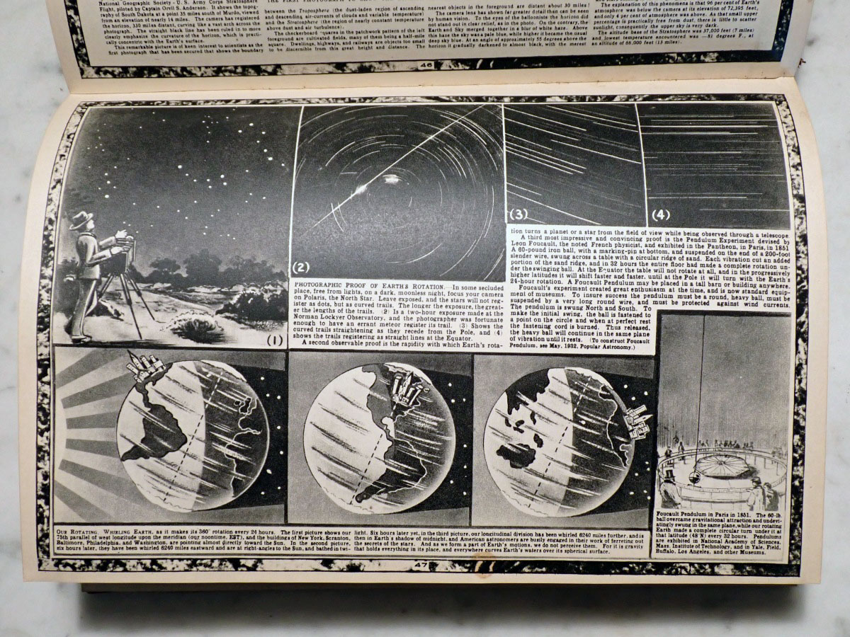 Here is an interesting astronomy picture book titled "Unveiling the Universe: Where We Are and What We Are as Told by the Telescope and Spectroscope" that was published in 1936 by Norton Wagner. The publishing company "The Research Publishers" did not waste any space in this book by filling the endpapers and flyleaves with text and pictures. The layout of this book feels much like a newspaper because the text is laid out in columns and the reader is occasionally directed to turn to another page for the continuation what they are reading. For example, the section on the spectroscope that starts on the front flyleaf continues on page 71. This book is also different in that the frontispiece starts on the front endpaper and continues on both sides of the front flyleaf. All three frontispiece parts are clearly labeled 'frontispiece' in the bottom left corners. The pagination is also a bit off in that the front endpaper is page 2. It looks like the publisher was more interested in making the book visually appealing, by maximizing the number of pictures and information within the book, than adhering to a normal book layout. Another thing about the book that is odd is the strong chemical odor throughout the pages. There are no signs that anything has ever been spilled on the book so I think the odor may be a byproduct of the printing process that was used. When I search for information on the publisher I am unable to find anything. A search for books printed by the publisher on ABE Books only turns up a couple other copies of this title so perhaps the publisher was very short lived since 1936 was at the depth of the Great Depression.