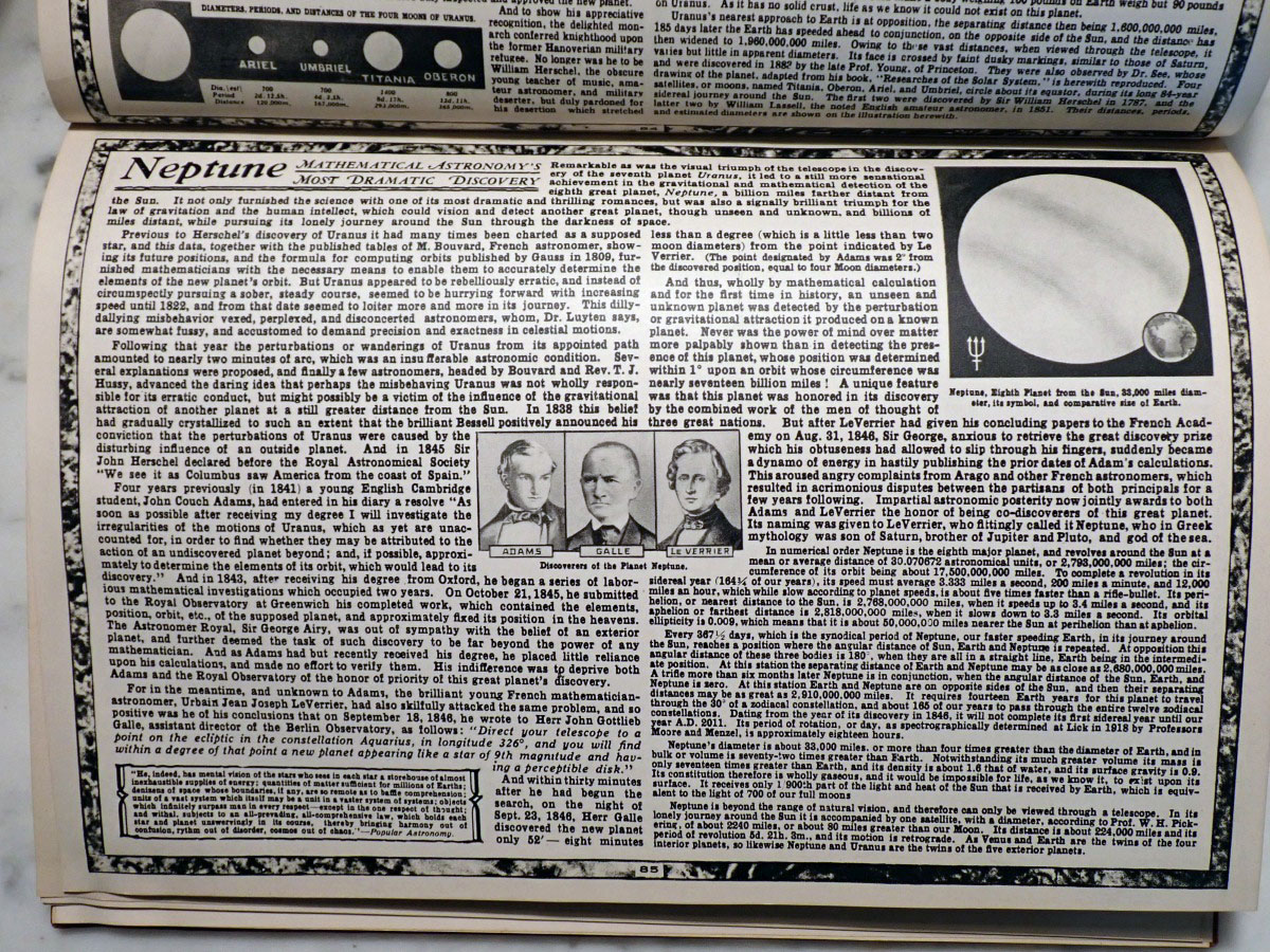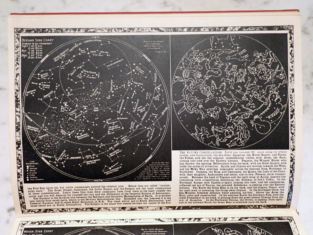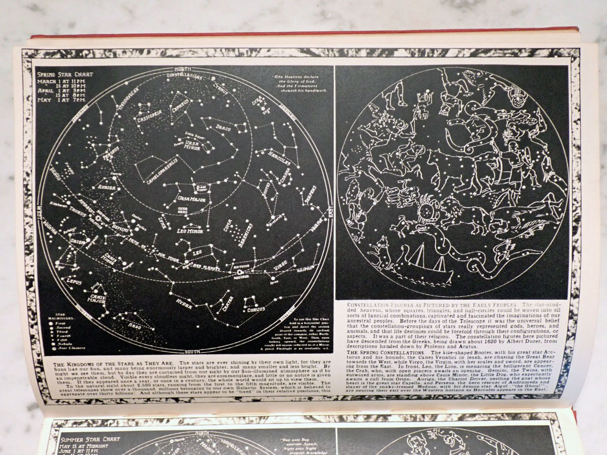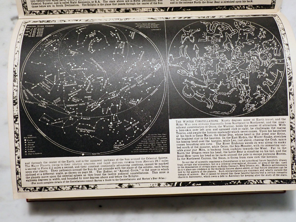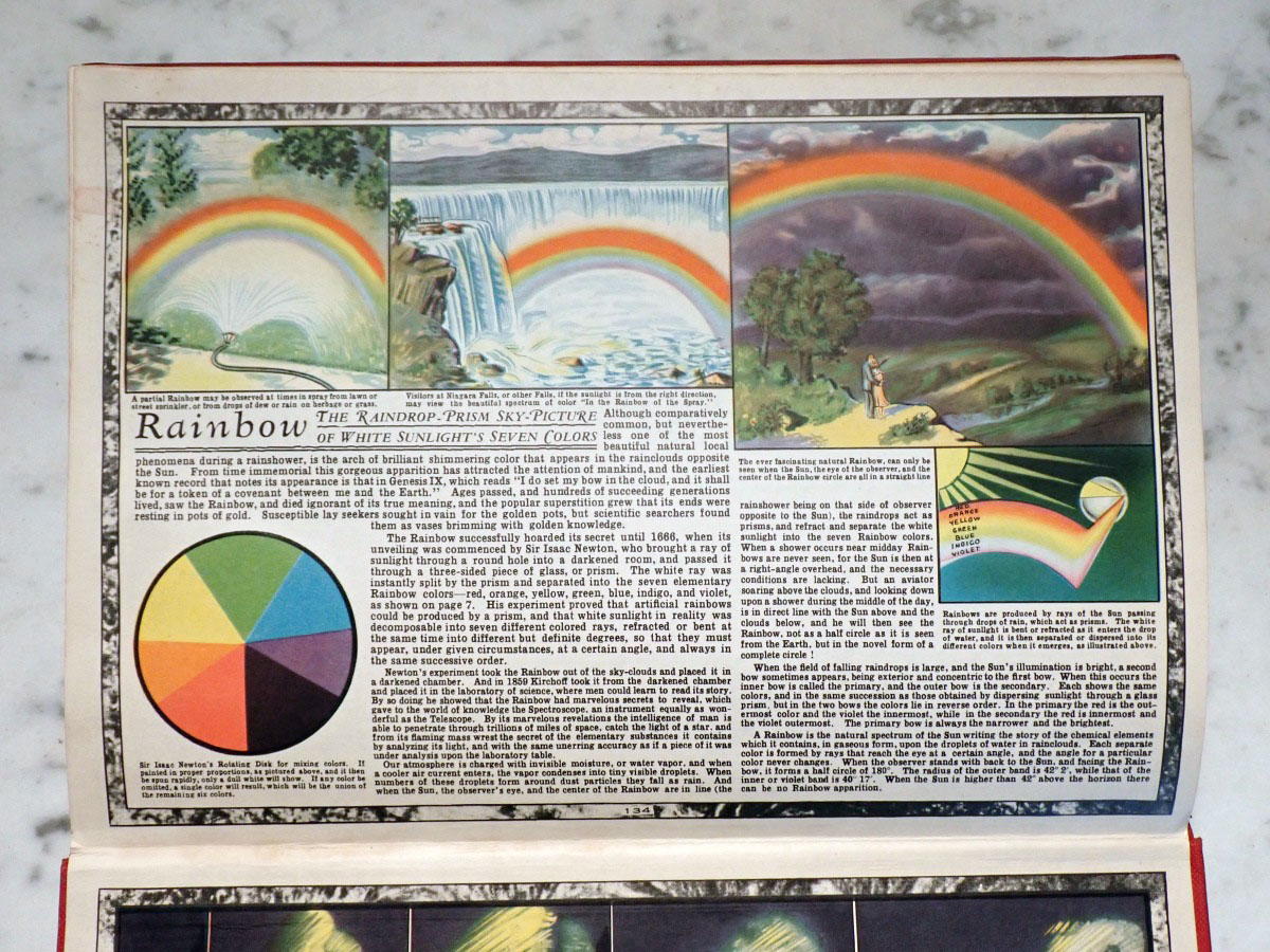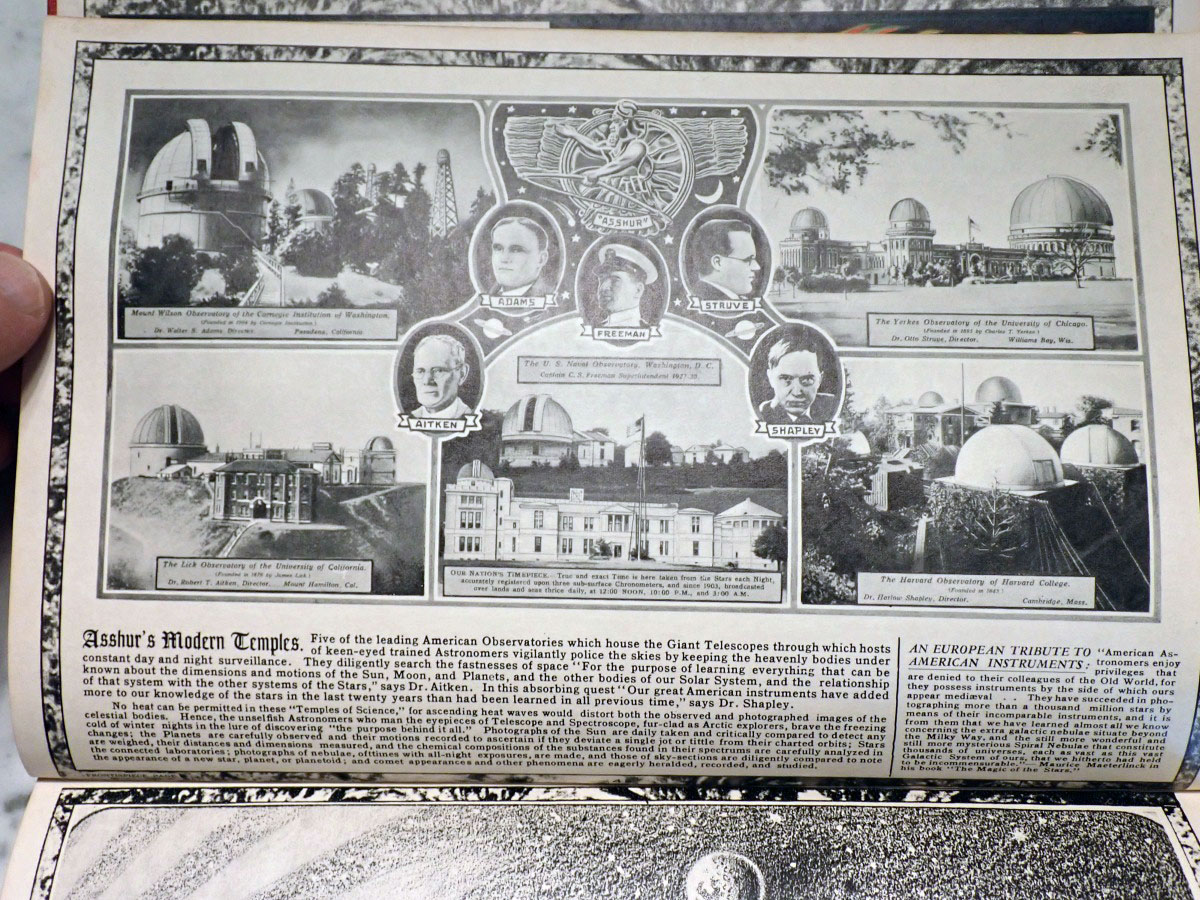 Here is an interesting astronomy picture book titled "Unveiling the Universe: Where We Are and What We Are as Told by the Telescope and Spectroscope" that was published in 1936 by Norton Wagner. The publishing company "The Research Publishers" did not waste any space in this book by filling the endpapers and flyleaves with text and pictures. The layout of this book feels much like a newspaper because the text is laid out in columns and the reader is occasionally directed to turn to another page for the continuation what they are reading. For example, the section on the spectroscope that starts on the front flyleaf continues on page 71. This book is also different in that the frontispiece starts on the front endpaper and continues on both sides of the front flyleaf. All three frontispiece parts are clearly labeled 'frontispiece' in the bottom left corners. The pagination is also a bit off in that the front endpaper is page 2. It looks like the publisher was more interested in making the book visually appealing, by maximizing the number of pictures and information within the book, than adhering to a normal book layout. Another thing about the book that is odd is the strong chemical odor throughout the pages. There are no signs that anything has ever been spilled on the book so I think the odor may be a byproduct of the printing process that was used. When I search for information on the publisher I am unable to find anything. A search for books printed by the publisher on ABE Books only turns up a couple other copies of this title so perhaps the publisher was very short lived since 1936 was at the depth of the Great Depression.