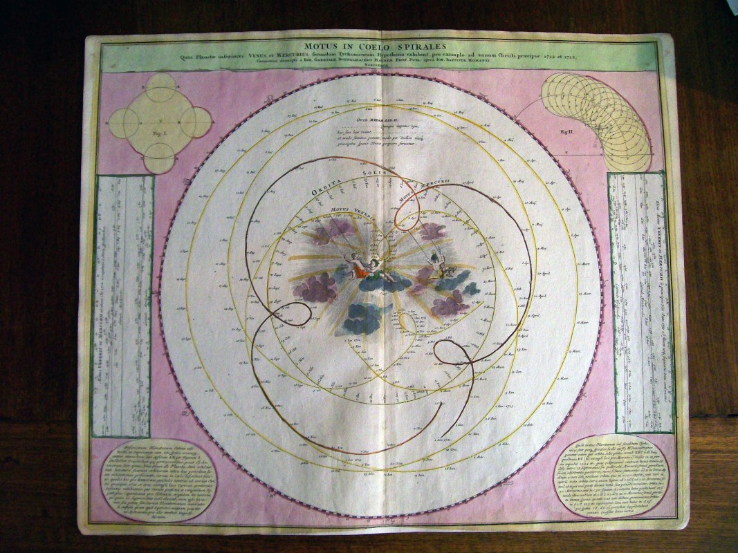 This print is titled "Motus in Coelo Spirales quos Planetae Inferiores Venus et Mercurius Secundum Tychonicorum Hypothesin Exhibent".
